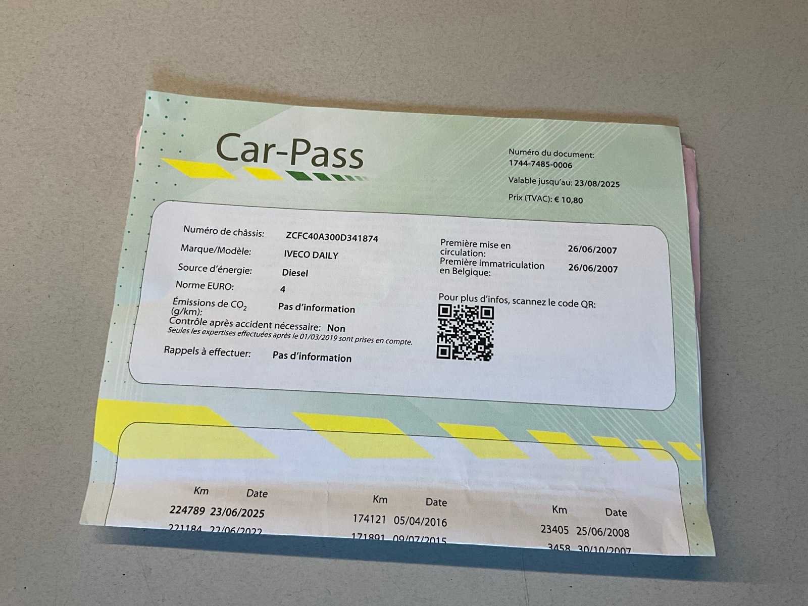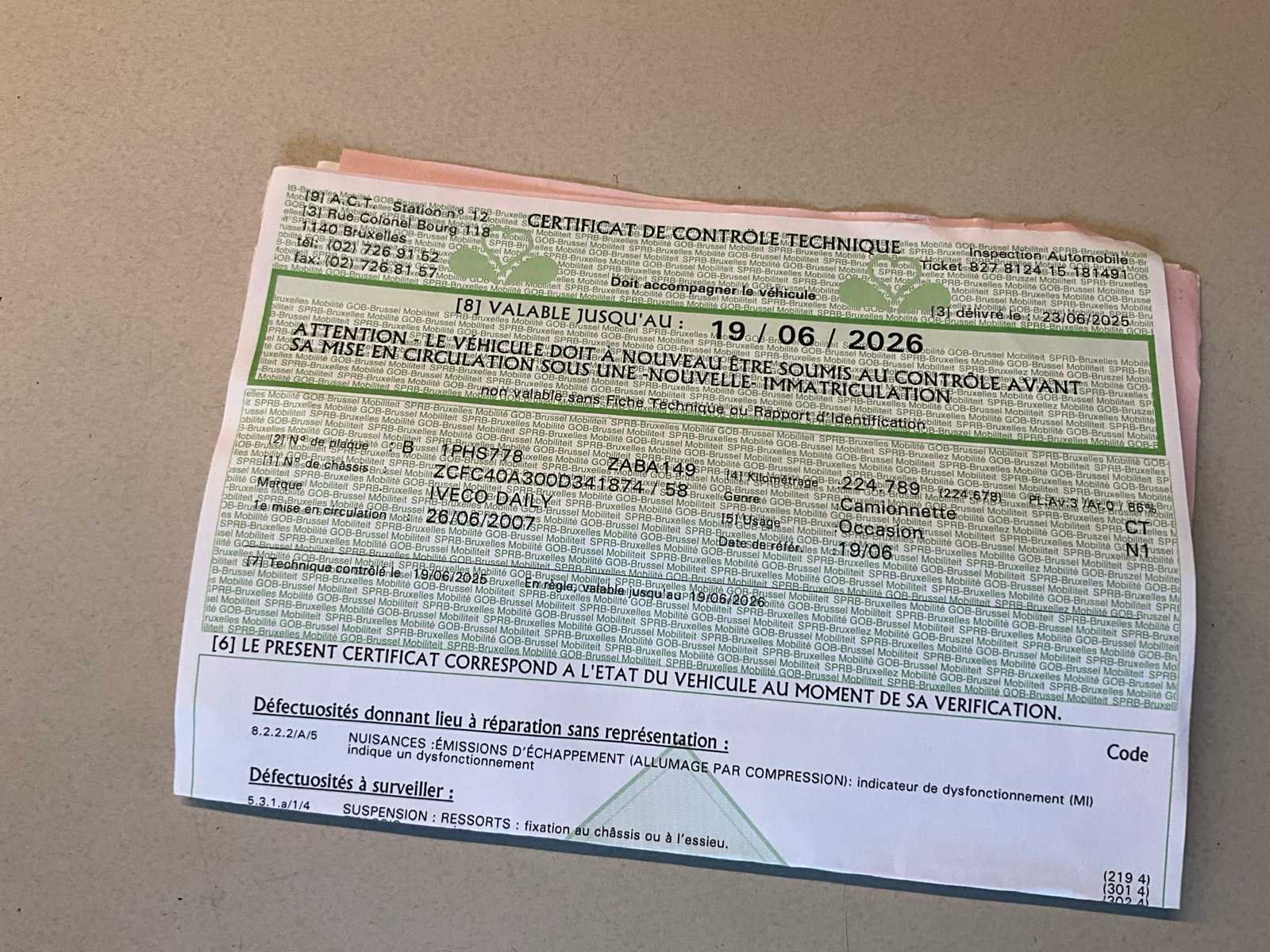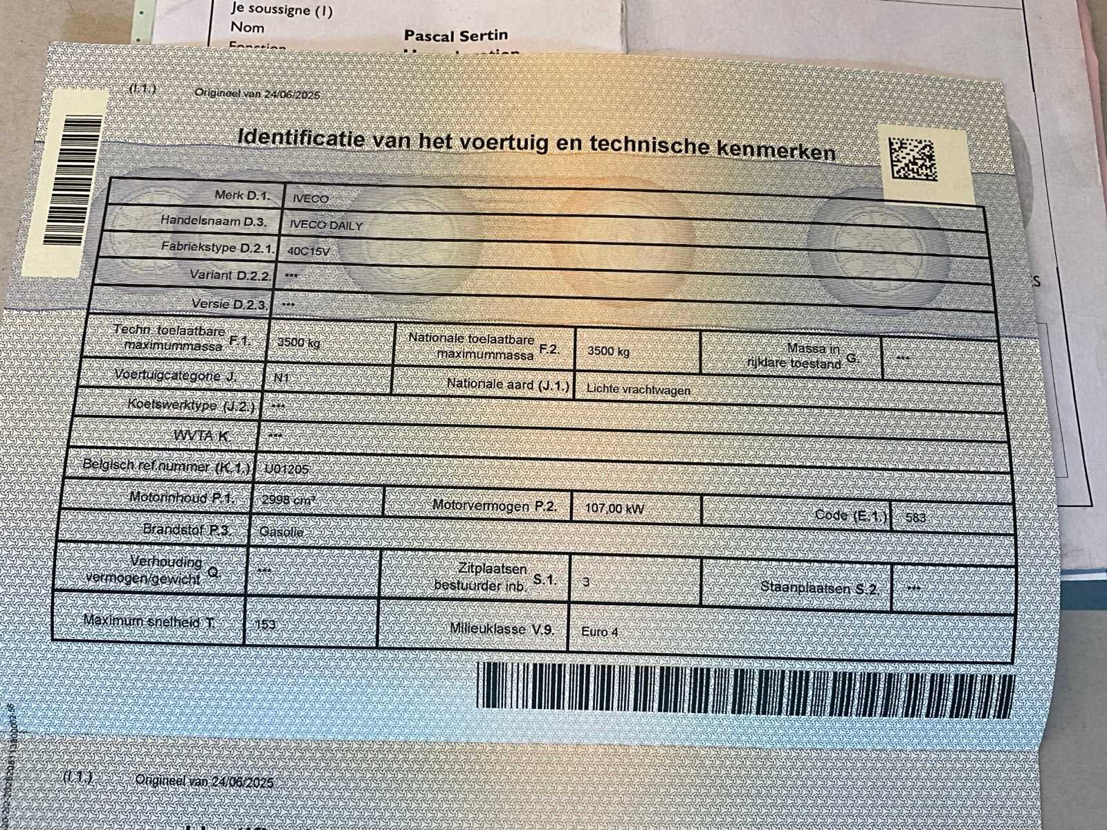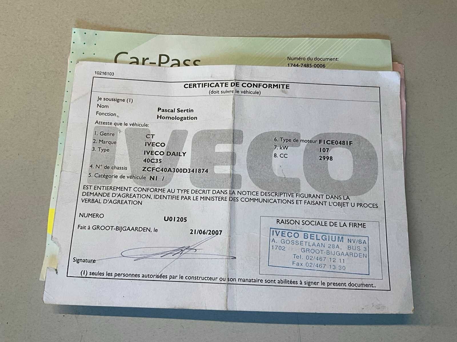Aanwezige boorddocumenten:inschrijvingsbewijs deel I en II, keuringsbewijs, conformiteitscertificaat, Car-Pass No Merk: Iveco Model: Daily Bouwjaar: 2007 Afgelezen kilometerstand: 225239km Cilinderinhoud: 2998cc Vermogen (kW): 107kW Brandstof: diesel Chassisnummer: ZCFC40A300D341874 Datum eerste toelating: 26/07/2007 Aantal zitplaatsen: 3 Transmissie: Handgeschakeld Emissieklasse: Euro4 Aantal deuren: 2 Aantal sleutels: 1 Nationaliteit documenten: Belgische Carpass: true Start en rijdt: Ja Keuringsrapport geldig tot: 19/06/2026 startinformatie : Start en rijdt Zichtbare schade: Zie foto’s Vavato voert geen technische keuring uit.: true Inschrijvingsbewijs - deel 1 : Aanwezig Inschrijvingsbewijs - deel 2: Aanwezig