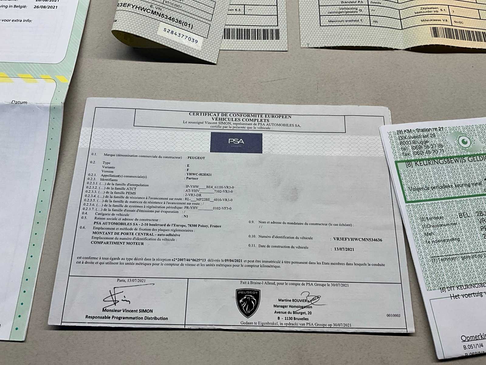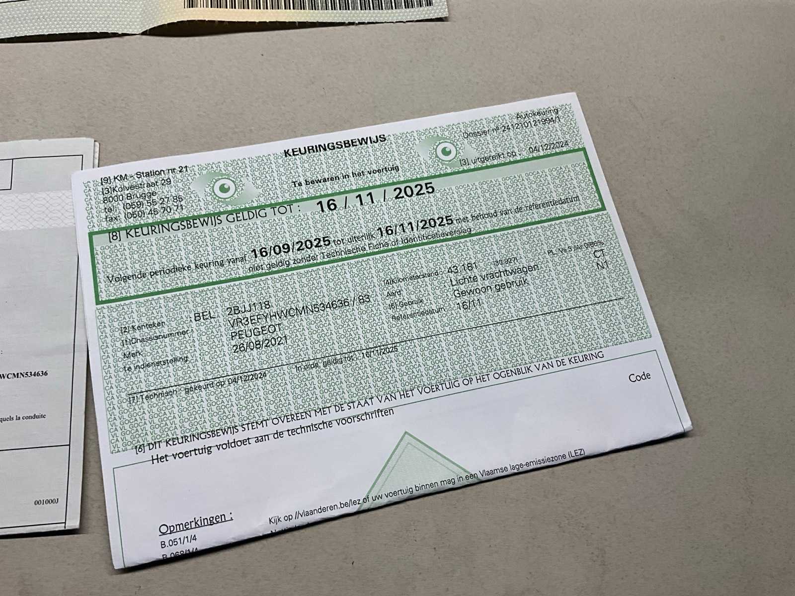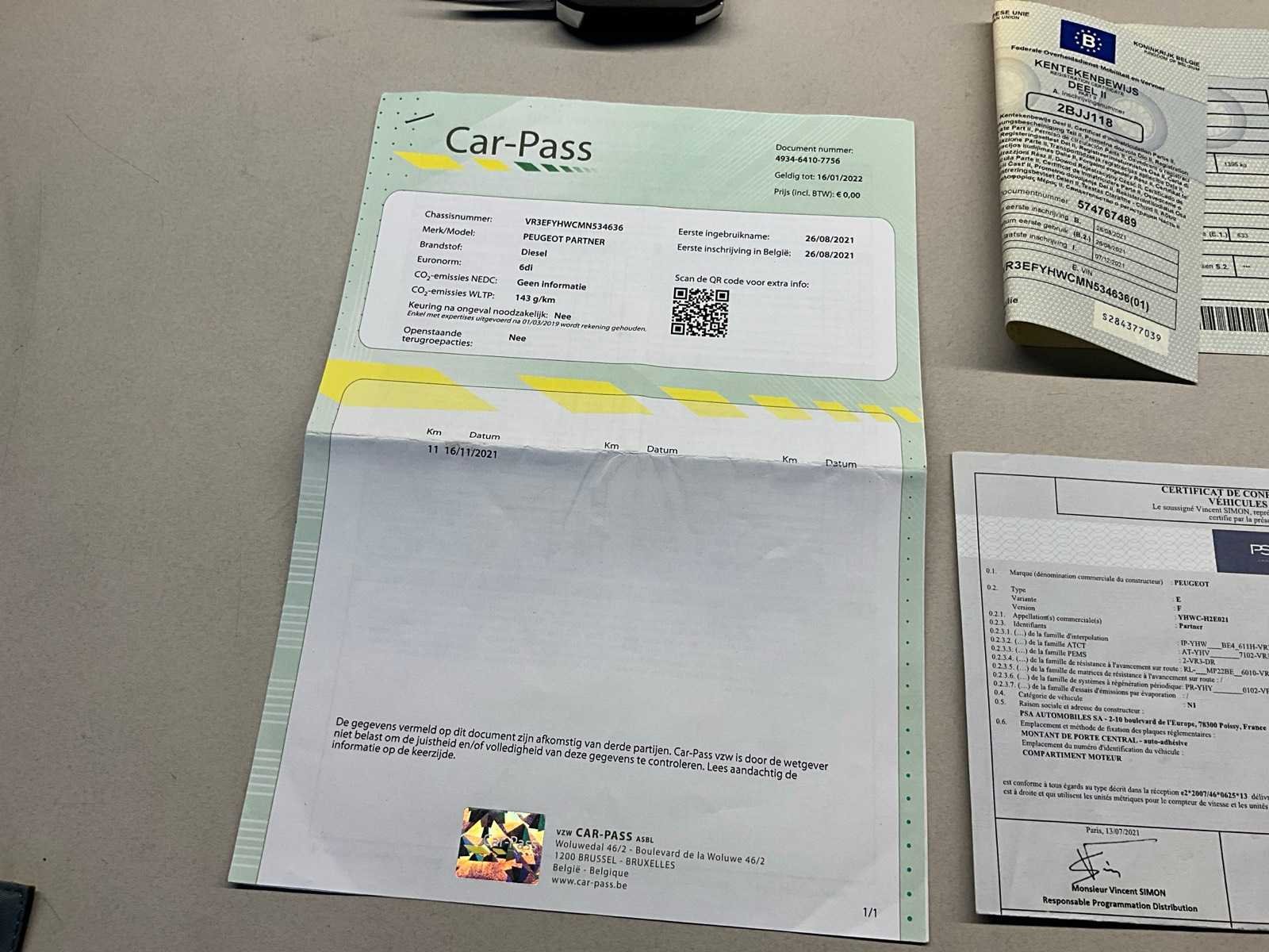 Aanwezige boorddocumenten:inschrijvingsbewijs deel I en II, car pass, keuringsbewijs, conforliteitsattest, identificatieverslag Nee Merk: Peugeot Type: Partner Bouwjaar: 2021 Afgelezen kilometerstand: 50554km Cilinderinhoud: 1499cc Vermogen (kW): 56kW Brandstof: diesel Chassisnummer: VR3EFYHWCMN534636 Datum eerste toelating: 26/08/2021 Aantal zitplaatsen: 3 Transmissie: Handgeschakeld Emissieklasse: 6d-ISC Aantal deuren: 2 Aantal sleutels: 2 Nationaliteit documenten: Belgisch Gelijkvormigheidsattest aanwezig: true Carpass: true Start en rijdt: Ja Keuringsrapport geldig tot: 16/11/2025 startinformatie : Start en rijdt Vavato voert geen technische keuring uit.: true Inschrijvingsbewijs - deel 1 : Aanwezig Inschrijvingsbewijs - deel 2: Aanwezig