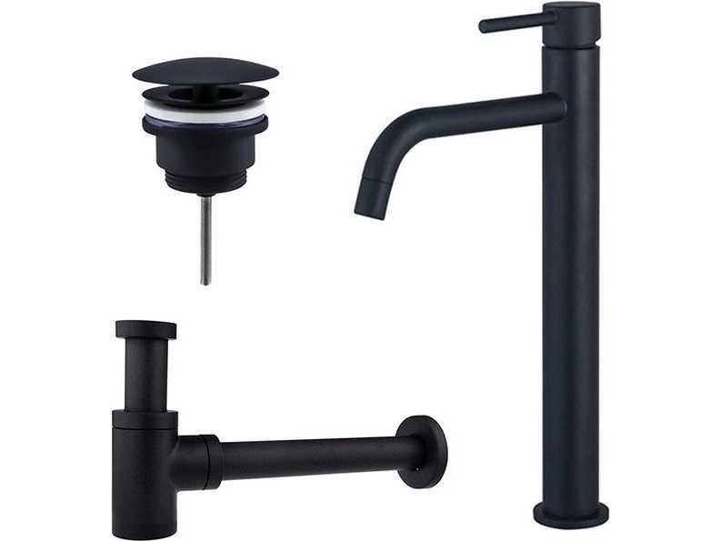 Wastafelkraanset - verhoogde wastafelkraan - always open plug - verlaagde design sifon - mat zwart