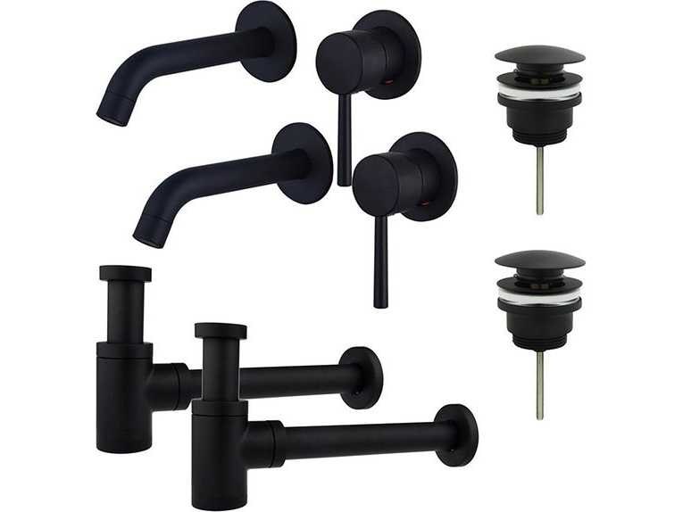 Wastafelkraanset - voor dubbele wastafel - inbouw wastafelkraan - klikwaste plug - verlaagde design sifon - mat zwart