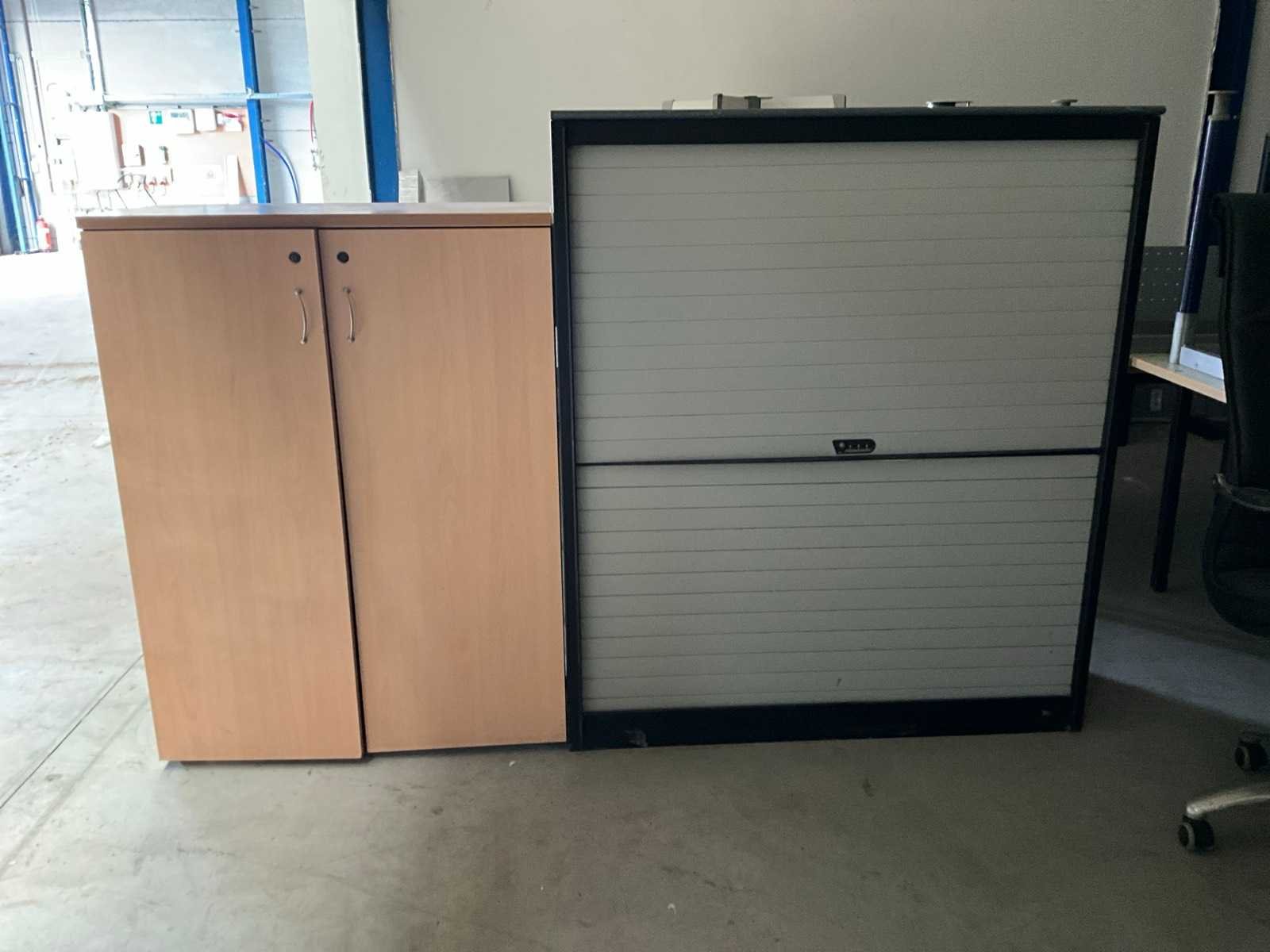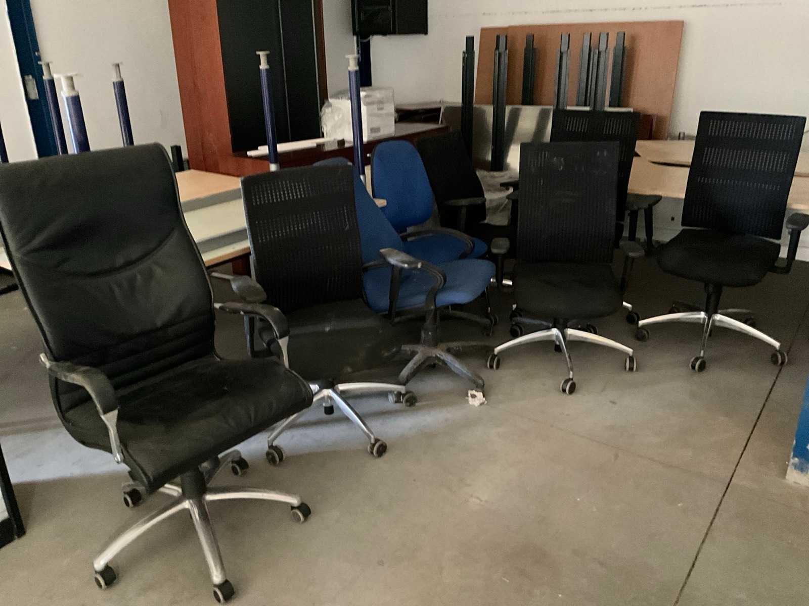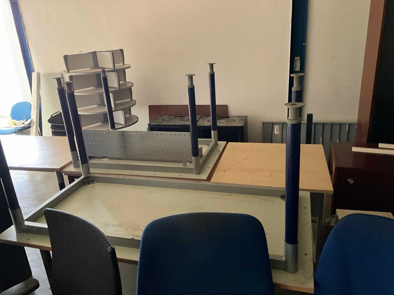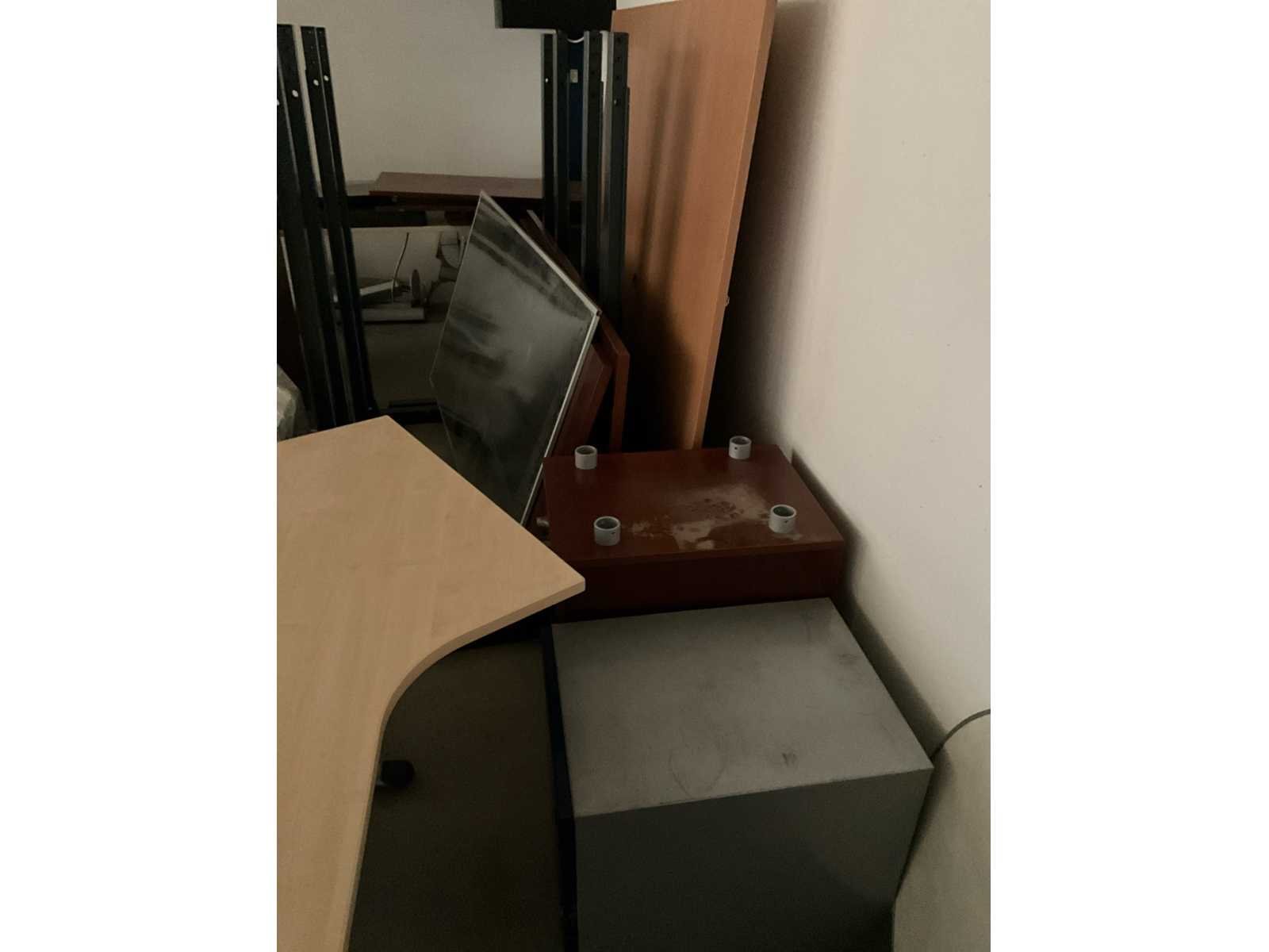 Ca. 16 tafels/buros, 8 bureaustoelen, 6 ladeblokken, 4 kasten, 1 dossierstandaard en diversen. Nee