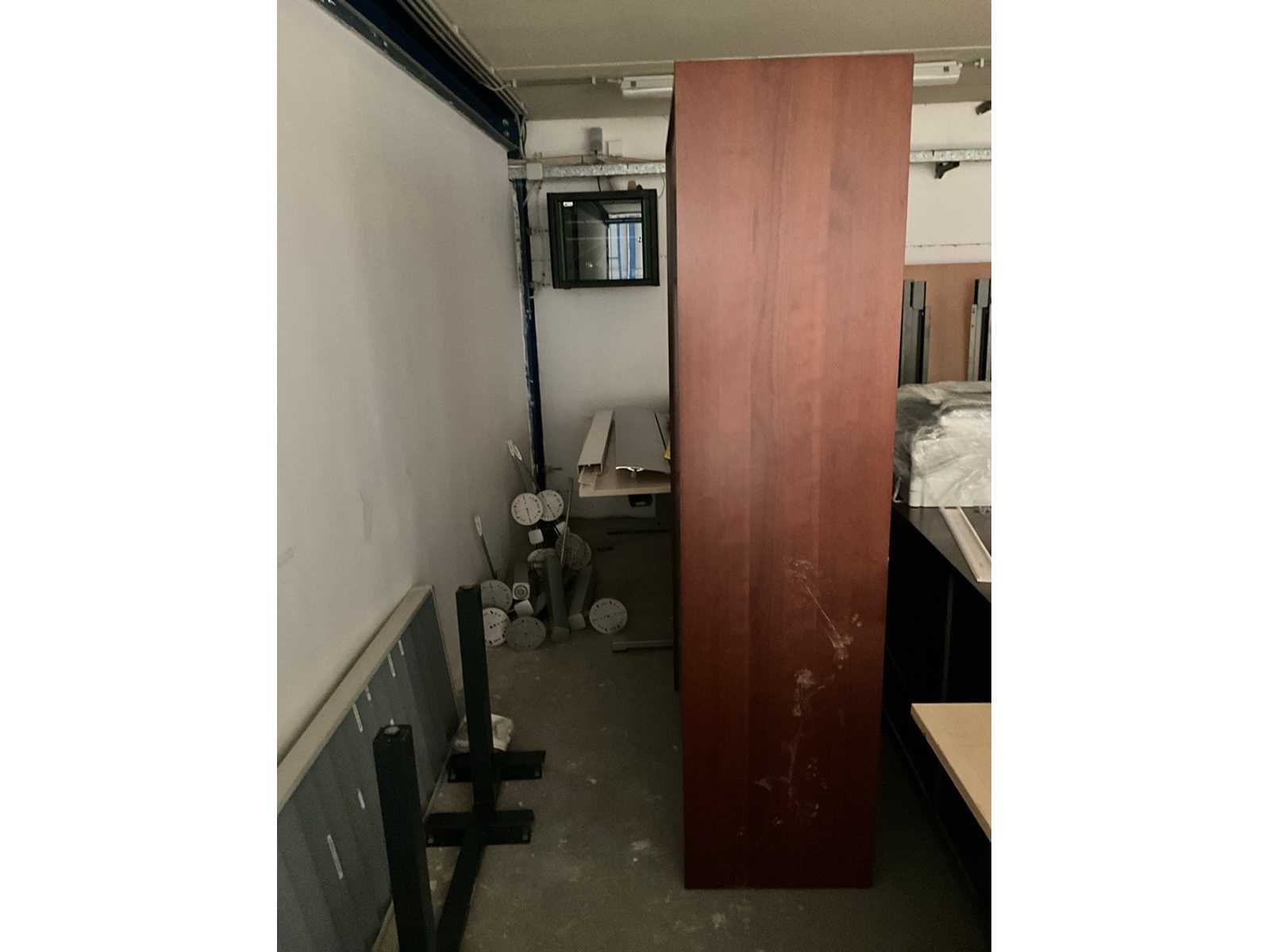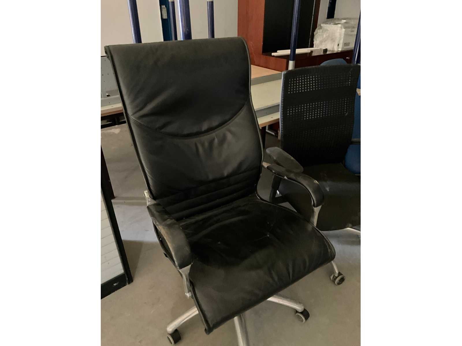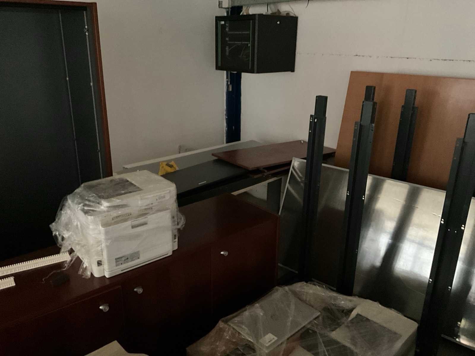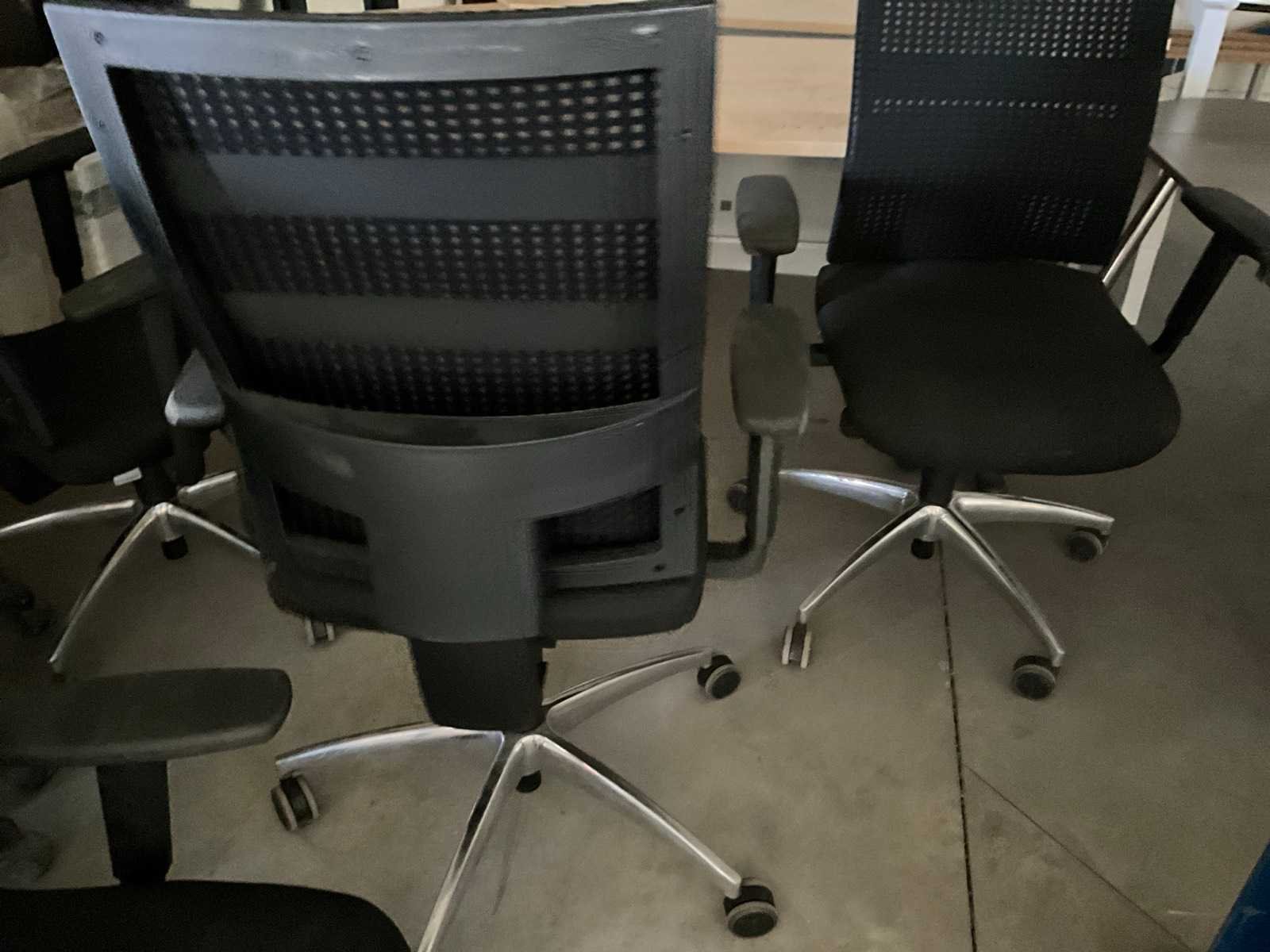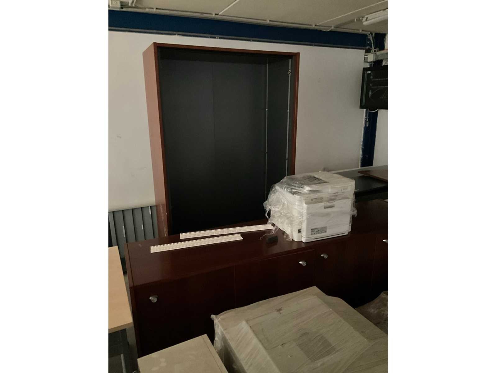 Ca. 16 tafels/buros, 8 bureaustoelen, 6 ladeblokken, 4 kasten, 1 dossierstandaard en diversen. Nee