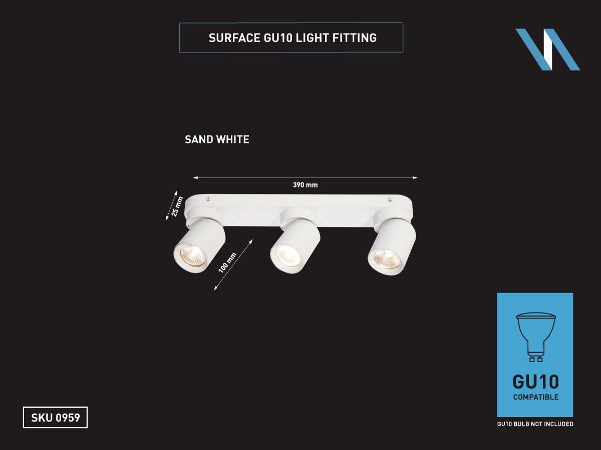 Afdichting IP20, product kleur zand wit, afm. Ø 60 x 100mm, afm wandhouder 390 x 60 x 25mm, draaibaar 350° en kantelbaar 50°, materiaal aluminum en ijzer, bevestiging inclusief, fitting GU10, bulb niet inbegrepen, geschikt voor binnen, 3 x bulb invoer, voltage 220-240V, max 40 watt, SKU 00959 No Merk: LAMPINNO Product type: Binnen Verstelbaar: true Fitting: GU10 Kleur: Wit Lengte: 39.0cm Breedte: 6.0cm Hoogte: 10.0cm Materiaal: Aluminium