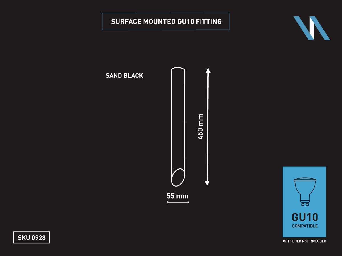 Afdichting IP20, product kleur zand zwart, afm. Ø 55 x 450mm,bevestiging inclusief, materiaal aluminium, fitting GU10, bulb niet inbegrepen, geschikt voor binnen, een bulb invoer, voltage 220-240V, SKU 0928 No Merk: LAMPINNO Product type: Binnen Fitting: GU10 Kleur: Zwart Lengte: 45.0cm Breedte: 5.5cm Materiaal: Aluminium
