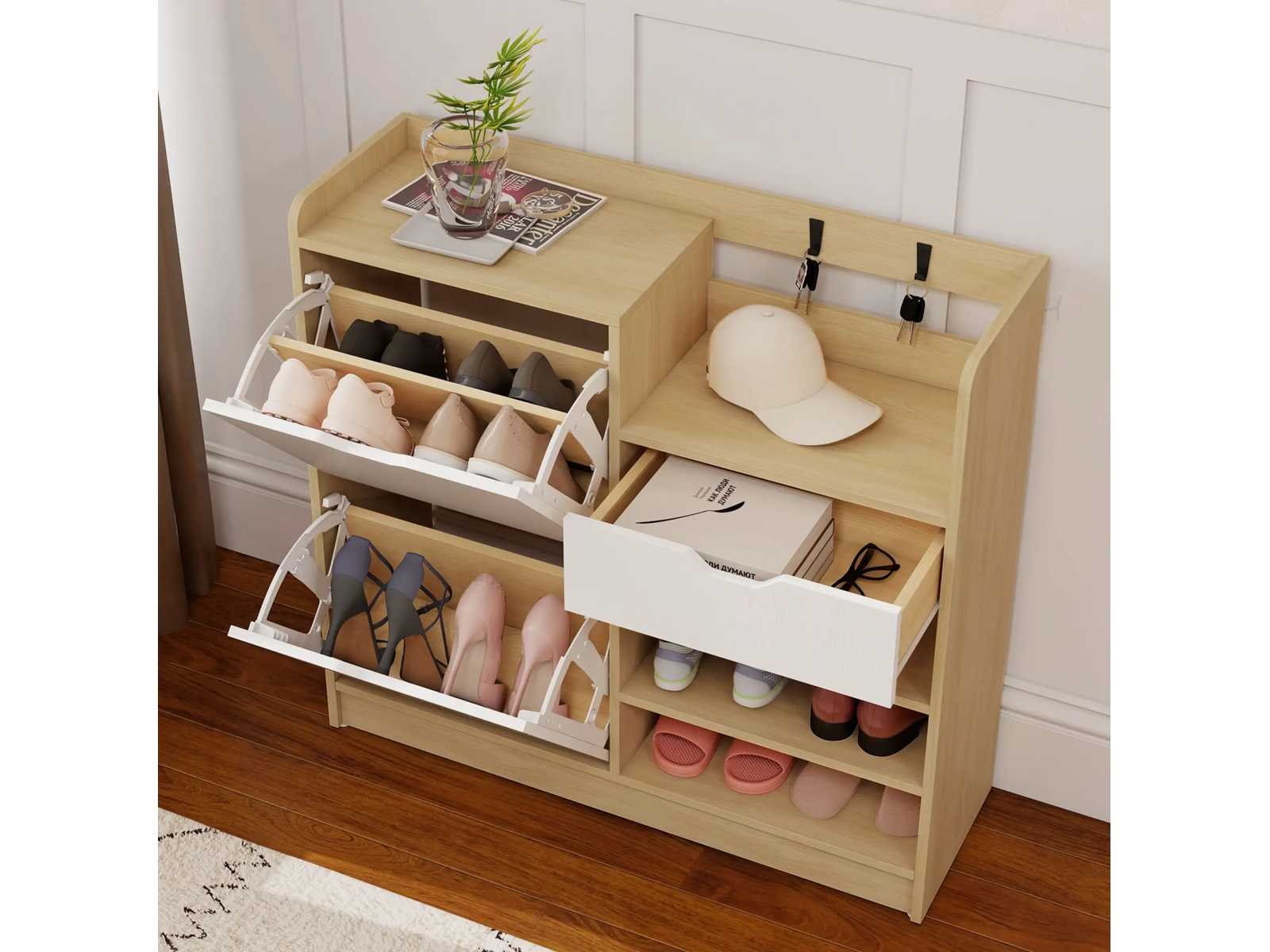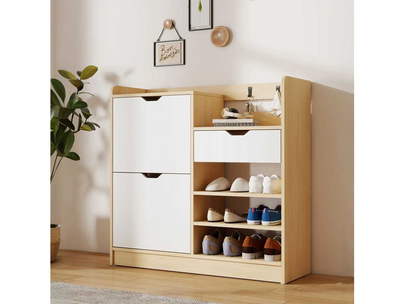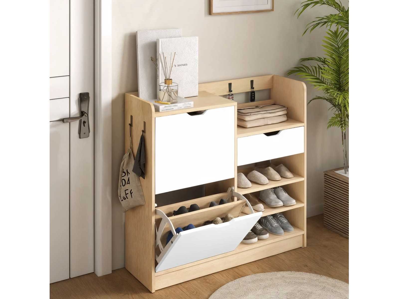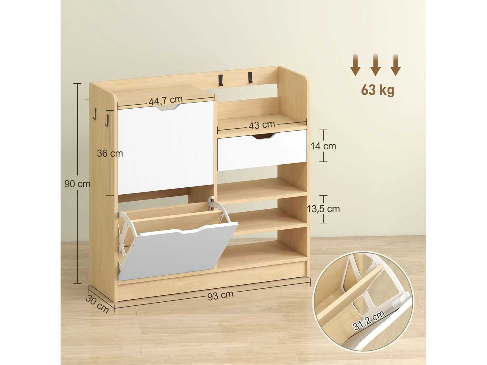 Specificaties: - Kleur: Natuur+Wit - Materiaal: Spaanplaat - Totale afmetingen: 93B x 30D x 90H cm - Bovenste linker plankgrootte: 46,5B x 28D x 4,5H cm - Afmetingen van de opvouwbare lades: 43B x 31,2D cm (elk) - Bovenste rechter plankgrootte: 43B x 26,5D x 7H cm - Ladeafmetingen: 37,5B x 23,5D x 7H cm - Laag open plankformaat: 43B x 30D x 13,5H cm (elk) - Maximale schoenmaat: 44-45 EU - Laadcapaciteit: 63 kg (totaal), 10 kg (boven), 5 kg (opvouwbare lade/plank), 3 kg (lade) Non