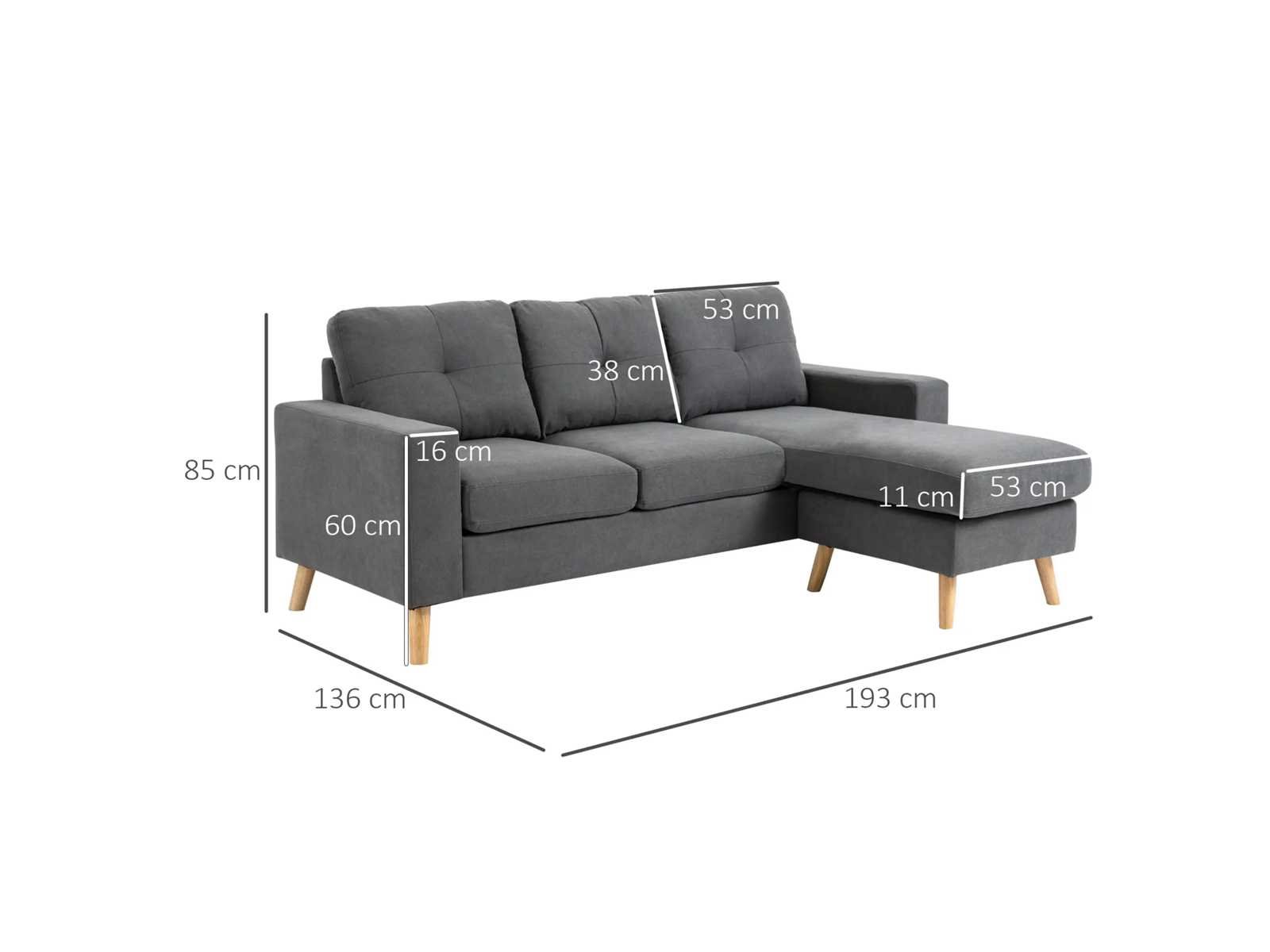 Specificaties: - Materialen: Rubberhout, Linnen (100% polyester), Schuim - Kleur: Donkergrijs - Totale afmetingen: 193B x 136D x 85H cm - Rugleuningafmetingen: 161B x 38D x 10H cm - Zitafmetingen: 161B x 44D x 47H cm - Chaise Longue: 53L x 50D x 47H cm - Draagvermogen: 200 kg Non