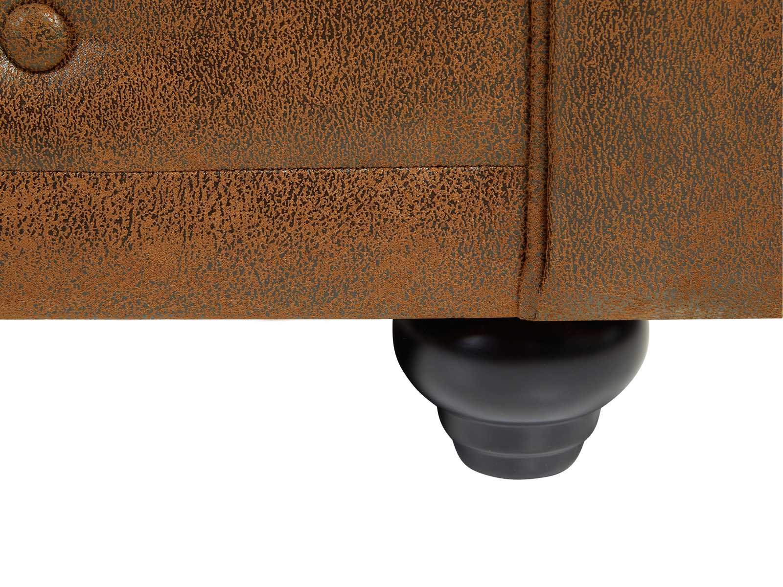 Kenmerken Kleur (tint): Bruin Materiaal: 100% polyester, microvezel Materiaal (Basis): Hout Structuur: Hout, multiplex Afwerking: Getuft, Rijp Modeltype: Chesterfield Aantal zetels: 3 zetels Opties: Verwijderbare hoes Verwijderbaar onderdeel: Zitting Zitbekleding: Polyurethaanschuim Zitdichtheid: 25 kg/m³ Stoelvering: kruis-kruis elastische banden, schroefveren Rugleuning: Polyurethaanschuim Rugleuningsdichtheid: 22 kg/m³ Rugleuningophanging: Vergrendelende elastische banden Met armleuningen Maximale ondersteunde belasting: 360 kg Geassembleerd geleverd (behalve voeten en/of handgrepen) Afmetingen Lengte: 205 cm Hoogte: 72 cm Diepte: 88 cm Zithoogte: 42 cm Zitdiepte: 62 cm Non