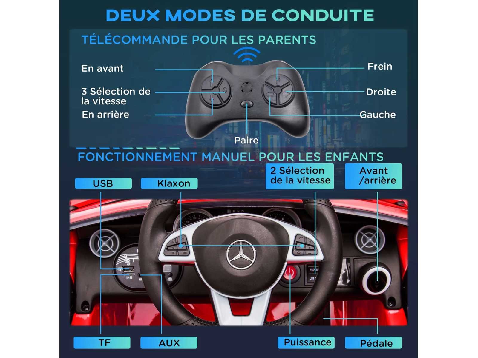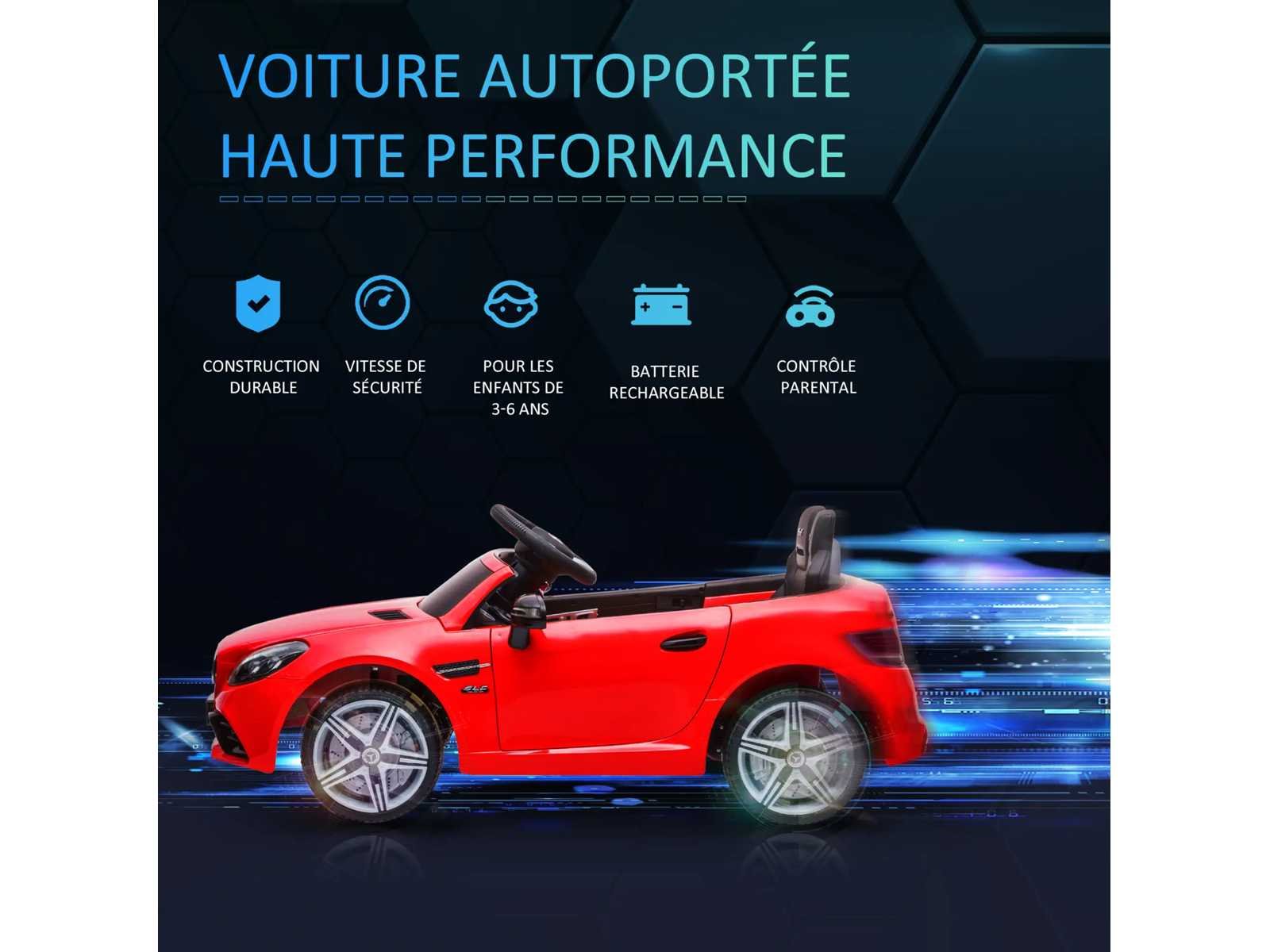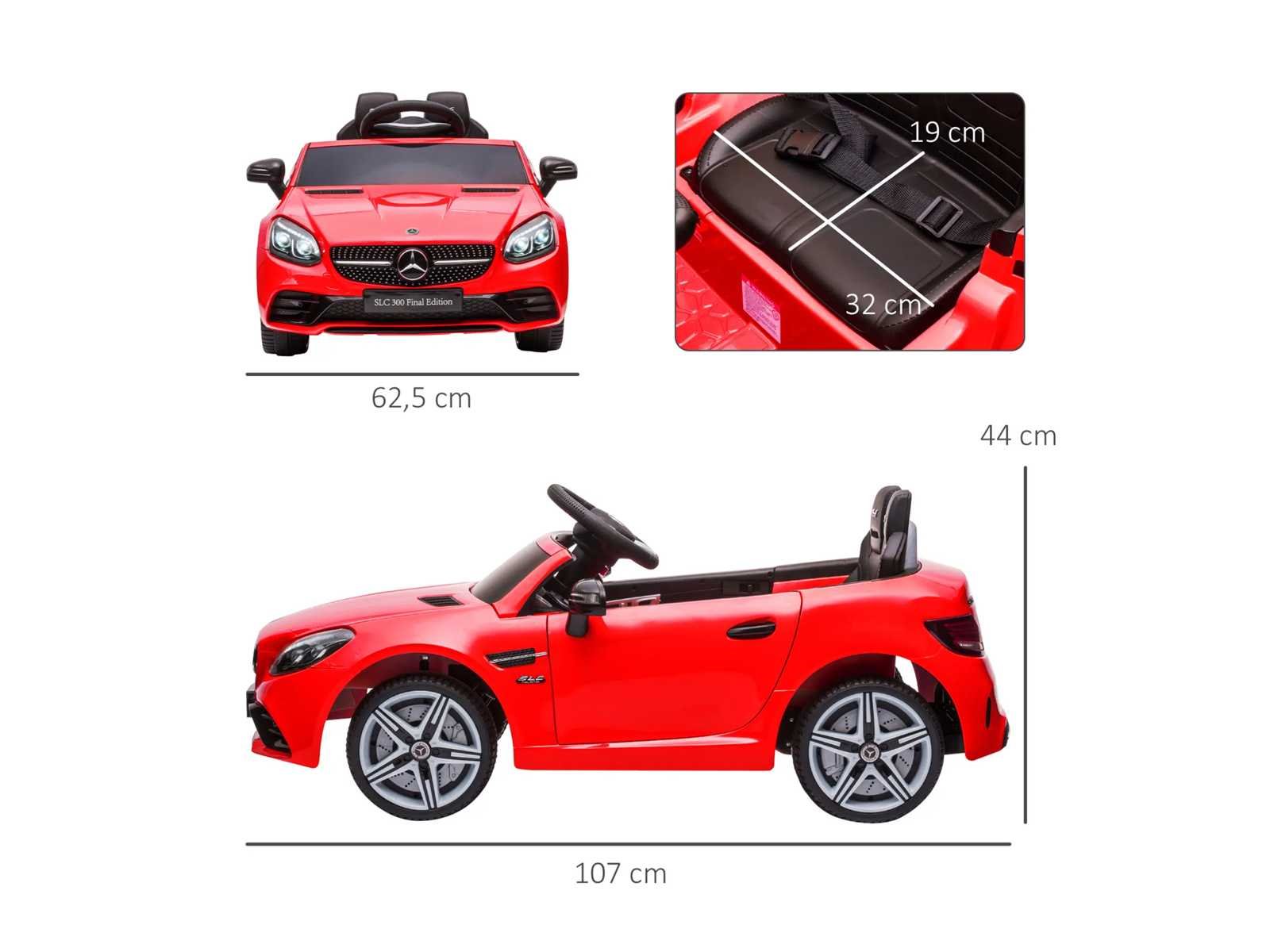 - Je kind zal aangetrokken worden door het ontwerp en de vele kenmerken van deze auto: mooie lijnen, deuropening, enzovoort. - Talrijke geluids- en lichteffecten voor het plezier van uw kind: LED-koplampen, autoachterlicht, muziek, claxon, USB-poort, TF-kaartnotch, aux-uitgang, enzovoort. - 8 ingebouwde liedjes en 7 verhalen voor meer plezier - 12V motor, hij kan 40 minuten draaien nadat hij volledig is opgeladen - Vooruit en achteruit om alle mogelijke manoeuvres met instelbare snelheid uit te voeren (2 versnellingen om uit te kiezen, 3 of 5 km/u) - Elektrische auto, ouderlijk afstandsbediening 2,4 G om het voertuig te controleren indien nodig Specificaties: - Kleur: rood - Materialen: PP, metaal - Sun. totaal: 107L x 62,5B x 44H cm - Sun. zitplaats: 32 breed x 19 duimbreed x 20 cm (boven de grond) - Wieldiameter: 19 cm - Eerste lading: 8-9 uur. Normaal opladen: 10-12 uur - Batterijduur: 40 minuten (afhankelijk van het type gebruik) - Snelheid: 3-5 km/u - Batterij: 6V 4,5AH x 2 - Afstandsbedieningsafstand: 20 m - Aanbevolen maximale belasting: 30 kg - Certificering: EN 71-1-2-3, EN 62115 Non
