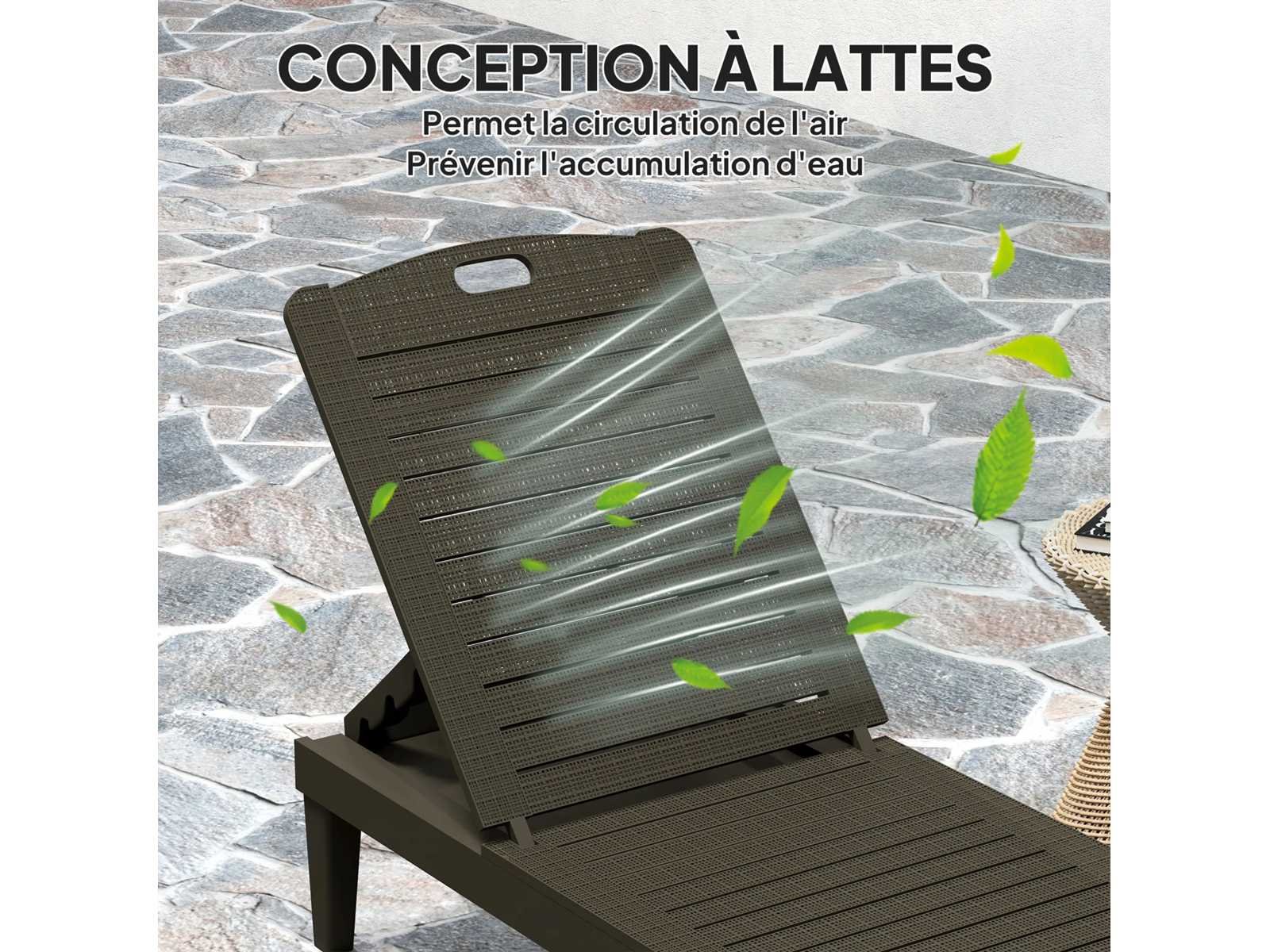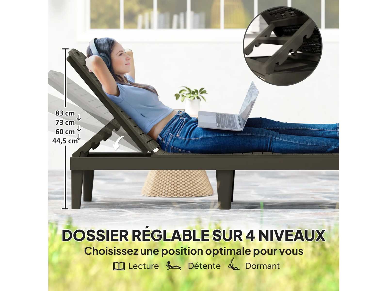 Specificaties: - Kleur: zwart - Materiaal: plastic - Totale afmetingen: 56B x 187D x 28H cm - Ligoppervlak: 56B x 187D x 28H cm - Zitafmetingen: 56B x 124D cm - Zithoogte: 28 cm (zonder kussen) - Rugleuningafmetingen: 63L x 56B cm - Rugsteunhoogte: 44,5/60/73/83 cm (vanaf de vloer) - Aanbevolen maximale belasting: 120 kg Non