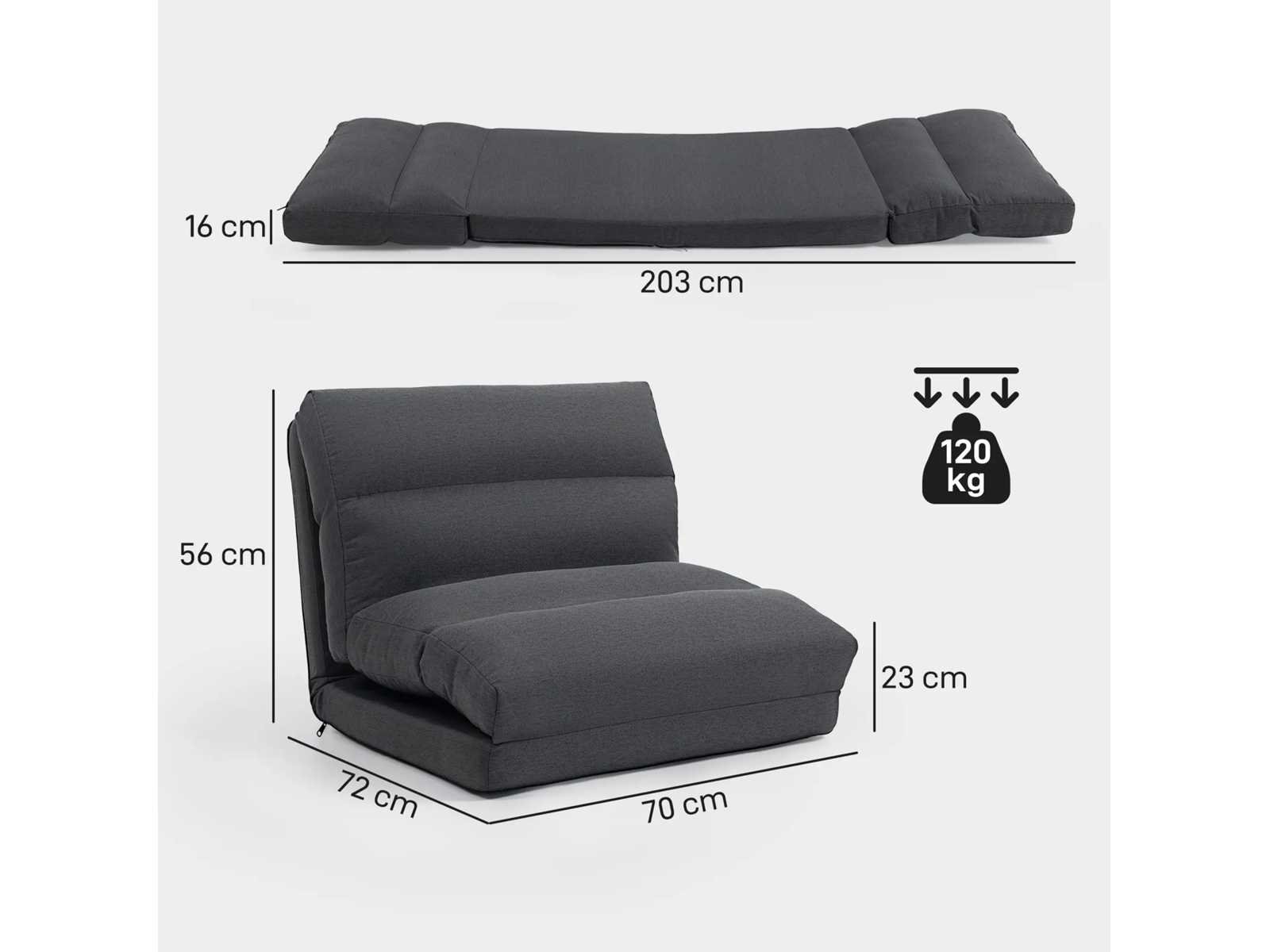 Specificatie: Kleur: Donkergrijs Materiaal: linnen look (100% polyester), schuim, metaal Stoelafmetingen: 70 cm (breedte) x 72 cm (hoogte) x 56 cm (hoogte) Bedafmetingen: 70 cm (breedte) x 203 cm (dikte) x 16 cm (hoogte) Zitafmetingen: 70 cm (breedte) x 41 cm (dikte) x 23 cm (hoogte) Zitdikte: 16 cm Laadvermogen: 120 kg Non