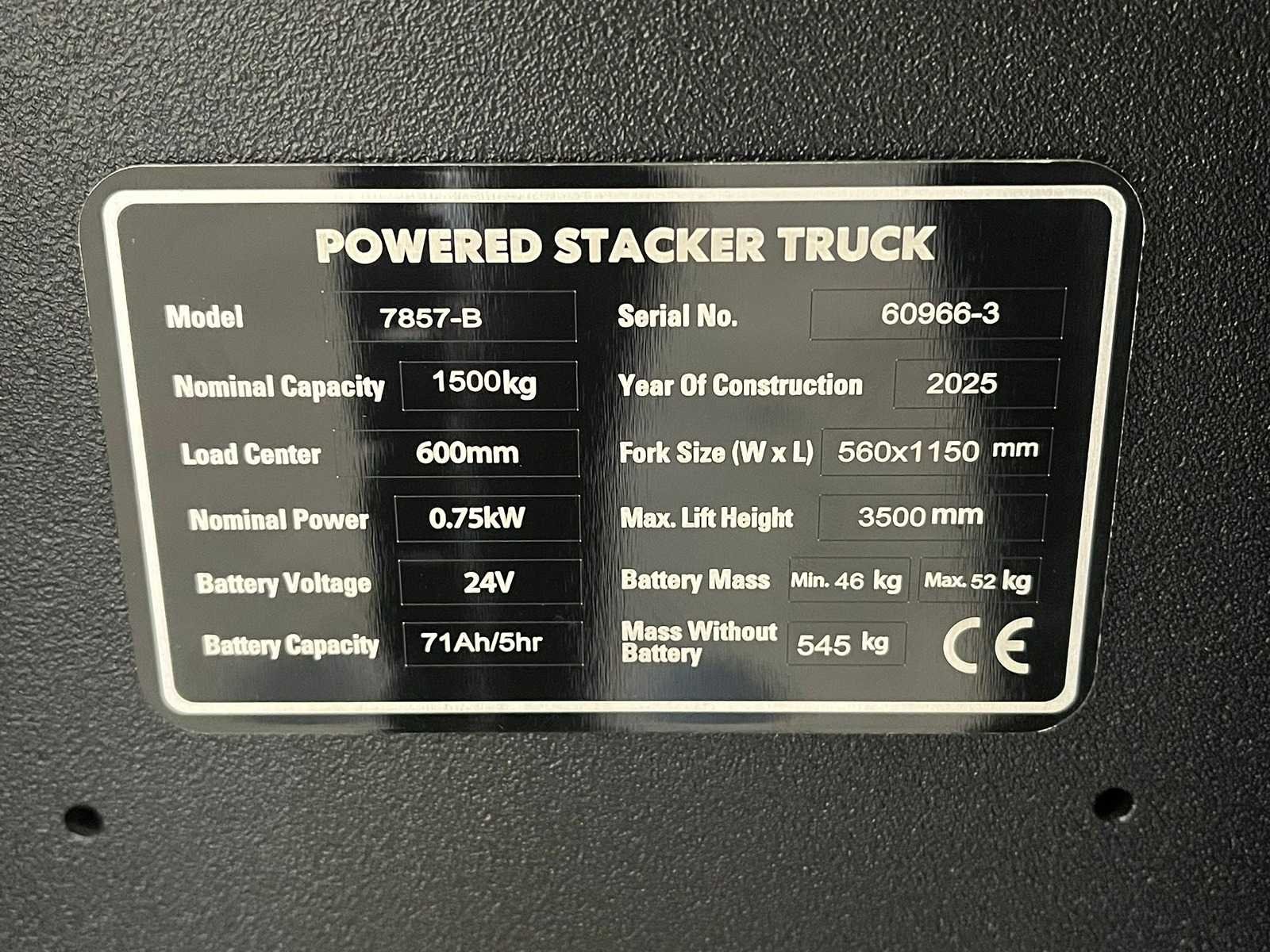 Interne lader; noodstop; batterij percentage; dubbele ketting; noodknop; load center 600mm; nominal power 0,75kW; Battery voltage 24V; 71Ah/5hr; lepelgrootte 560x1150mm Nee Merk: RTE Type: 7857-B Bouwjaar: 2025 Hefvermogen: 1500kg Hefhoogte: 3500mm Lepellengte: 1150mm Eigen gewicht: 597kg Minimale doorrijhoogte: 2240mm Totale afmeting L: 1750mm Totale afmeting Breedte: 850mm Totale afmeting Hoogte: 2240mm