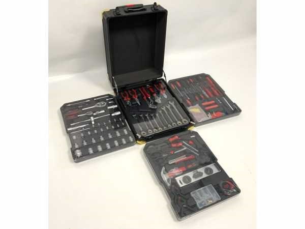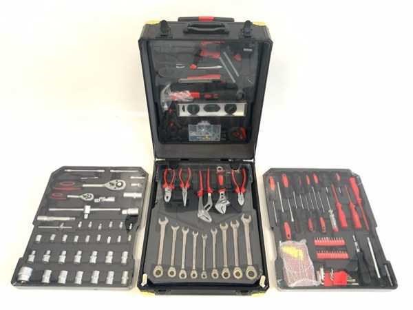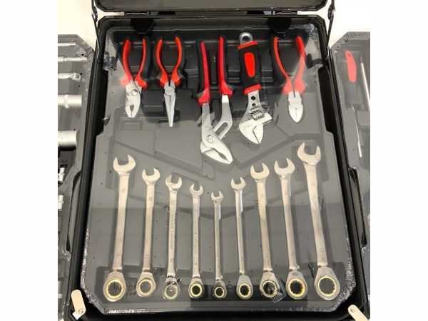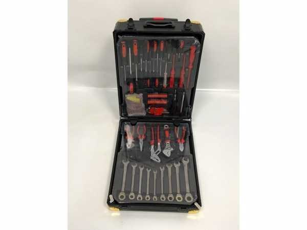 W.o. steek- ringsleutel met ratel; diverse tangen; doppenset met ratel; diverse schroevendraaiers; precisieschroevendraaiers; inbussleutel; diverse bits; klauwhamer; krimptang; schaar; rolmaat; waterpas; hetelijmpistool; kunststof klemmen; tapijtmes; 2161; Nee Type: 186 delig Kunststof: false Aluminium: true Canvas: false Met inhoud: true Afmeting l: 210mm Afmeting b: 370mm Afmeting h: 520mm