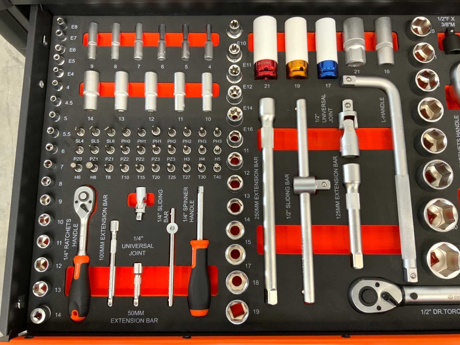 267 delig; 13 lades waarvan 11 lades gevuld; 12 tangen; 12 hamers; 8 Files ; 6 zeshoek sleutels; 6 T-Handle ; 21 schroevendraaiers; 40 steeksleutels; 10 imbus sleutels; 127 doppen en bitjes; 25 sleutels ; houten werkblad; verrijdbaar; remmen; 2 delen afsluitbaar; 5595 Nee Merk: Daewoo Model: DAMWS267 Type: 267 delig Lengte: 106cm Breedte: 57cm Hoogte: 110cm