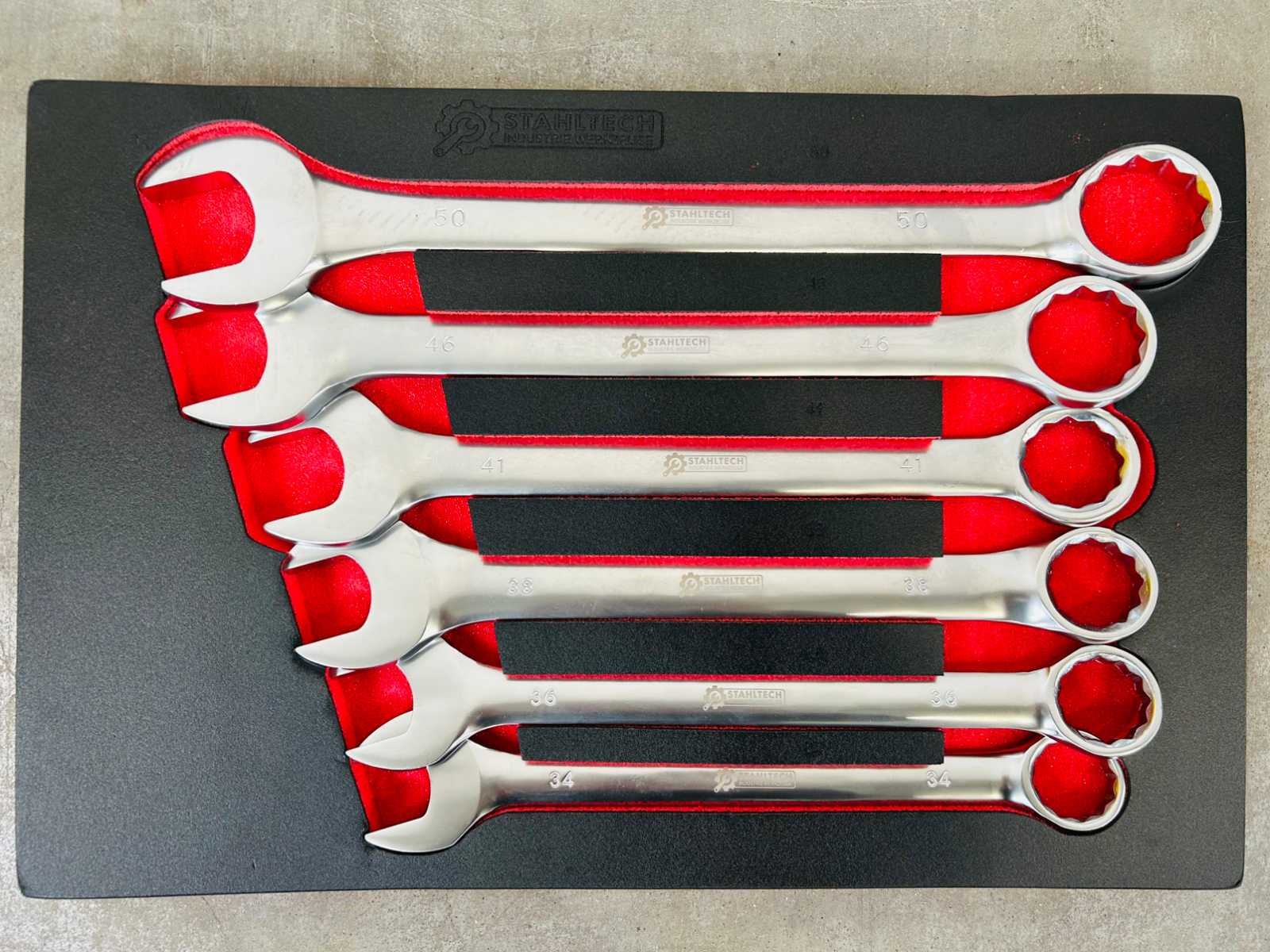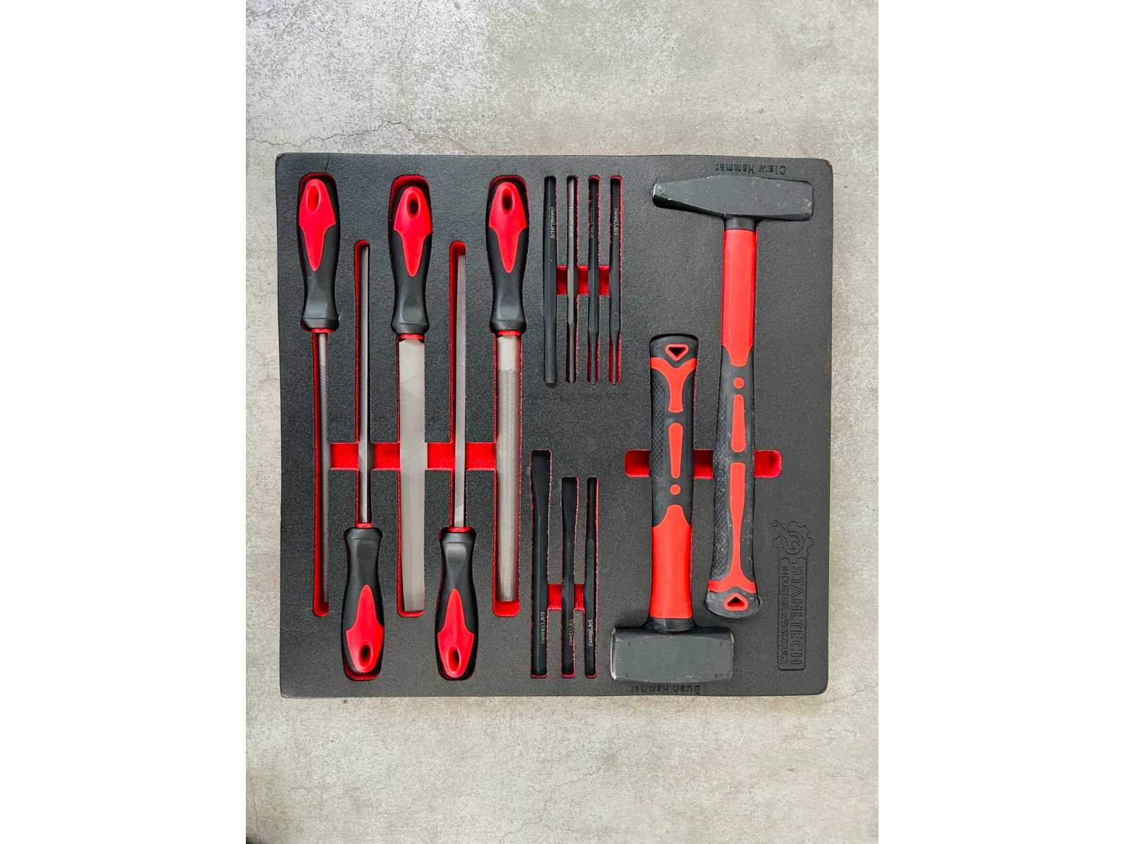 Ongebruikt; gereedschap in plastic verpakt; 12-delig tangenset; 13-delig hamerset; 14-delig meetset; 36-delig slagmoersleutel set; 21-delig sleutels met T-greep; 41-delig schroevendraaierset; 29-delig combinatiesleutels; 12-delig ringsleutels; 125-delig doppenset; 84-delig bitjes set; 7483 Nee Merk: Stahltech Type: 387-delig Lengte: 148cm Breedte: 52cm Hoogte: 110cm