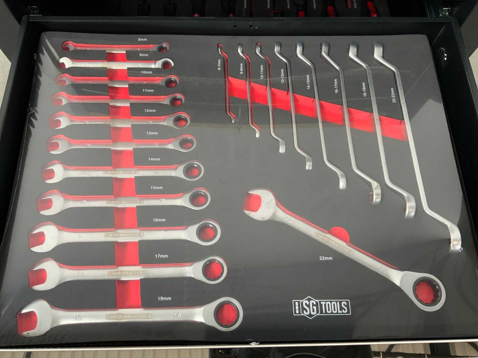 258 delig; schroevendraaiers; bitset; tangen; sleutels; etc; zwenkwielen met rem; 7 lades; 6 gevuld; Nee Merk: Stahlgruppe Type: SG11 Bouwjaar: 2023 Aantal laden: 7 Met inhoud: true Eigen gewicht: 80kg Totale afmeting L: 760mm Totale afmeting Breedte: 460mm Totale afmeting Hoogte: 980mm