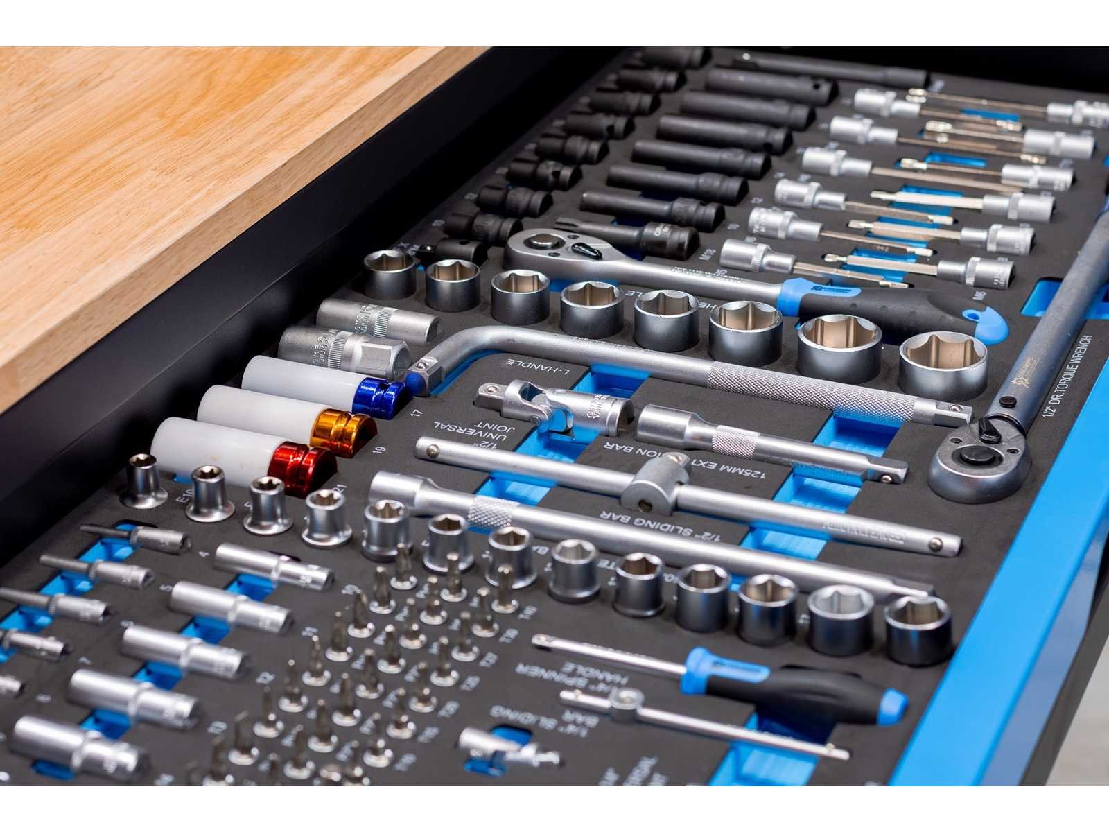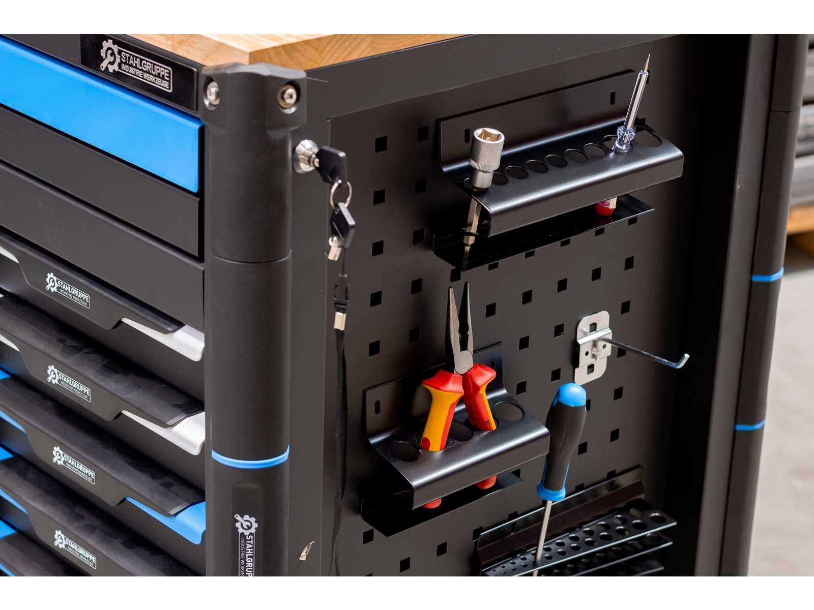 V.v. gereedschap 294-delig; 4 wielen waarvan 2 met rem; stuurgroep; houten werkblad; 13 lades; 11 lades gevuld; 2 sleutel sets; in de doos; ongebruikt; 4145; Nee Merk: Stahlgruppe Type: SG22 Bouwjaar: 2023 Aantal laden: 13 Met inhoud: true Totale afmeting L: 1130mm Totale afmeting Breedte: 570mm Totale afmeting Hoogte: 1090mm