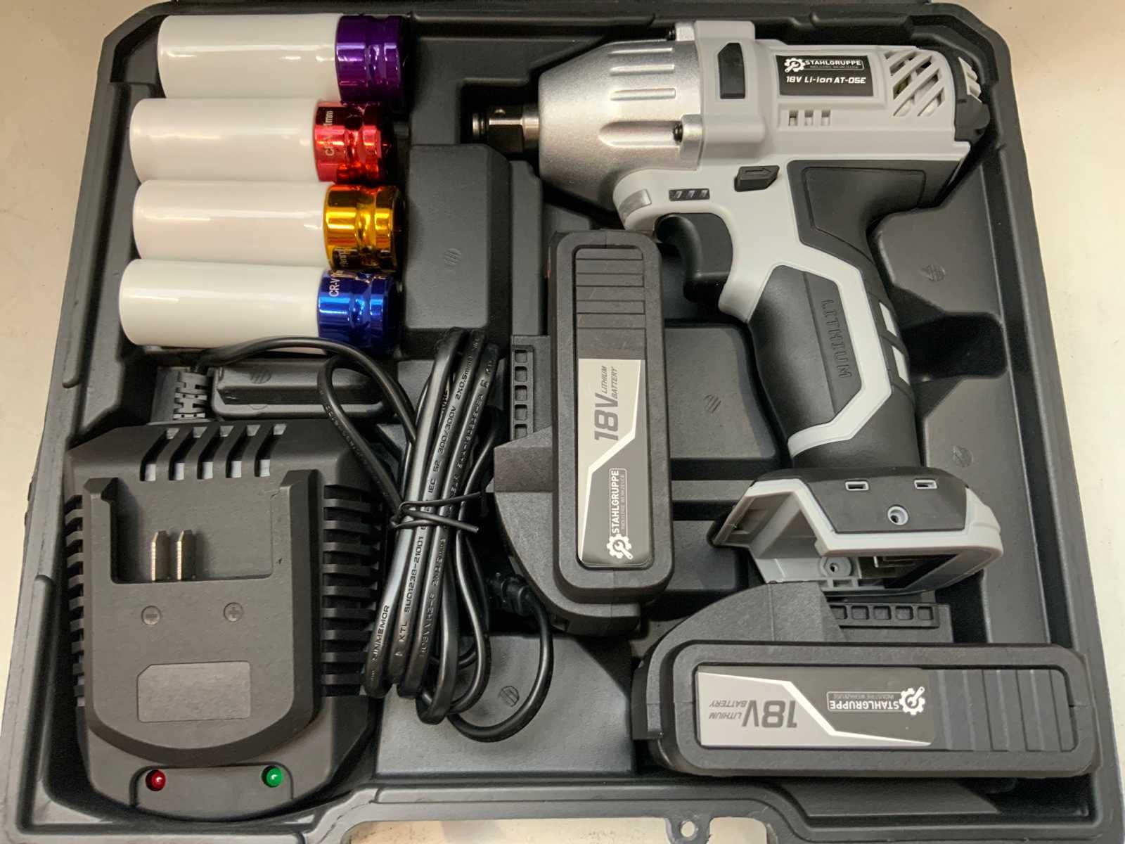 4x 1/2" doppen; 17-19-21-22mm; 2.0ah; 0-3000rpm; 330n.m; 6122 Nee Merk: Stahlgruppe Accuspanning: 18V Accu type: Lithium Aantal accu's: 2 Accu lader: true