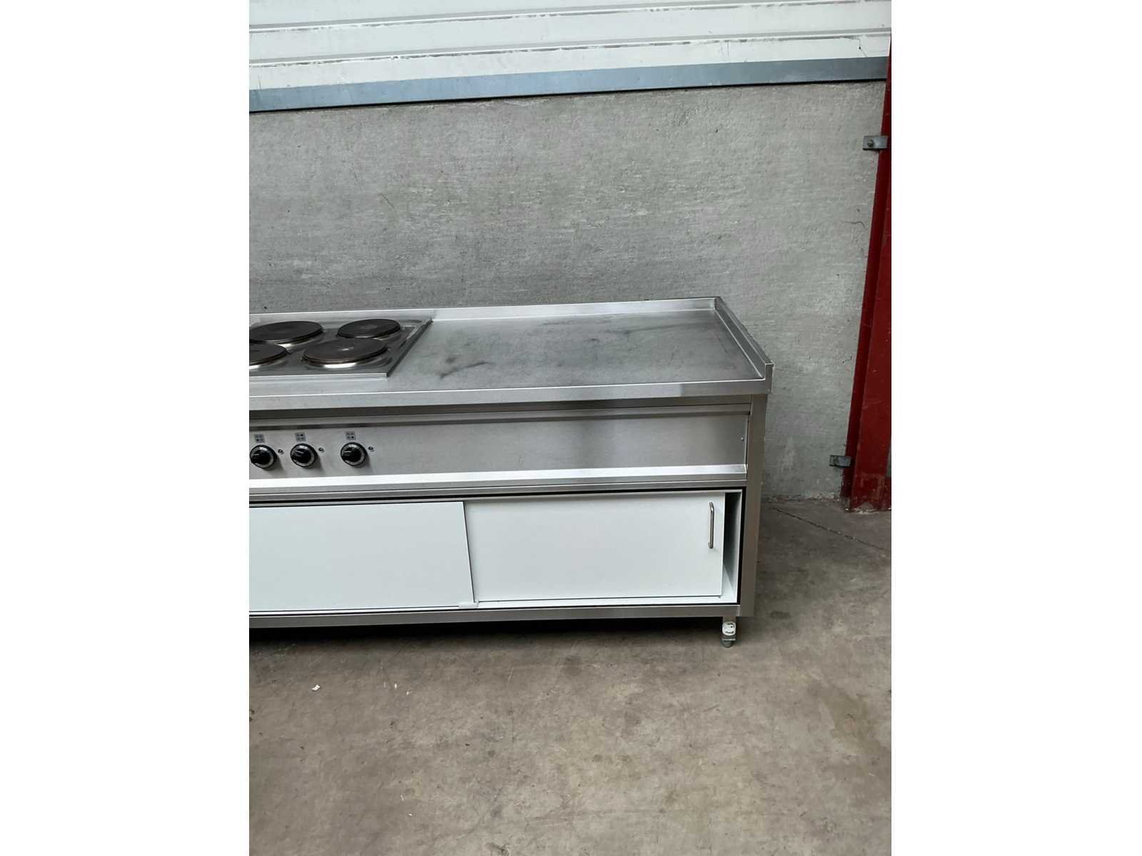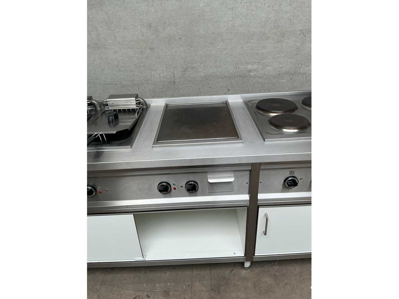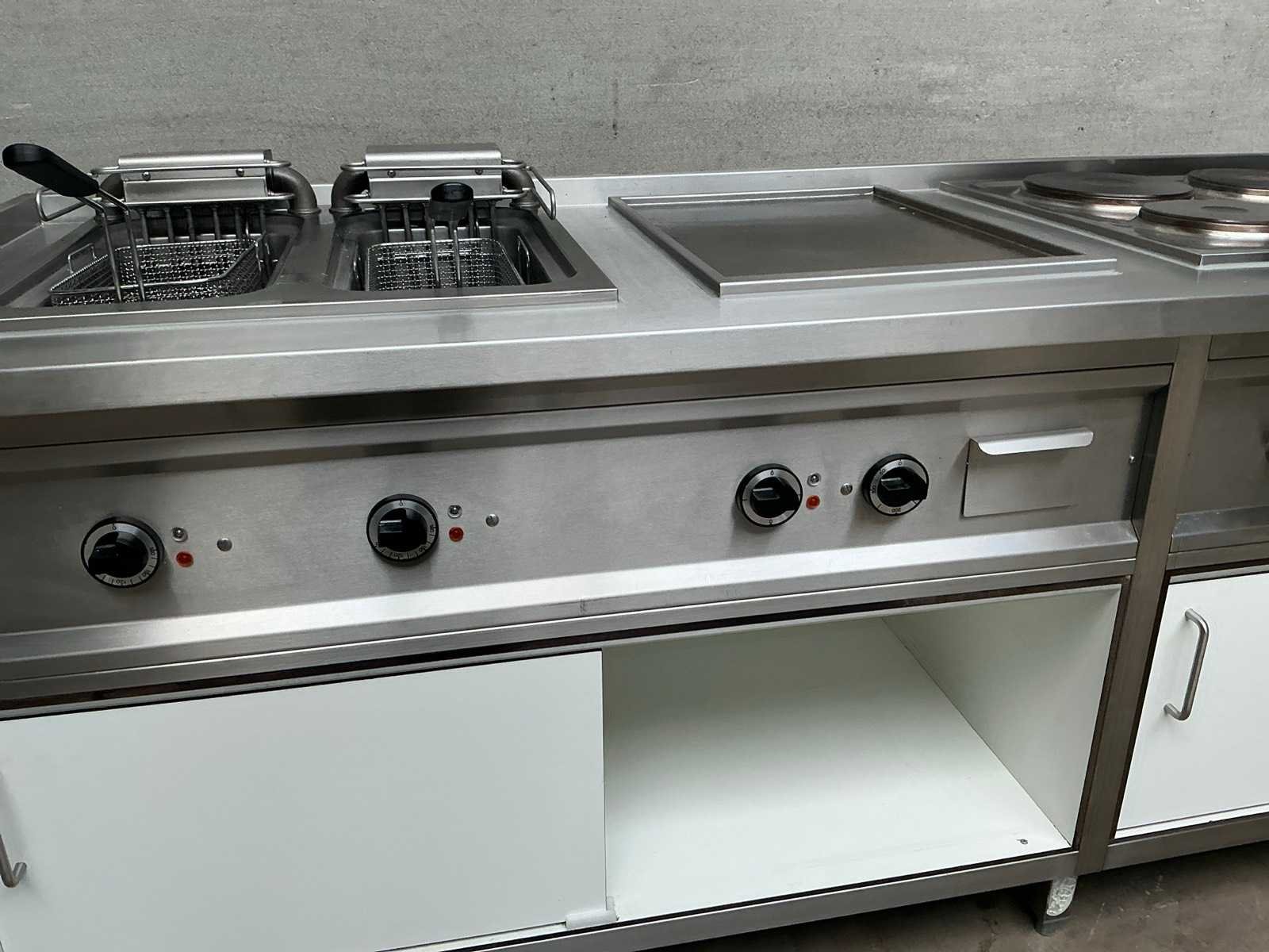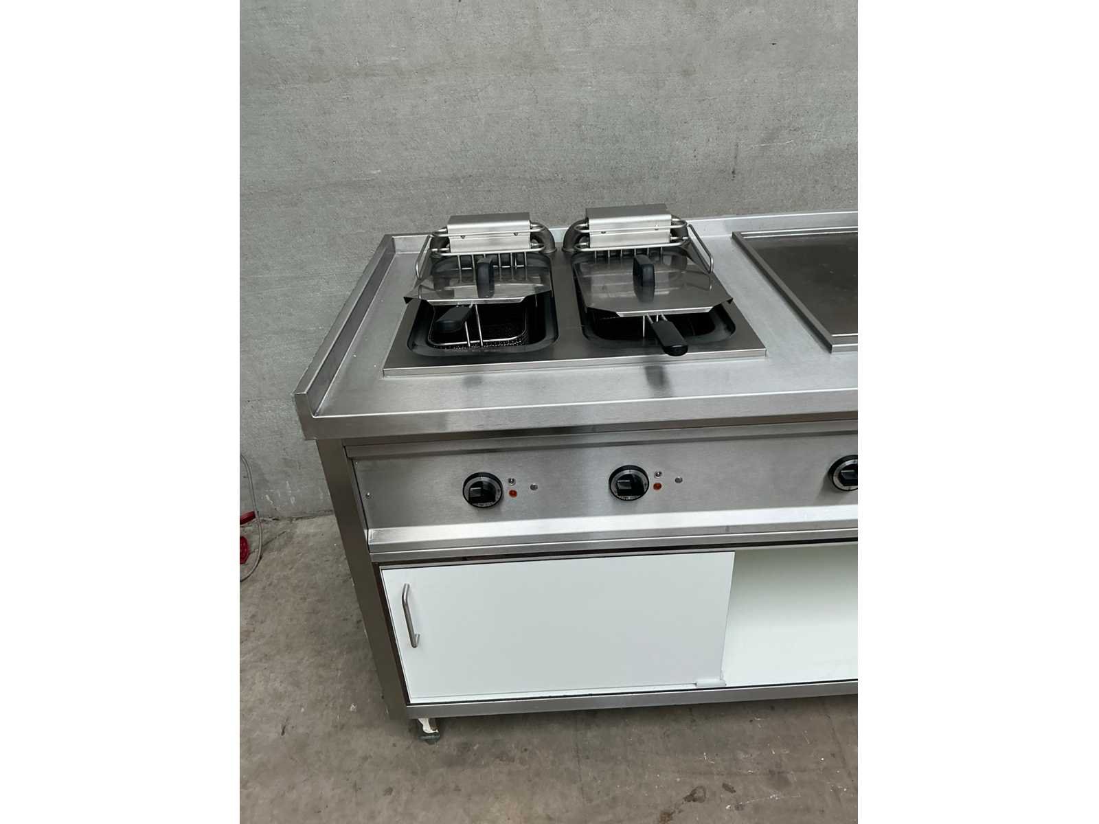 Rvs kooklijn bestaand uit, 4 pits elektrisch fornuis, spiegelbakplaat, dubbele elektrische friteuse voorzien van aftapkraan, opbergruimte met schuifdeuren Nee Elektrisch verwarmd: true Aansluiting: 400V Totale afmeting L: 2920mm Totale afmeting Breedte: 750mm Totale afmeting Hoogte: 900mm