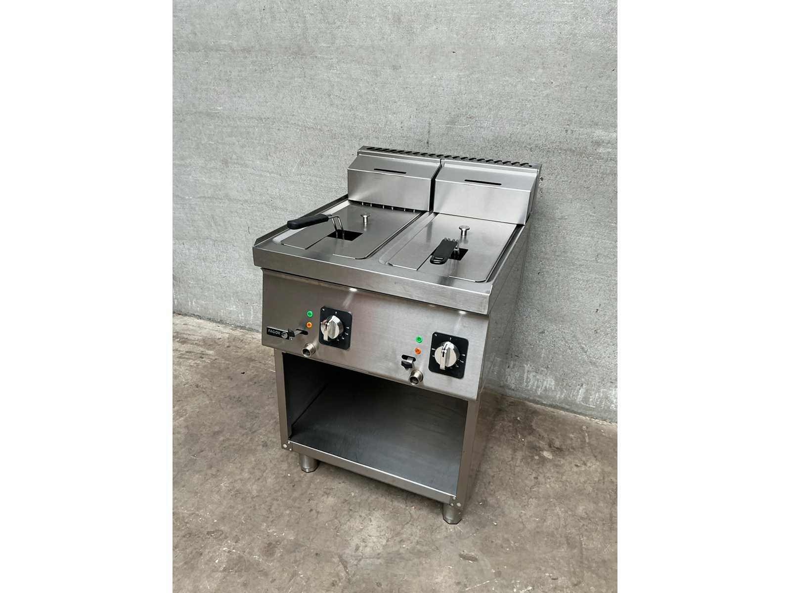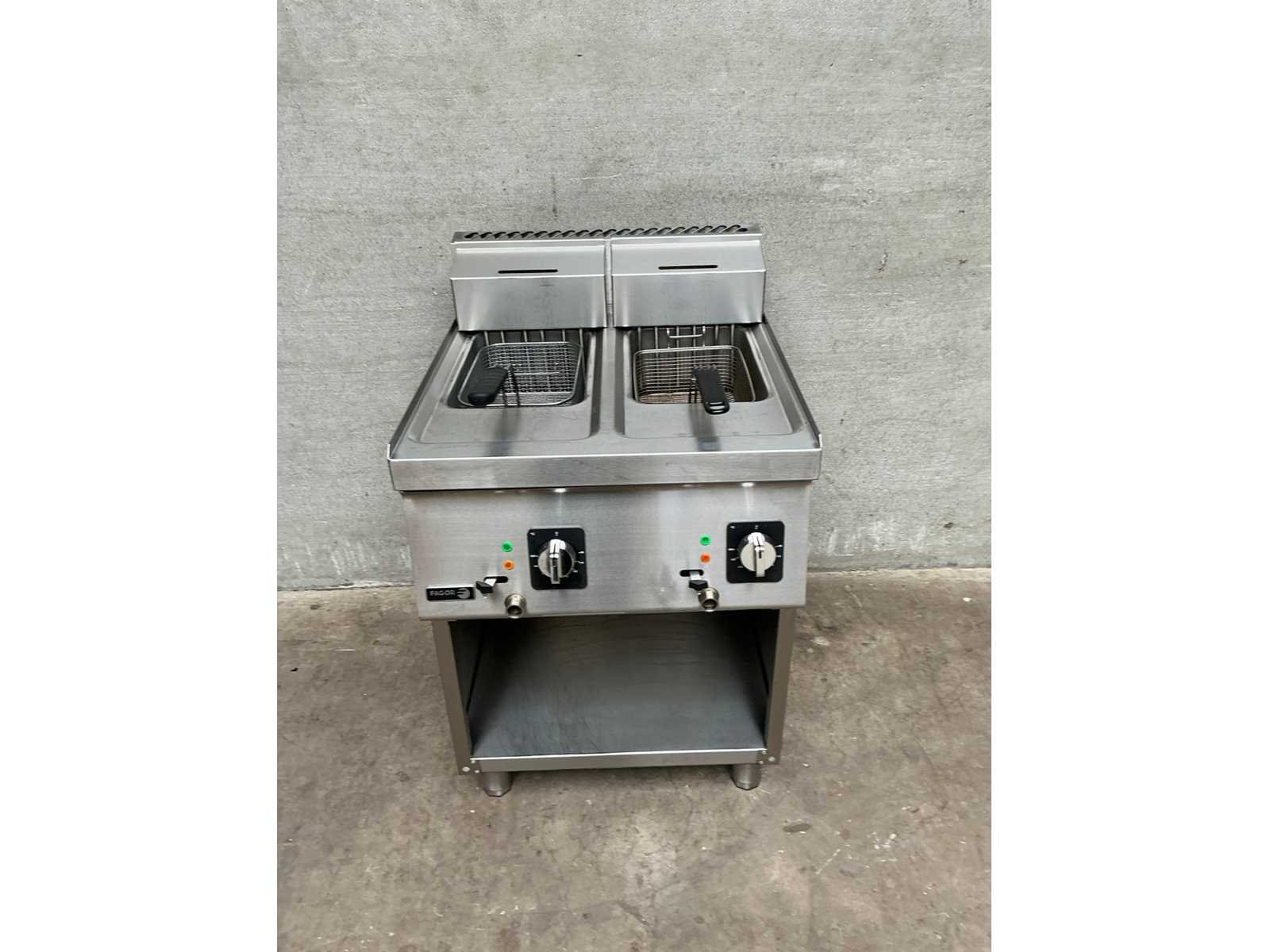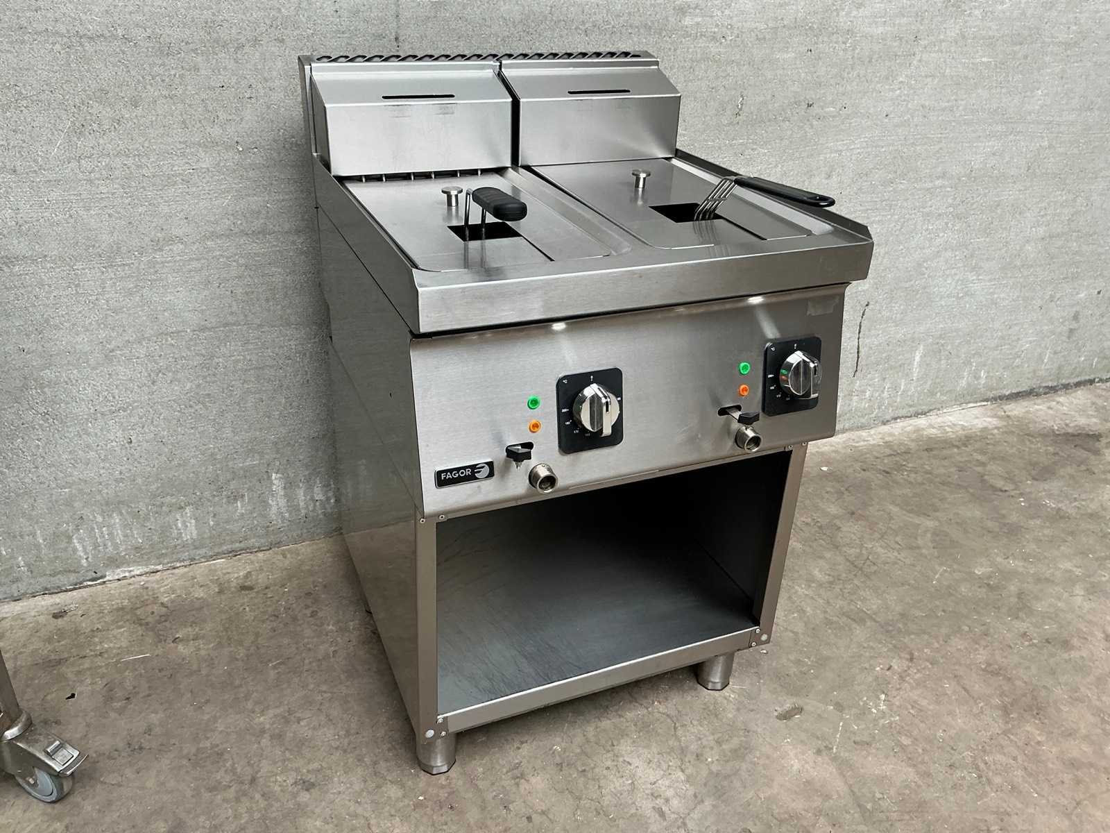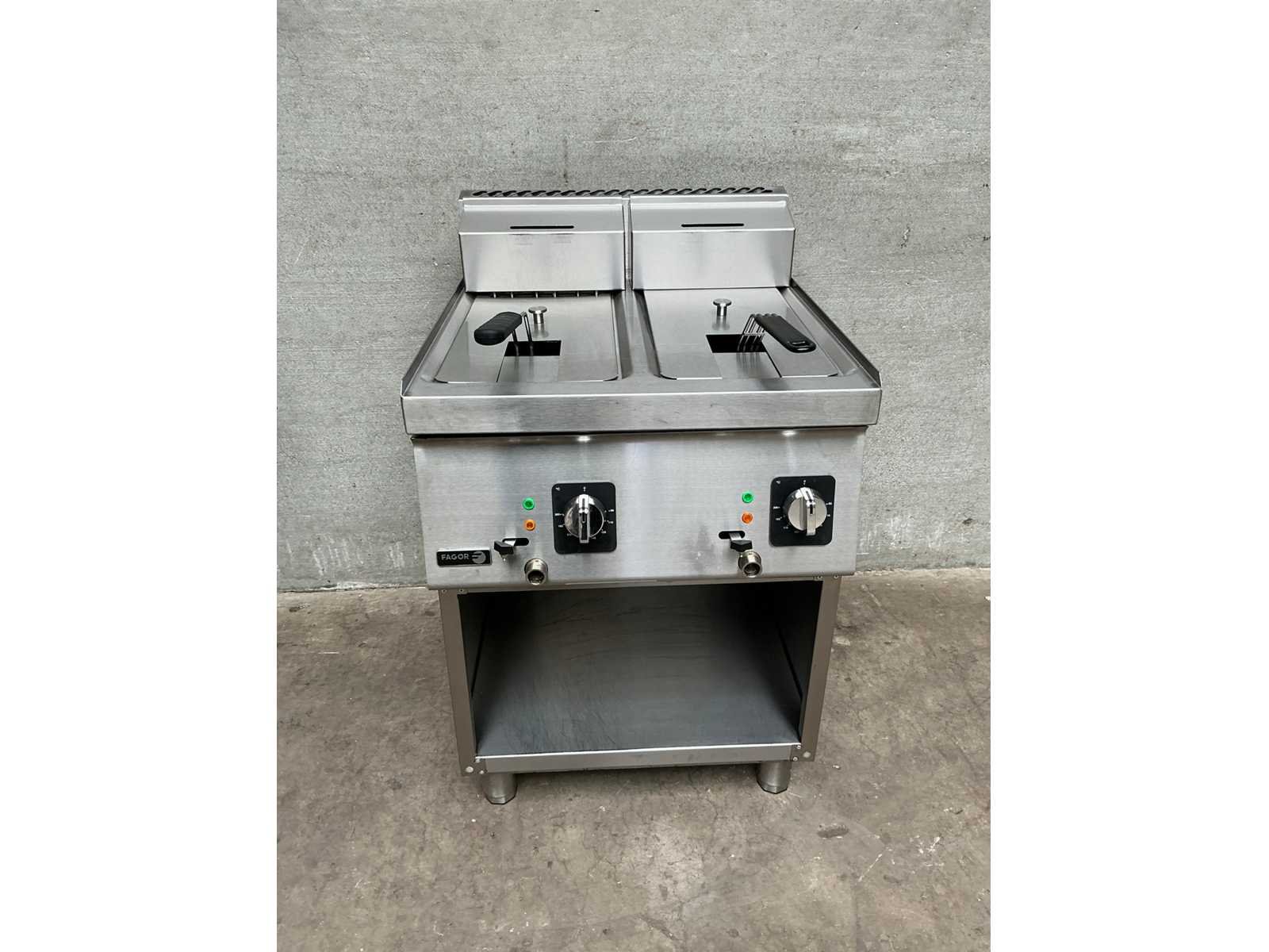 Dubbele rvs friteuse, inclusief mandjes en deksels, voorzien van aftapkraan Nee Merk: Fagor Rvs: true Elektrisch: true Dubbel: true Thermostaat: true Aftapkraan: true Aansluiting: 400V Totale afmeting lxbxh: 60x68x99 mm.mm