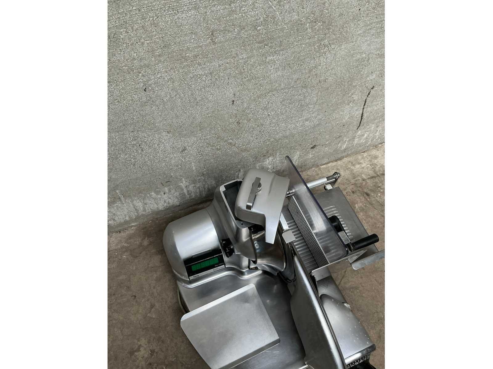 Rvs snijmachine voorzien van messenslijper, weegsysteem werkt niet Nee Merk: DeKo Type: 834S Messlijper: true Aansluiting: 230V Totale afmeting L: 640mm Totale afmeting Breedte: 650mm Totale afmeting Hoogte: 480mm