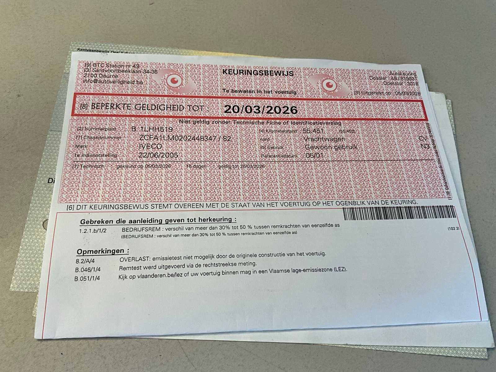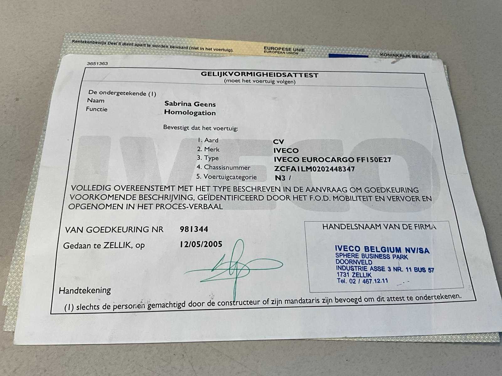 Aanwezige boorddocumenten: inschrijvingsbewijs deel I en II, technische fiche, gelijkvormigheidsattest, identificatieverslag, keuringsbewijs geldig tot 20/03/2026 Nee Chassisnummer VIN: ZCFA1LM0202448347 Merk: Iveco Type: Eurocargo Bouwjaar: 2005 Datum eerste inschrijving: 22/06/2005 Aantal assen: 2 Brandstof: Diesel Transmissie: Automaat Kilometerstand bij opname: 55513km Ladderwagen: true Kentekenpapieren compleet?: true