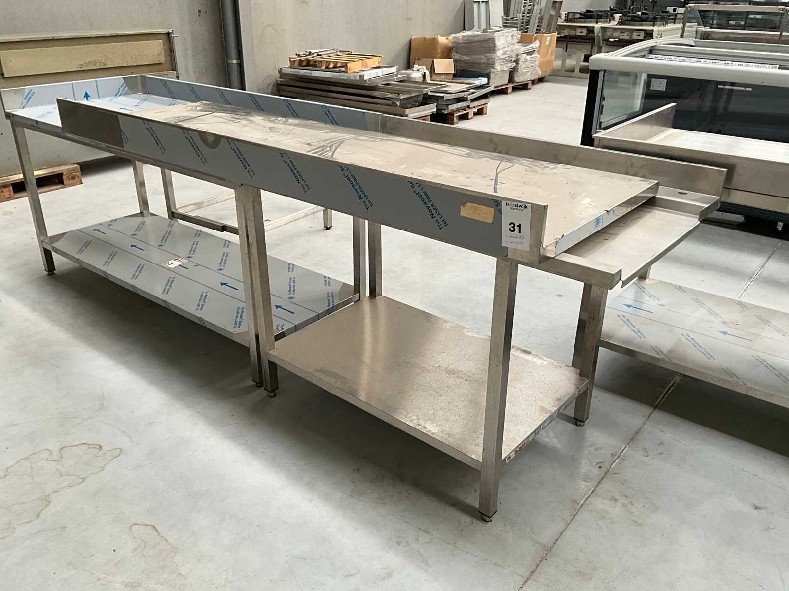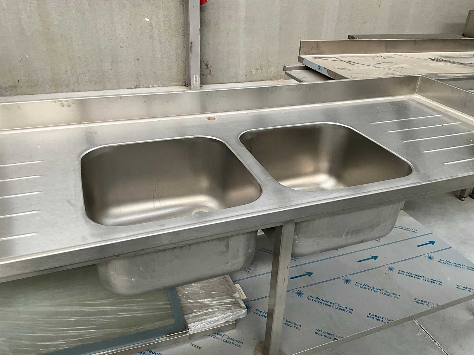 Voorzien van dubbele spoelbak afmetingen 50x50x30 cm, opzetrand, 2x spoeltafel afmetingen 75x175/130x100 cm, +klein rvs onderstel 70x65x70 cm, +1x werkblad rvs 70x220 cm met opstand Nee Lengte: 80cm Breedte: 235cm Hoogte: 100cm
