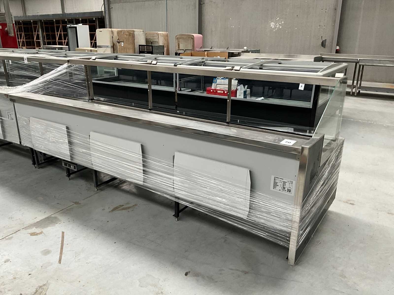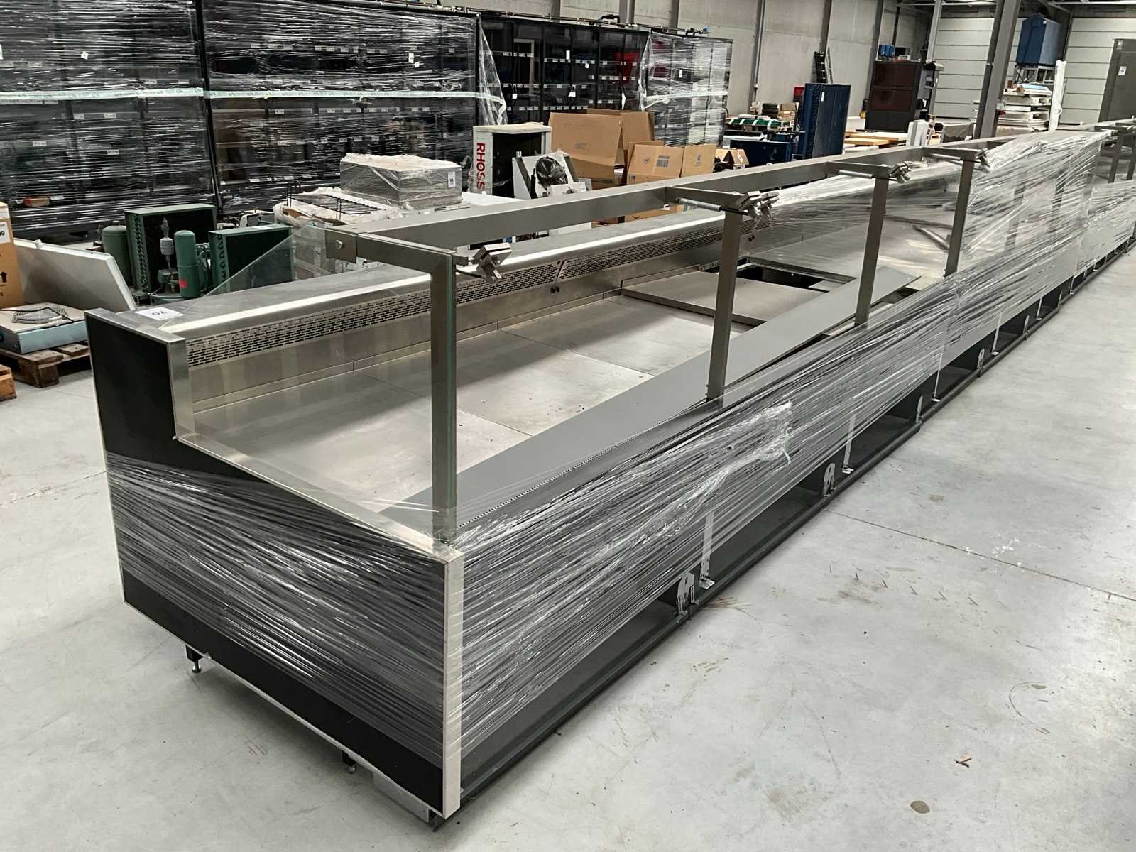 Bestaand uit koelkast met glazen voorkant en top, 3x onderliggende 3-deurs koelvak, exclusief koelcompressor, bijhorende glas en tools is deel van de 4x pallet foto Nee Merk: Pastorconcept Totale afmeting L: 1160mm Totale afmeting Breedte: 3170mm Totale afmeting Hoogte: 1240mm