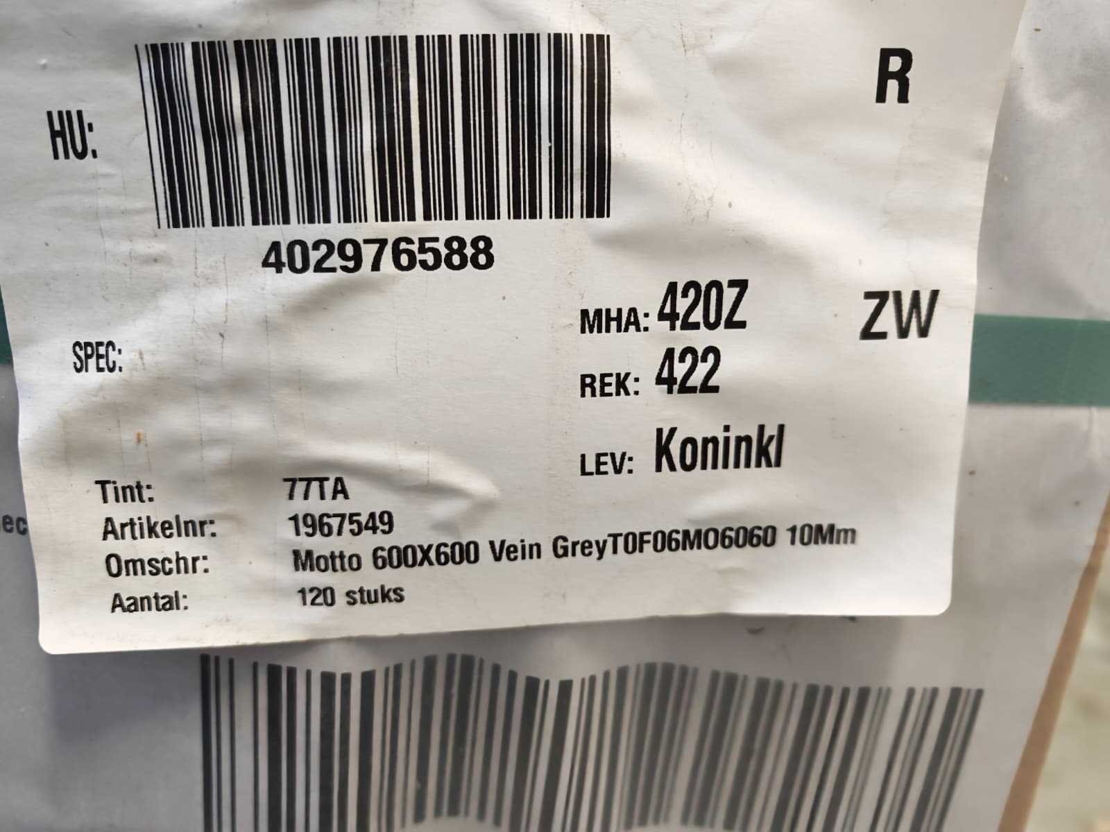 Nee Merk: Mosa Kleur: Grey Afwerking: Mat R10 Lengte: 600mm Breedte: 600mm Dikte: 10mm Materiaal: Keramiek Type: Vloertegel Model: Vein T0F06MO6060 Aantal m² per verpakking: 1.08m² Aantal pakken: 40 Totaal oppervlakte: 43.2m² Totaal gewicht: 860kg