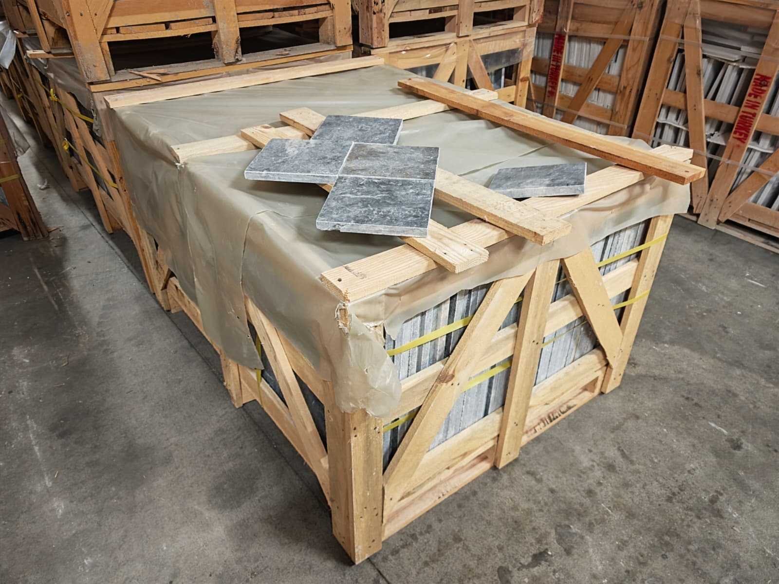 Totaal 4 kisten No Merk: Natuursteen Kleur: Blauw Afwerking: Gezoet en Getrommeld Lengte: 200mm Breedte: 200mm Dikte: 20mm Materiaal: Hardsteen Type: Vloertegel Totaal oppervlakte: 101.76m² Totaal gewicht: 4500kg