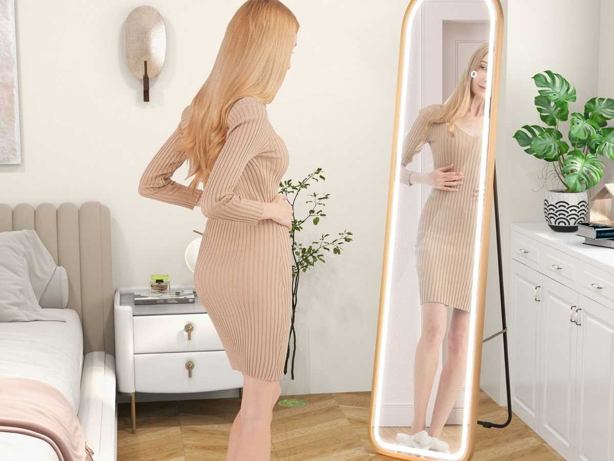 Afgeronde spiegel van volledige lengte met led-verlichting led-verlichte spiegel aluminium frame dimbare verlichting 3 kleuren goud