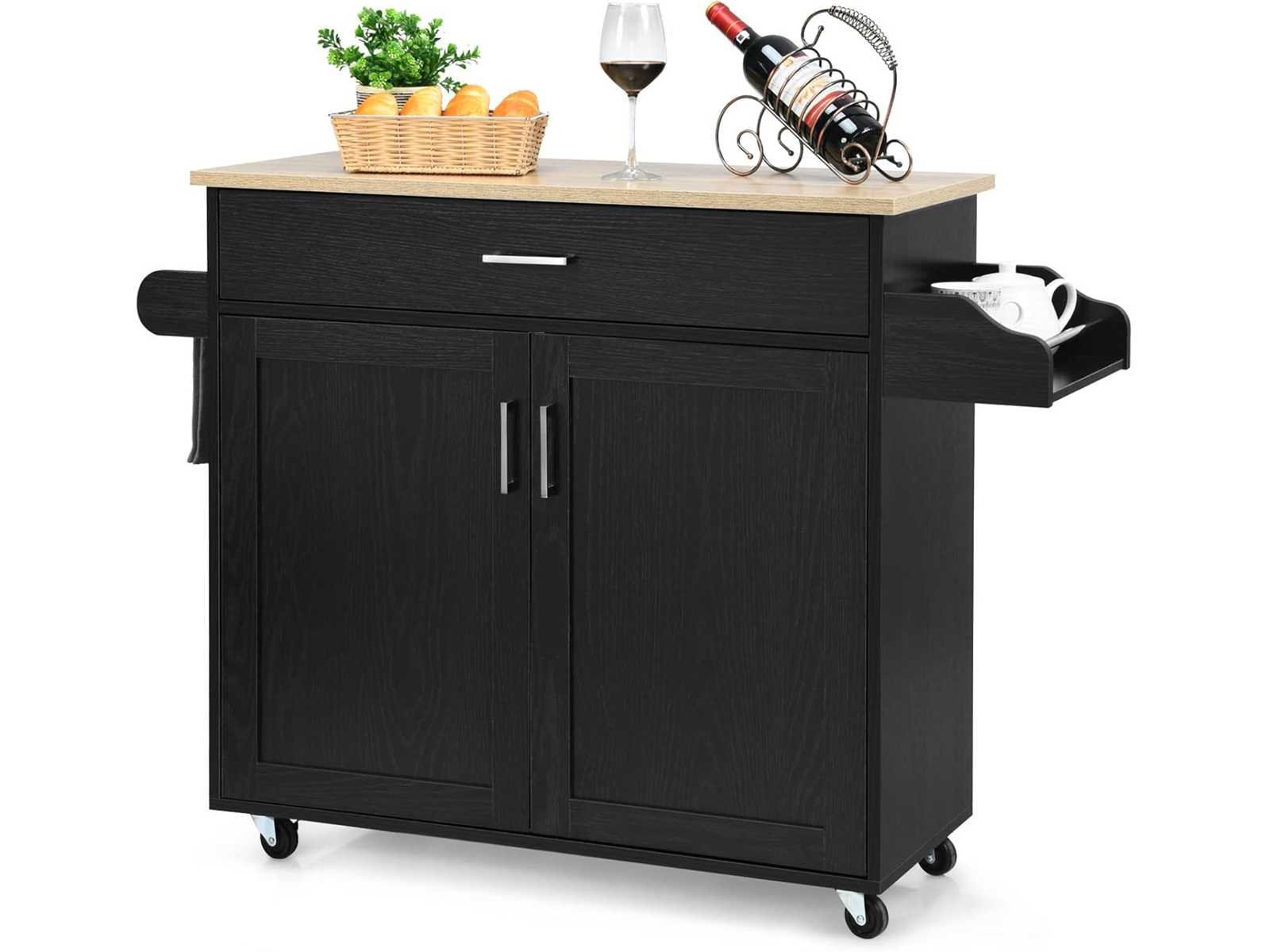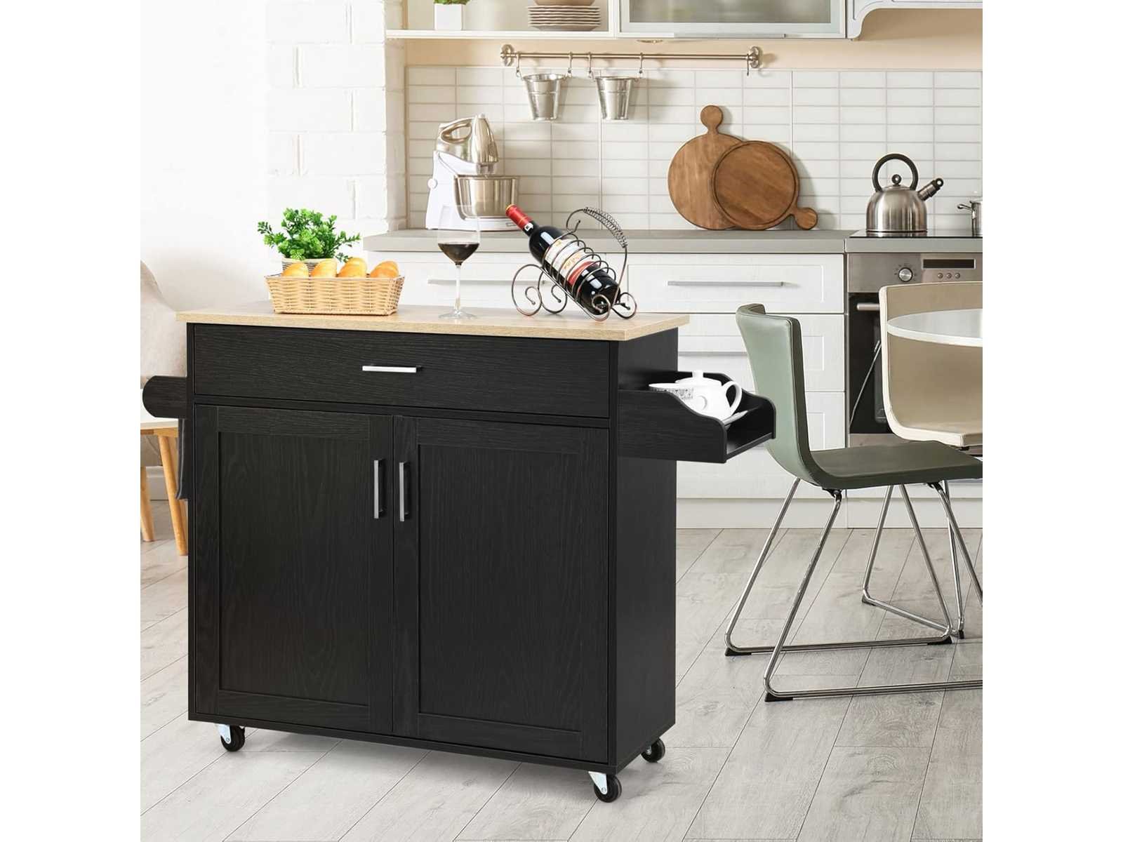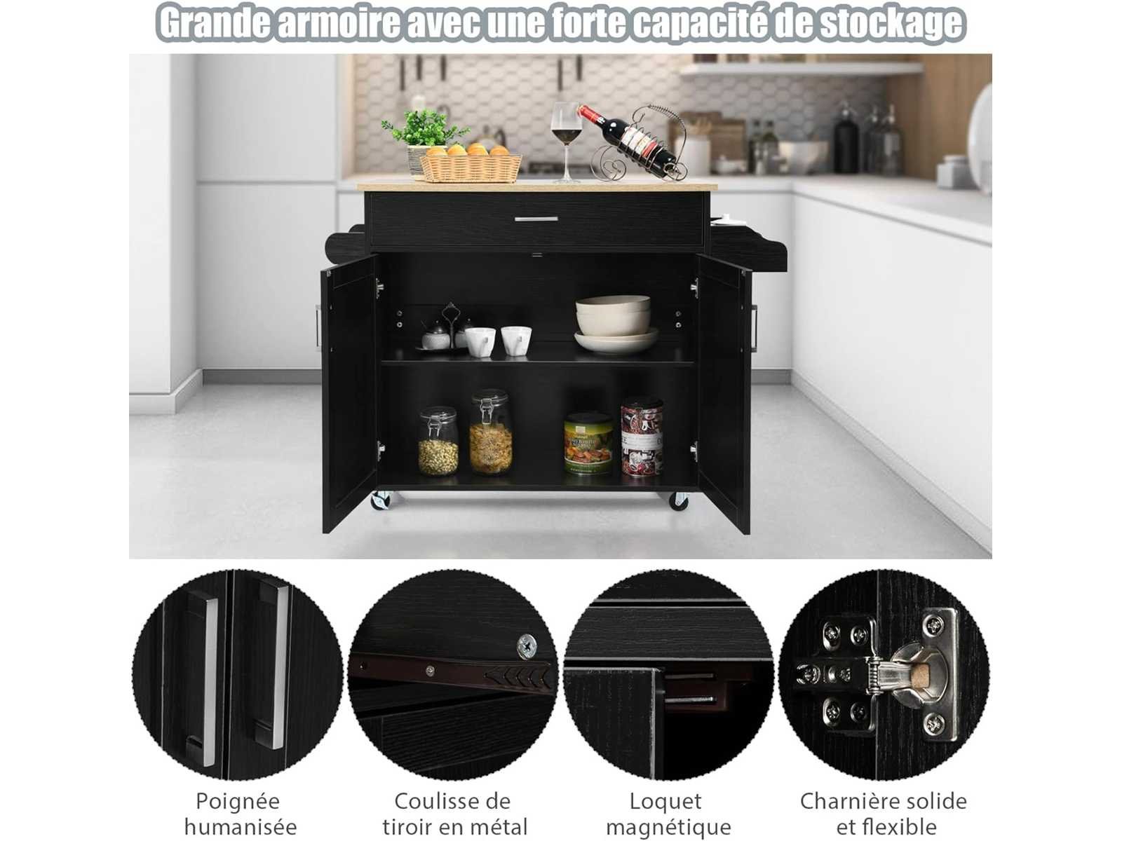 ? Een perfecte opslagoplossing:? Een grote lade en ruime kast bieden opslagruimte voor diverse gebruiksvoorwerpen, zilveren bestek en glazen in een afgesloten ruimte voor optimale veiligheid. Daarnaast is de keukenkar goed ingericht, ontworpen met een handdoekenstang en een kruidenrek, waarmee je handdoeken kunt ophangen en kruidenpotten kunt bewaren voor gemakkelijke toegang. ? Verstelbare plank en ruime aanrecht: ? De 3-verdiepings verstelbare plank in de kast stelt je in staat de opslaghoogte te bepalen. Je kunt hem ook verwijderen voor meer ruimte. Bovendien biedt deze kar met zijn brede aanrecht een groot werkoppervlak voor het bereiden van eten. ? Makkelijk te bewegen dankzij vergrendelbare castors:? Uitgerust met vier gladde universele wielen kan het keukeneiland gemakkelijk overal naartoe worden verplaatst. De twee rubberen wielen zijn vergrendelbaar, waardoor het eiland stevig blijft om plotselinge bewegingen te voorkomen en optimale veiligheid te garanderen. ? Stevige en resistente constructie: ? Gemaakt van premium MDF en composiethout, is deze keukenkar sterk en kan lang worden gebruikt, waardoor een zware lading wordt gedragen. Sterke metalen scharnieren maken de bevestiging sterker voor een betrouwbaarder product. Het gladde, waterdichte oppervlak is gemakkelijk schoon te maken. ? Meerdere toepassingen & Eenvoudige Montage:? Met zijn sobere en elegante uitstraling past het eiland op wielen perfect in elk interieur. Het is ideaal voor een keuken, gang, restaurant of elke andere ruimte waar je meer opslagruimte nodig hebt. De montage-instructies zijn gedetailleerd; Alle onderdelen zijn genummerd en elke montagestap wordt aangegeven. Non