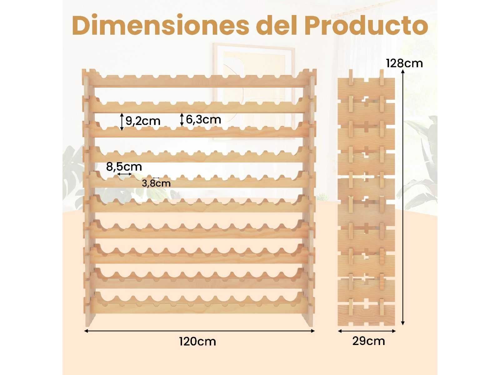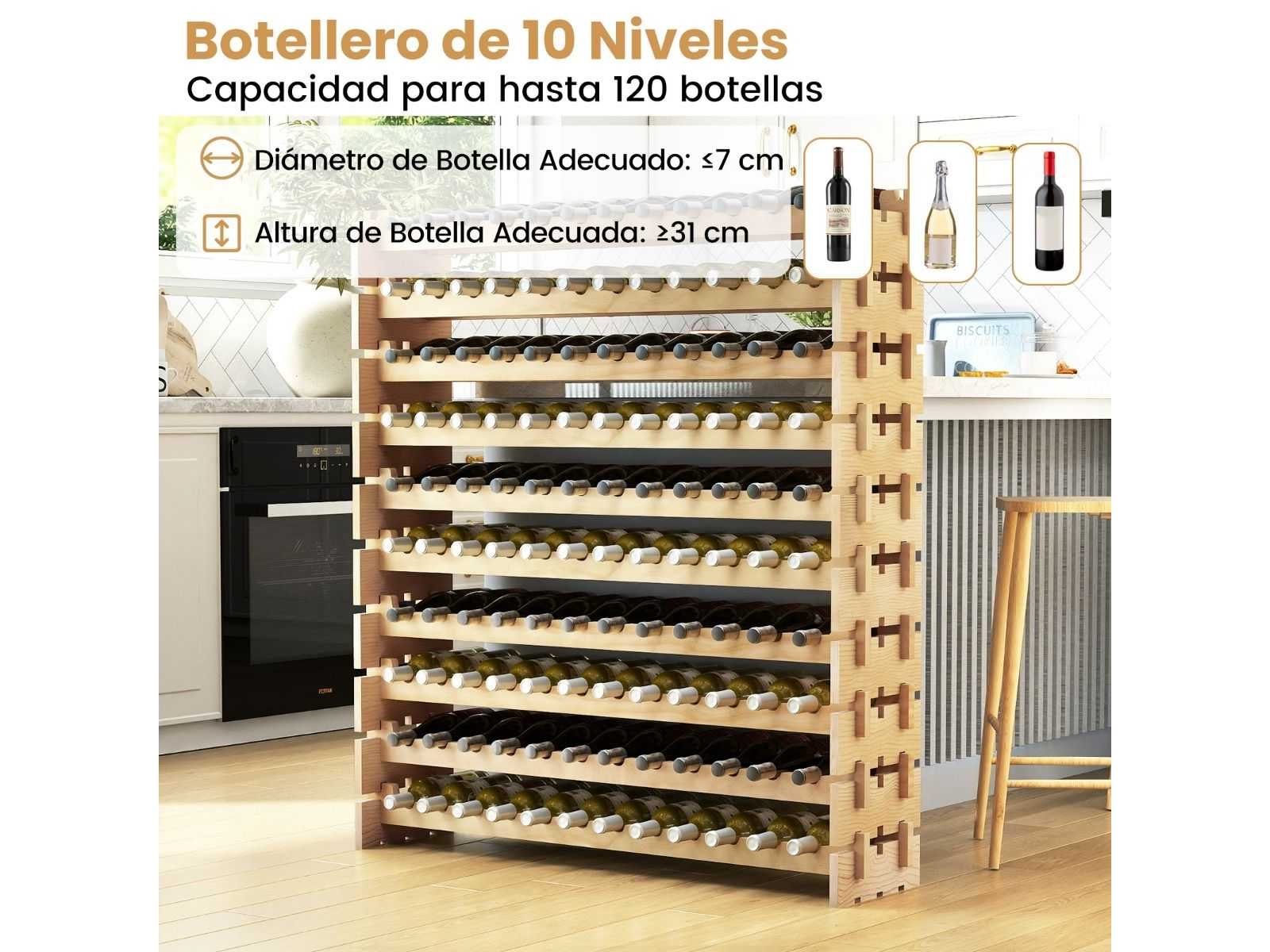 Kenmerken: Het kan op verschillende niveaus worden geconfigureerd om aan je opslagbehoeften te voldoen. Hoogwaardig dennenhout voor hoge sterkte en stabiliteit De golfplaten bars vormen een veilige standaard voor je wijncollectie. Het schuine ontwerp van de opslag helpt de versheid van de wijnen te behouden. Perfect voor keukens, eetkamers, wijnkelders en meer Snelle, gereedschapsvrije assemblage Begroting Kleur: Natuurlijk Materiaal: Dennenhout Productafmetingen: 120 cm x 29 cm x 79 cm (L x W x H) Laadvermogen: 90 kg Netto gewicht: 9 kg Maximaal gewicht: 10,5 kg Non
