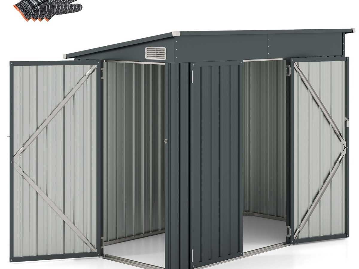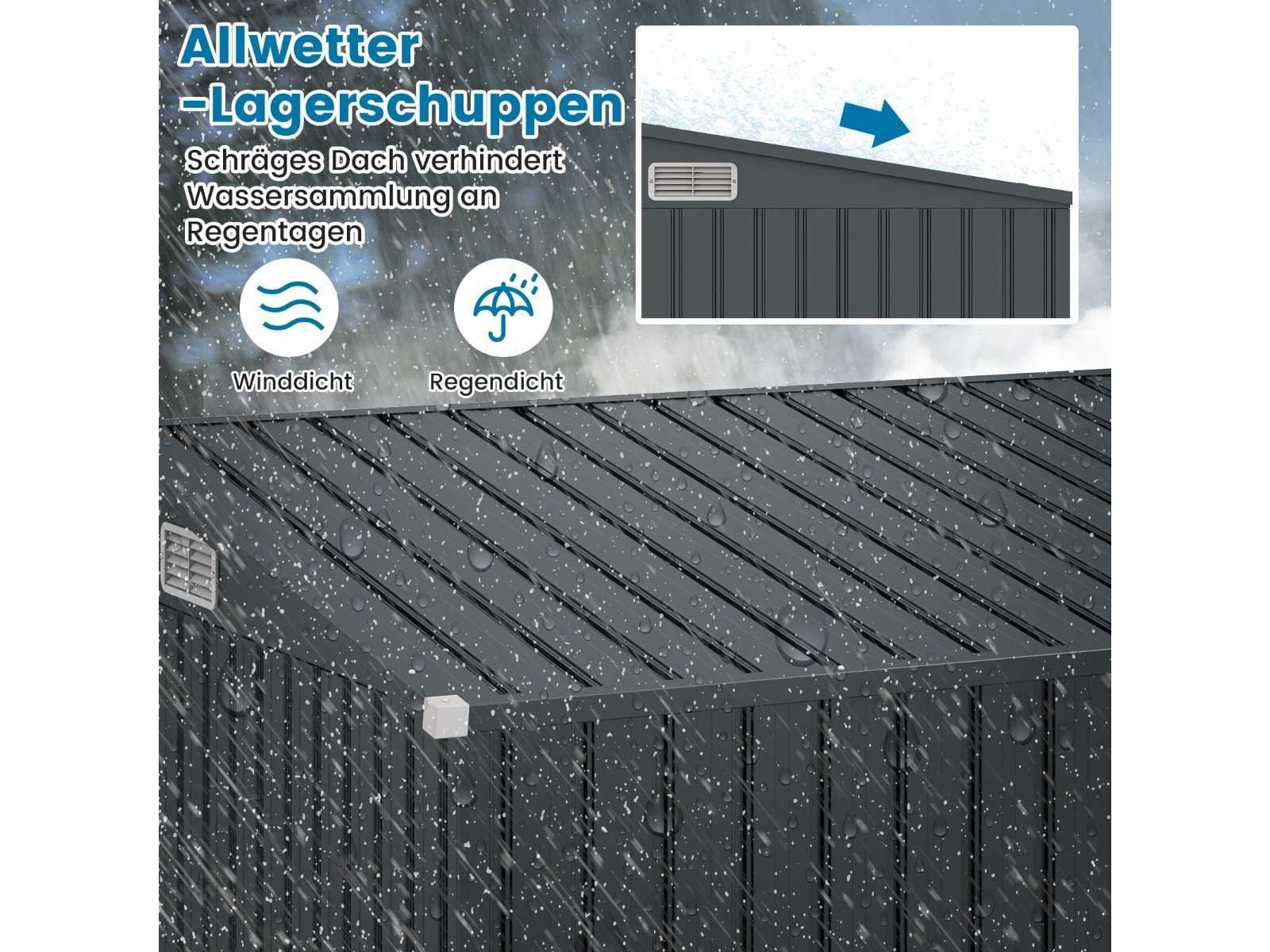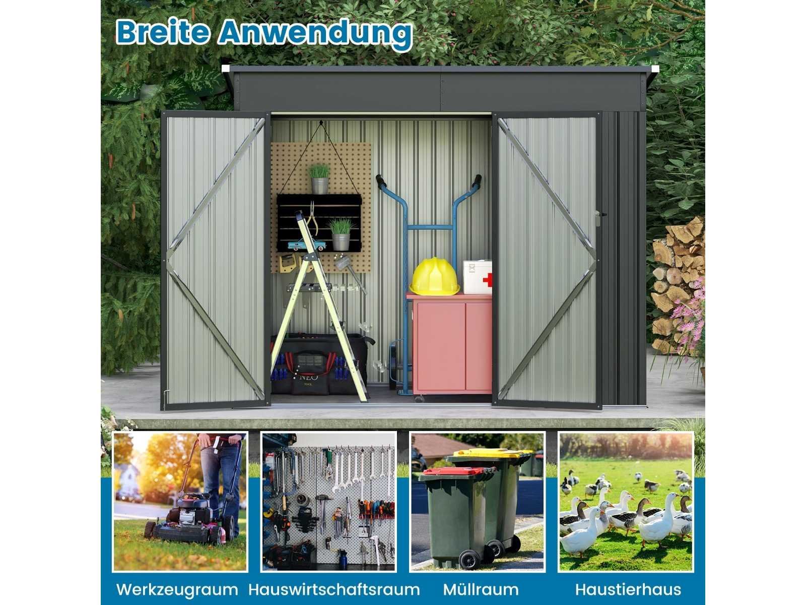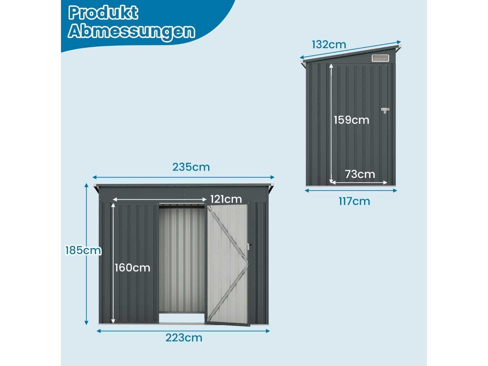 Kenmerken: Schuin dak: voorkomt waterophoping en beschermt uw bezittingen. Duurzame constructie: Waterdicht en winddicht voor maximale bescherming. Dubbeldeurontwerp: Gemakkelijke toegang en verhoogde beveiliging met een metalen grendel en slot. Meerdere toepassingen: gemakkelijk omgebouwd tot werkplaats, magazijn, vuilnisruimte of dierenasiel. Robuuste constructie: versterkt met gegalvaniseerde metalen panelen en anti-botsingscoating. Beveiliging: Beveiligingssloten en sleutels voor extra bescherming. Ventilatie: Ramen voor ventilatie. Afmetingen: 235 x 117 x 185 cm (L x B x H) Non