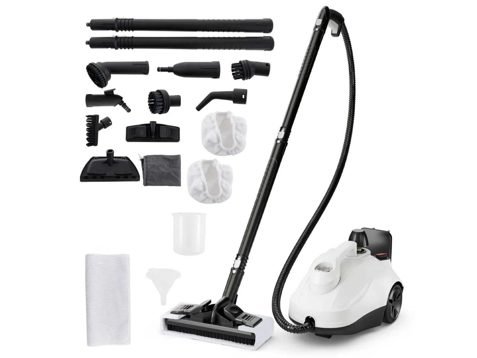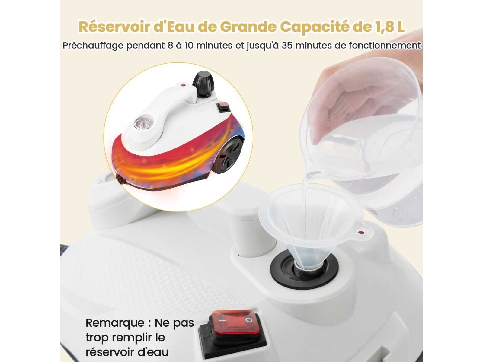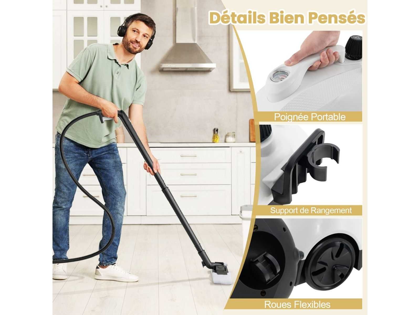 Specificaties Kleur: Wit/Geel Materiaal: PP, roestvrij staal Totale afmeting: 36 x 26 x 23 cm (L x W x H) Voeding: 220-240V 50Hz Vermogen: 2000W Watertankcapaciteit: 1,8 L Opwarmtijd: 8-10 minuten Maximale stoomdruk: 5 bar Maximale bedrijfstemperatuur: 160°C Werktijd: 35 minuten Koordlengte: 5 m Lengte van de flexibele slang: 146 cm Netto gewicht: 5,5 kg Non