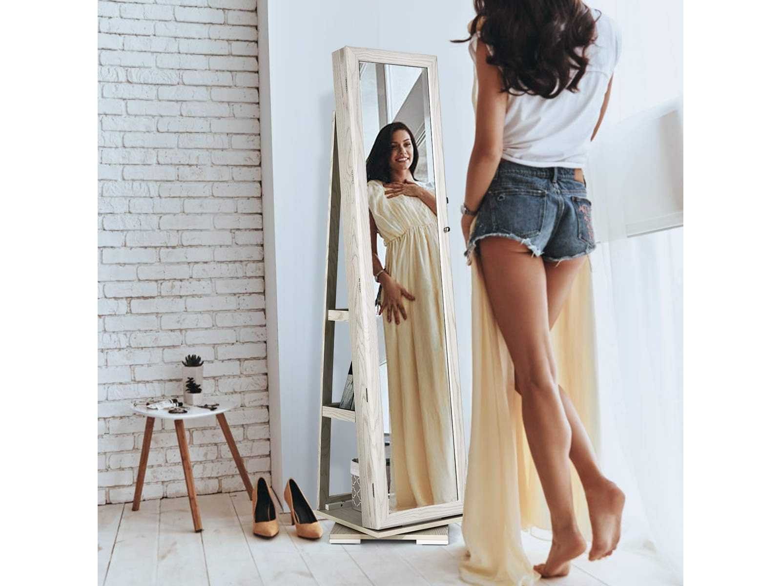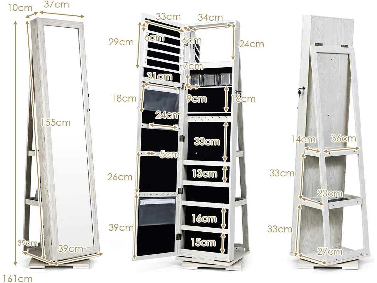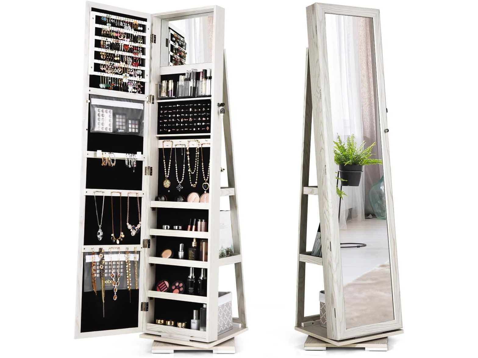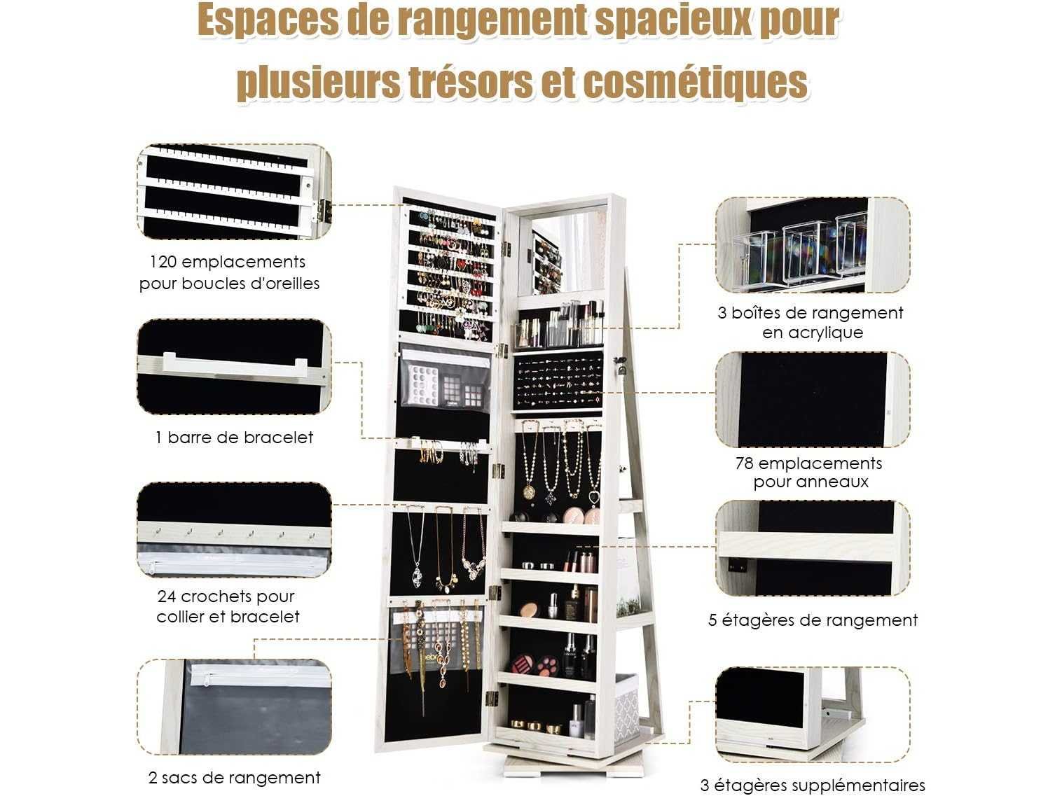 ? 2-in-1 sieradenkast met spiegel:? Geniet van het dubbele voordeel van de sieradenkast en de kapspiegel in één meubelstuk. Deze vrijstaande sieradenkast geeft je het plezier om je mooi aan te kleden. En de spiegel van premium glas geeft je een overzicht van top tot teen op je outfit zonder te vervormen. ? Houd al je sieraden georganiseerd:? De sieradenkast bevat 6 beklede oorbelplanken met 120 oorbelgleden, 78 ringgroeven, 24 kettinghaken, een armbandstang, 5 planken en 2 opbergvakken die sieraden stofvrij houden. ? 360 graden draaibare basis :? De kast is flexibeler om aan jouw wensen te voldoen dankzij zijn 360-graden draaibare basis. Dit maakt het niet alleen makkelijk om je accessoires te vinden, maar geeft je ook een goede positie om jezelf in de spiegel te bekijken. Daarnaast kun je met de drie planken achter de kast je tas of andere spullen bovenop bewaren. ? Stabiel en duurzaam frame:? Gemaakt van hoogwaardige MDF, is dit meubelstuk zeer duurzaam. Elk paneel is zorgvuldig geselecteerd en de vierkante basis verbetert de stabiliteit. Hierdoor kun je het lange tijd zonder problemen gebruiken. ? Slot met sleutel voor discrete opslag: Ons vrijstaande meubilair is op slot te doen met 2 sleutels. Zodat je je sieraden discreet kunt bewaren. Daarnaast is de binnenkant van de kast bekleed met kwaliteitsfluweel om te voorkomen dat je sieraden beschadigd raken of krassen. Non