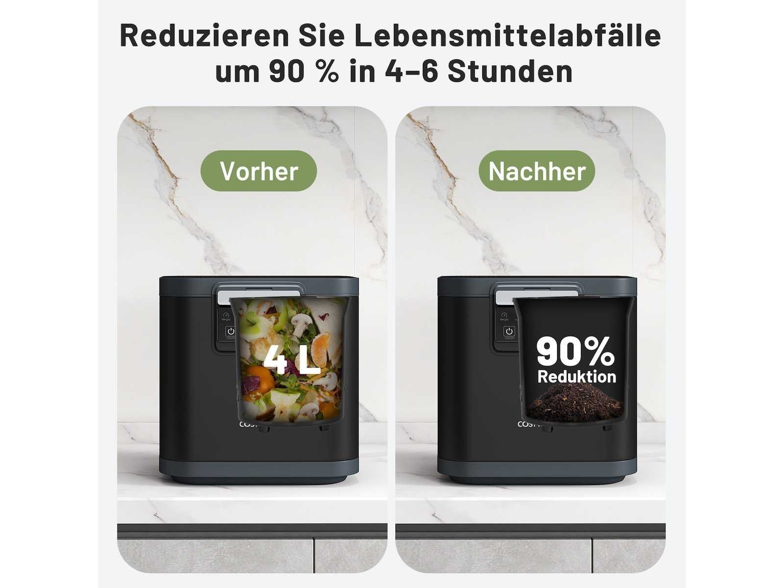 De 4-liter elektrische composter biedt een moderne oplossing voor huishoudelijk afvalbeheer, waarbij voedselresten in slechts enkele uren met maximaal 90% worden verminderd. Dankzij de twee actieve koolstoffilters helpt het om de lucht in de keuken te behouden. Kenmerken: Koolstoffilters: Gemakkelijk te vervangen filters die zorgen voor schone lucht. Capaciteit: Kan tot 4 liter afval per dag verwerken. Mengsysteem: Grote messen die afval drogen en malen. Makkelijk schoon te maken: Zelfreinigend met één druk op de knop en een vaatwasserbestendige emmer. Gebruiksvriendelijk: Een leeg bedieningspaneel met timer en filterindicatoren. Technische specificaties: Kleur: Zwart Materialen: Metaal, ABS, Aluminium Productafmetingen: 33,5 x 26 x 34 cm Capaciteit: 4 L Spanning: 220-240 V/60 Hz Vermogen: 500 W Ruisniveau: = 60 dB Koordlengte: 90 cm Netto gewicht: 12,5 kg Non