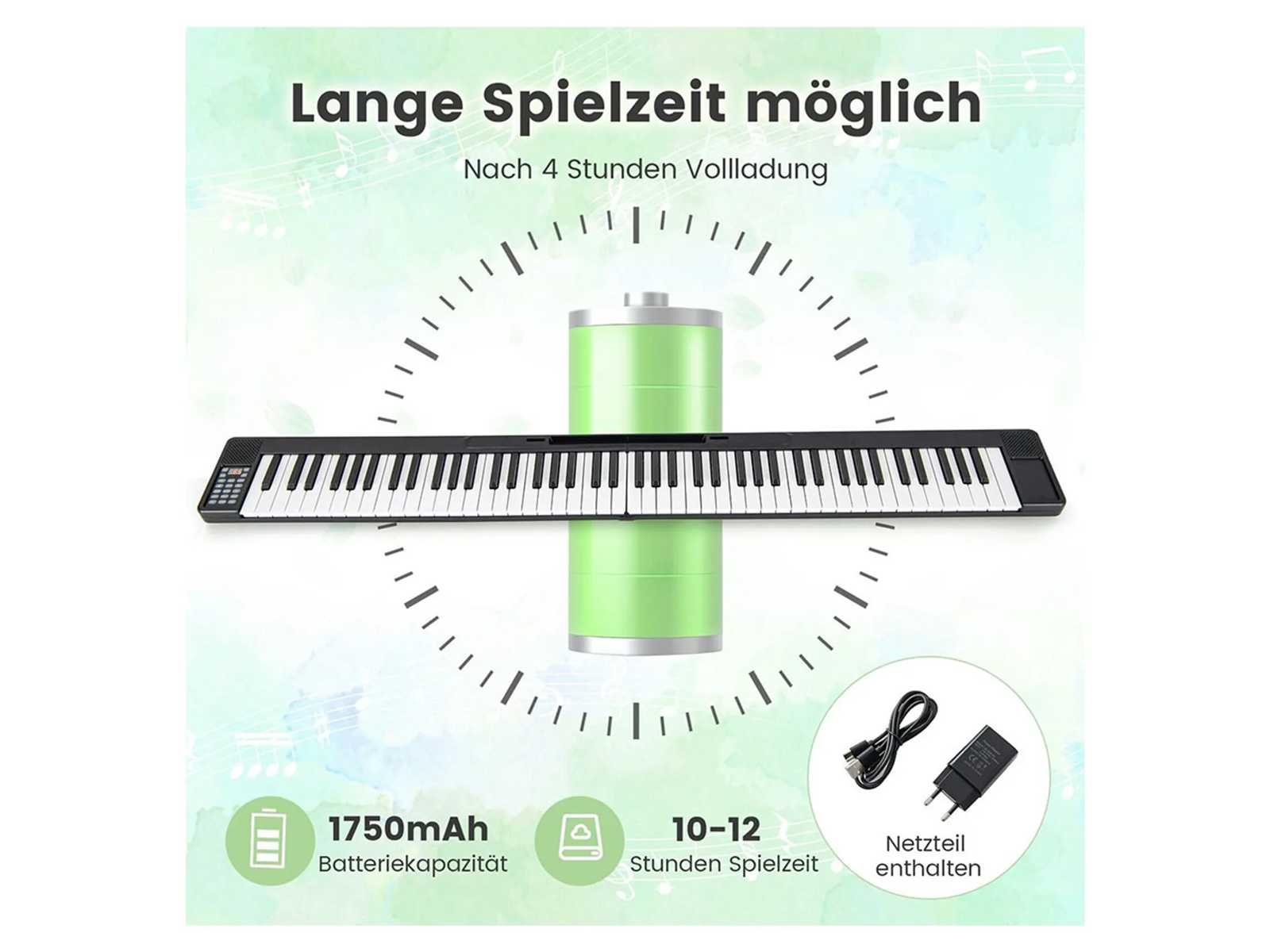 Technische kenmerken: Kleur: Zwart + Wit Toetsenbordmateriaal: ABS Draagtasmateriaal: Oxford Cloth Totale afmetingen: 137 cm x 16,5 cm x 5 cm (L x W x H) Opgevouwen afmetingen: 68,5 cm x 16,5 cm x 10 cm (L x B x H) Ingang: DC5V, 2A Uitgang: 500 mV Adapteringang: 100-240V, 50/60 Hz, maximaal 0,3A. Adapteruitgang: 5V, 2,0A, 10,0W Oplaadtijd: 4 uur Speeltijd: 10-12 uur Batterij: 3,7V, 1750mAh Gewicht: 3,2 kg Geschikte leeftijd: 3+ Non
