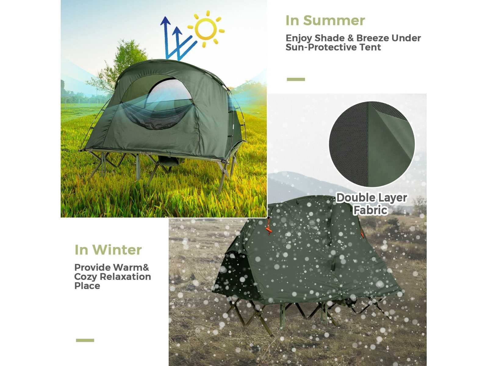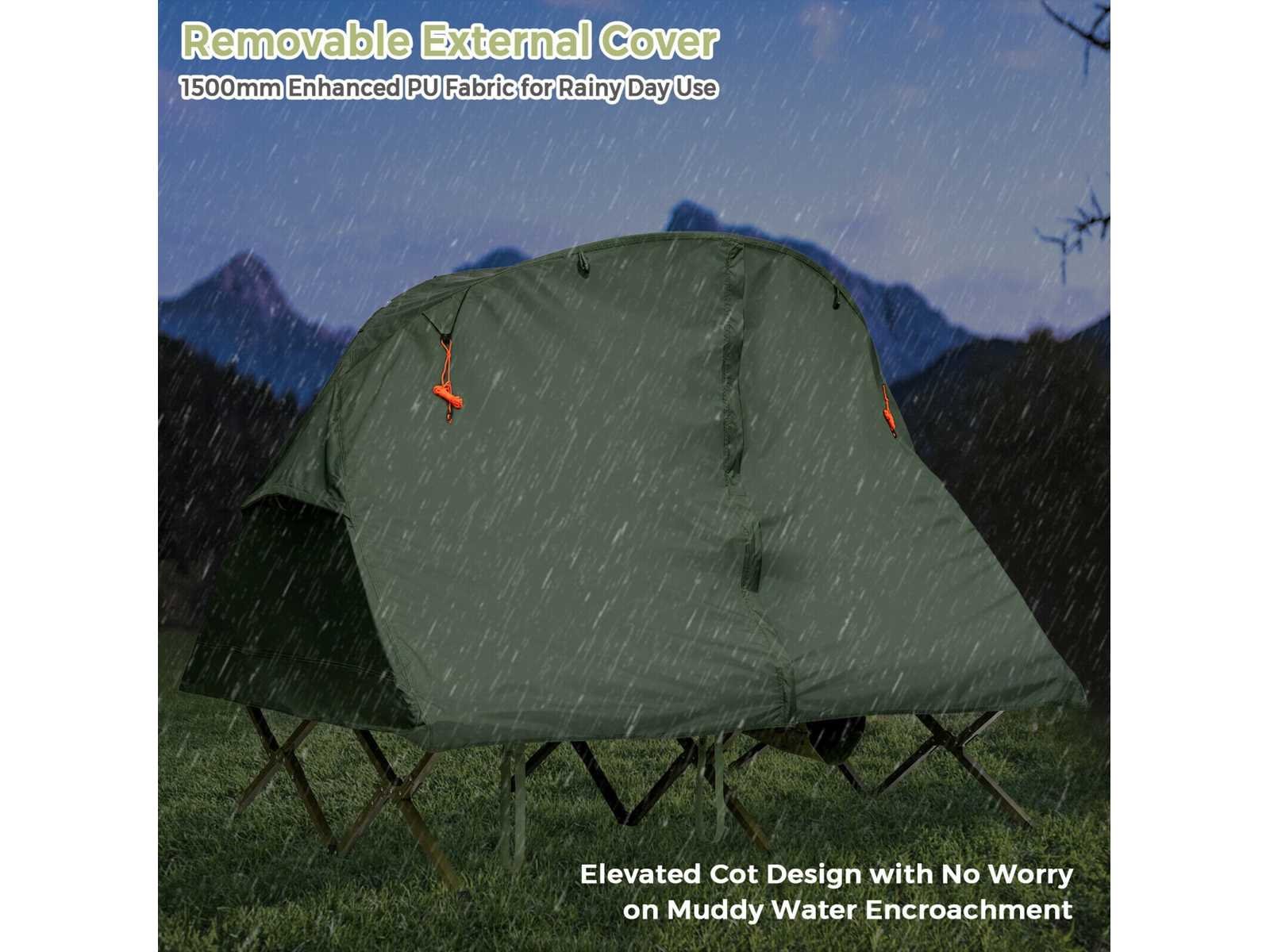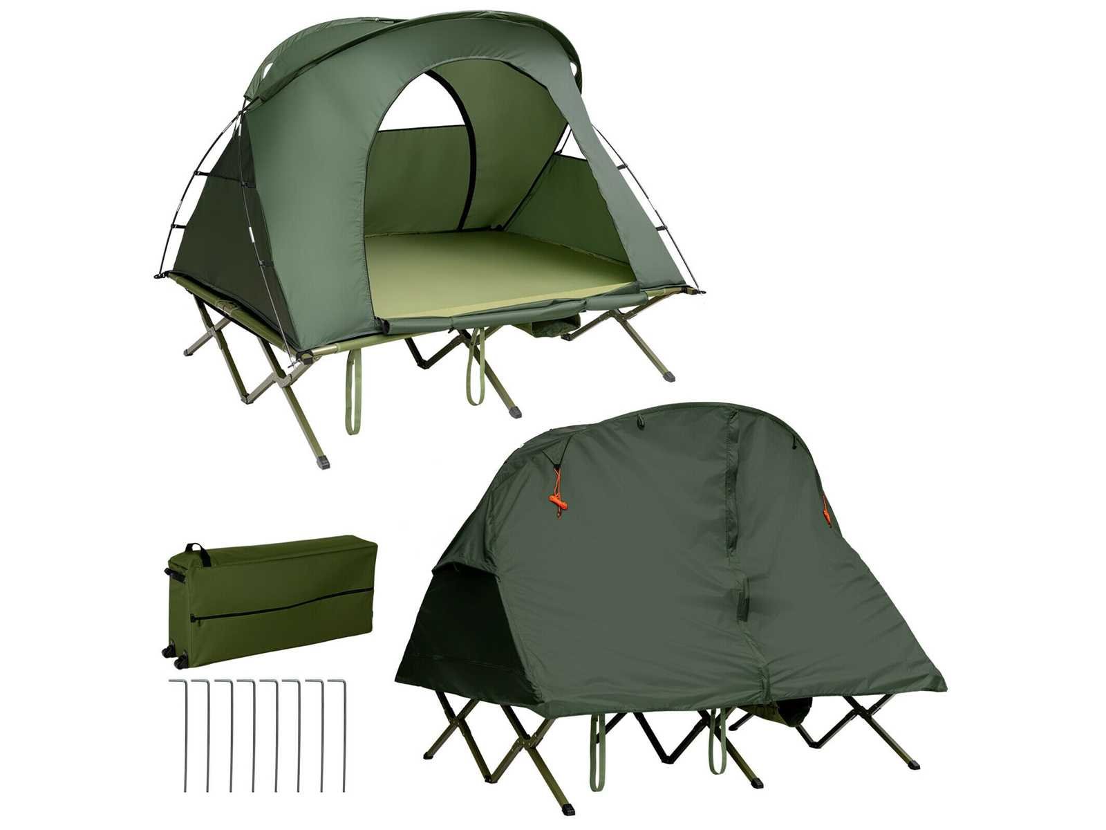 Geschikt voor zomer en winter: dankzij de luchtige gaasramen aan alle kanten van de tent geniet je van een aangename bries, zelfs bij nat weer. Daarnaast biedt een extra buitenhoes je dubbele bescherming tegen de kou. Op deze manier kun je comfortabel in de open lucht slapen zonder angst voor de kou. • Zelfopblazend matras: Draai het inblaasventiel tegen de klok in los, en dit matras blaast automatisch op binnen 5-8 minuten, wat je tijd en energie bespaart. Uitgerust met een kussen kun je comfortabel slapen zonder veel beddengoed mee te hoeven nemen. • Verhoogd kampbed met stevige structuur: Dit 2-zits kampeerbed met een versterkte metalen constructie biedt uitstekende duurzaamheid en stevigheid. Hij kan tot 300 kg dragen. Verhoogd biedt het je een veilige ruimte, beschermd tegen modderig water en insecten, ideaal voor je buitenactiviteiten. Extra bevestigingsriemen en metalen pennen zorgen voor betere windbestendigheid en stabiliteit. • Grote draagtas op wielen: Wordt geleverd met een grote draagtas, deze kit biedt opbergruimte voor alle accessoires. Je kunt het ook in de kofferbak van je auto plaatsen voor gemakkelijk transport en gemakkelijk in een hoek opbergen als het niet in gebruik is. Dankzij de extra wielen en handvatten is de tas moeiteloos te vervoeren. Daarnaast ondersteunt het een maximale belasting van 25 kg. • Voldoet aan al uw dagelijkse behoeften: Deze kampeertent-slaapset kan alleen of gecombineerd worden gebruikt. Op zichzelf gebruikt beschermt de aparte, waterdichte achtergrond van deze grote tent je tegen vocht van de grond en zorgt voor een droge, comfortabele ruimte. Daarnaast is er een binnenhaak speciaal ontworpen om een lamp op te hangen, en een schoenenzak onderaan de set maakt het opbergen eenvoudig. Non