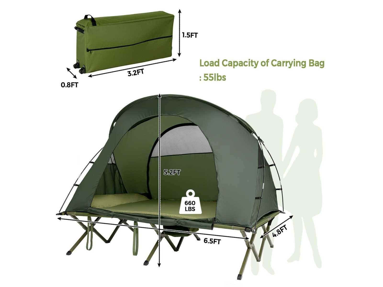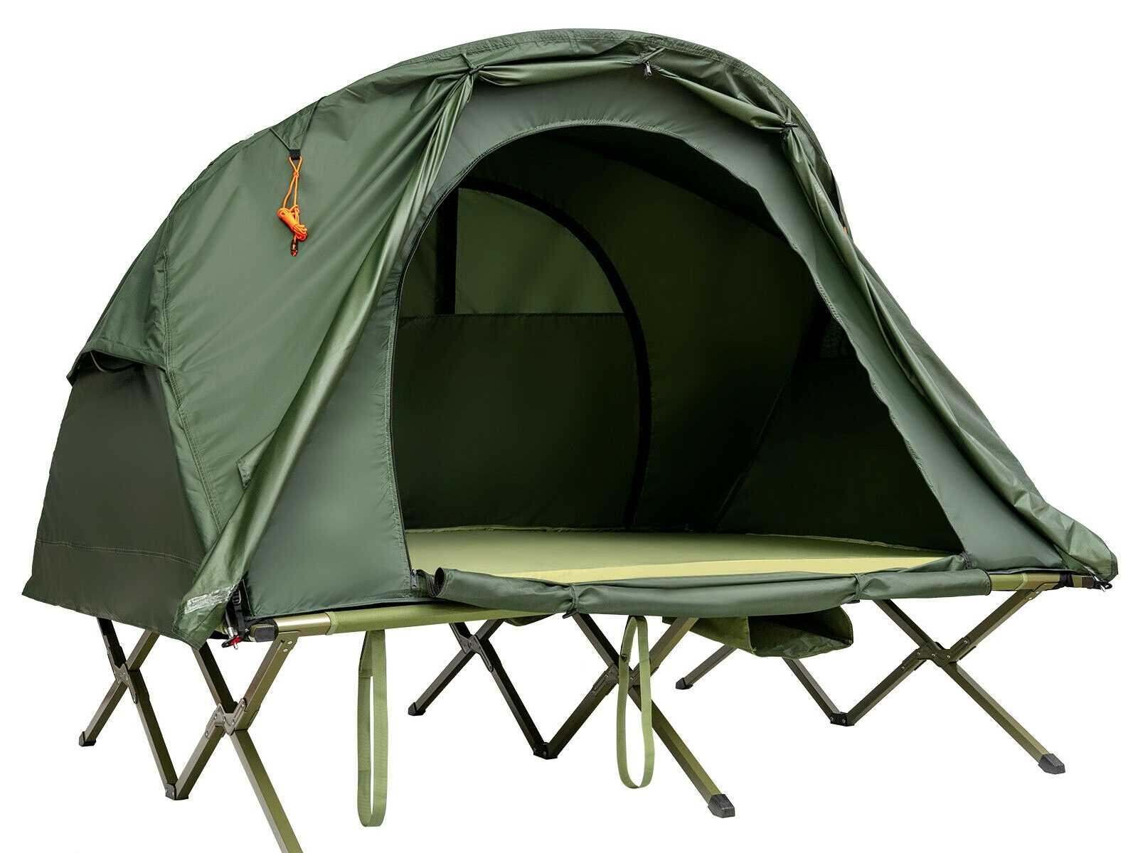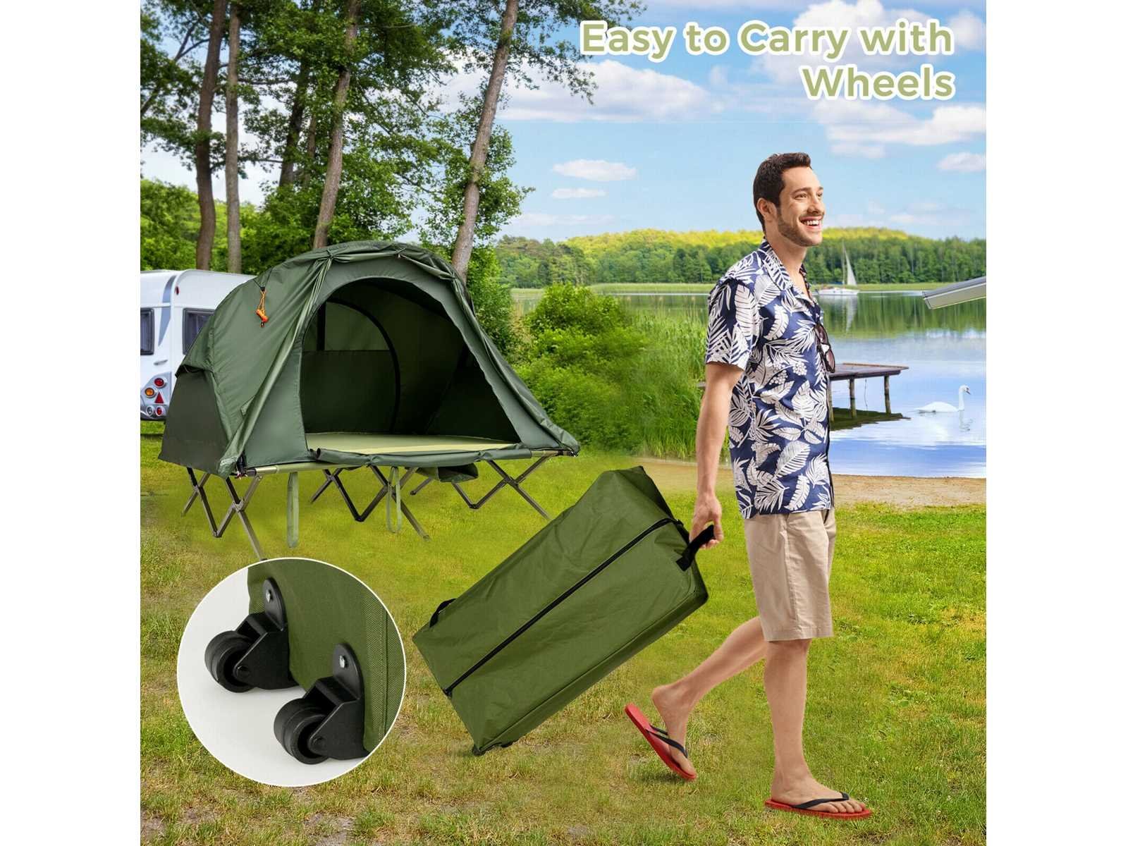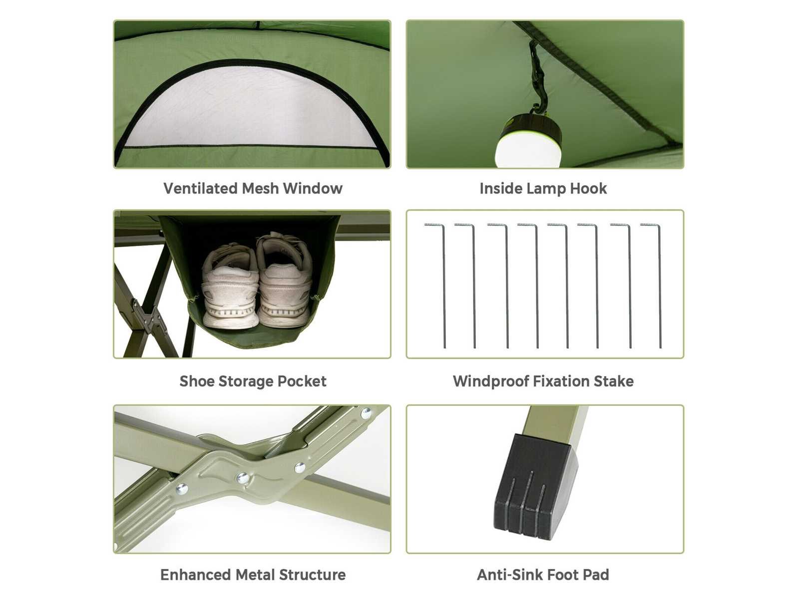 Geschikt voor zomer en winter: dankzij de luchtige gaasramen aan alle kanten van de tent geniet je van een aangename bries, zelfs bij nat weer. Daarnaast biedt een extra buitenhoes je dubbele bescherming tegen de kou. Op deze manier kun je comfortabel in de open lucht slapen zonder angst voor de kou. • Zelfopblazend matras: Draai het inblaasventiel tegen de klok in los, en dit matras blaast automatisch op binnen 5-8 minuten, wat je tijd en energie bespaart. Uitgerust met een kussen kun je comfortabel slapen zonder veel beddengoed mee te hoeven nemen. • Verhoogd kampbed met stevige structuur: Dit 2-zits kampeerbed met een versterkte metalen constructie biedt uitstekende duurzaamheid en stevigheid. Hij kan tot 300 kg dragen. Verhoogd biedt het je een veilige ruimte, beschermd tegen modderig water en insecten, ideaal voor je buitenactiviteiten. Extra bevestigingsriemen en metalen pennen zorgen voor betere windbestendigheid en stabiliteit. • Grote draagtas op wielen: Wordt geleverd met een grote draagtas, deze kit biedt opbergruimte voor alle accessoires. Je kunt het ook in de kofferbak van je auto plaatsen voor gemakkelijk transport en gemakkelijk in een hoek opbergen als het niet in gebruik is. Dankzij de extra wielen en handvatten is de tas moeiteloos te vervoeren. Daarnaast ondersteunt het een maximale belasting van 25 kg. • Voldoet aan al uw dagelijkse behoeften: Deze kampeertent-slaapset kan alleen of gecombineerd worden gebruikt. Op zichzelf gebruikt beschermt de aparte, waterdichte achtergrond van deze grote tent je tegen vocht van de grond en zorgt voor een droge, comfortabele ruimte. Daarnaast is er een binnenhaak speciaal ontworpen om een lamp op te hangen, en een schoenenzak onderaan de set maakt het opbergen eenvoudig. Non