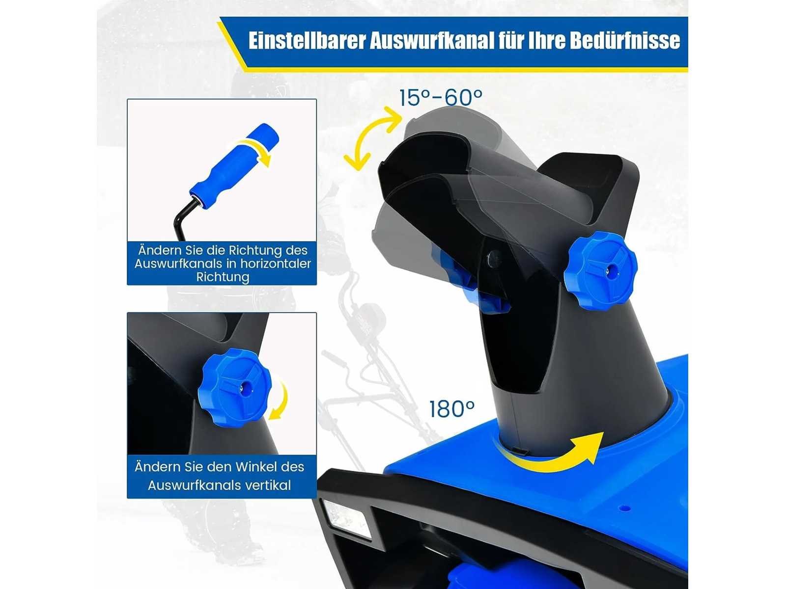 Technische kenmerken: Kleur: blauw en zwart Materialen: PP, metaal, HDPE, koper, rubber Totale afmetingen: 118 x 51 x 96 cm (L x B x H) Schraapdiepte: 250 mm Schraapbreedte: 500 mm Kabellengte: 35 cm Wormdiameter: 17 cm Wieldiameter: 18 cm Maximale uitwerpafstand: 9 m Sneeuwafvoerhoek: 15°-60 Nominale spanning: 120 V Nominale stroom: 15 AMPÈRE Motorvermogen: 2300 W Laadvrije snelheid: 3.000 tpm Netto gewicht: 13,5 kg Non