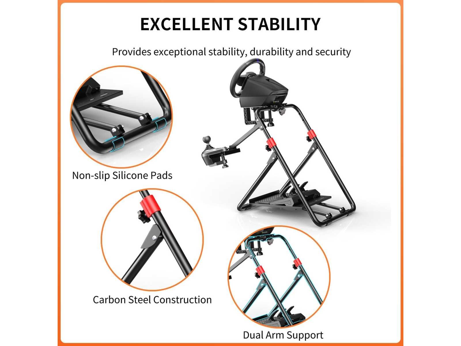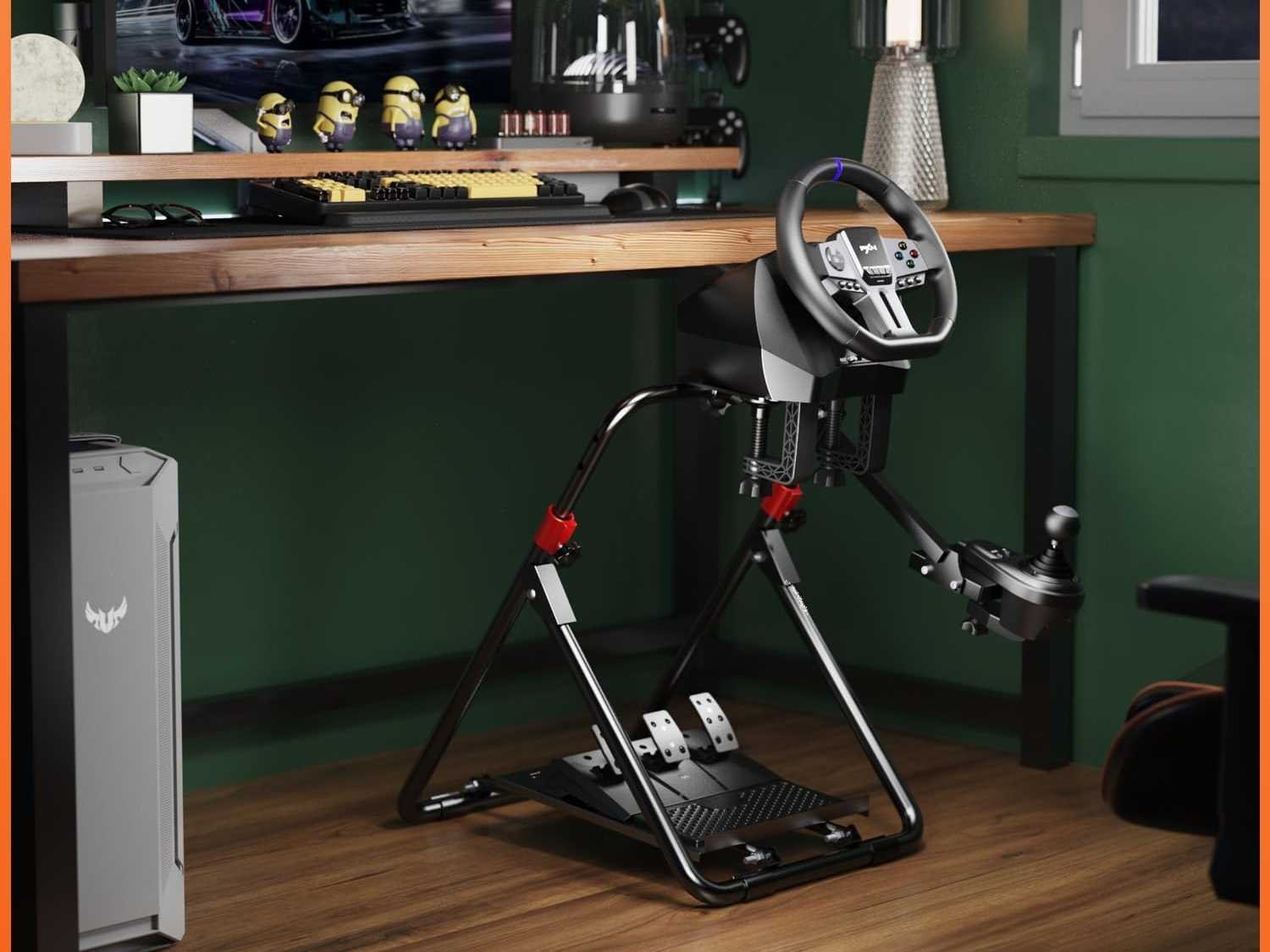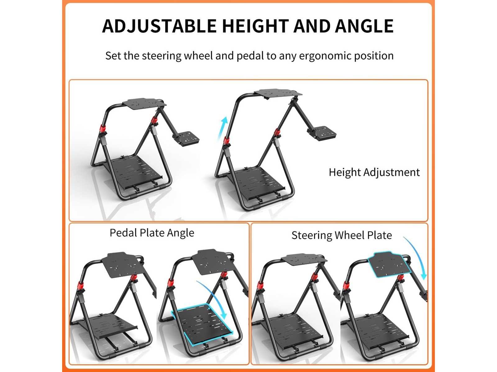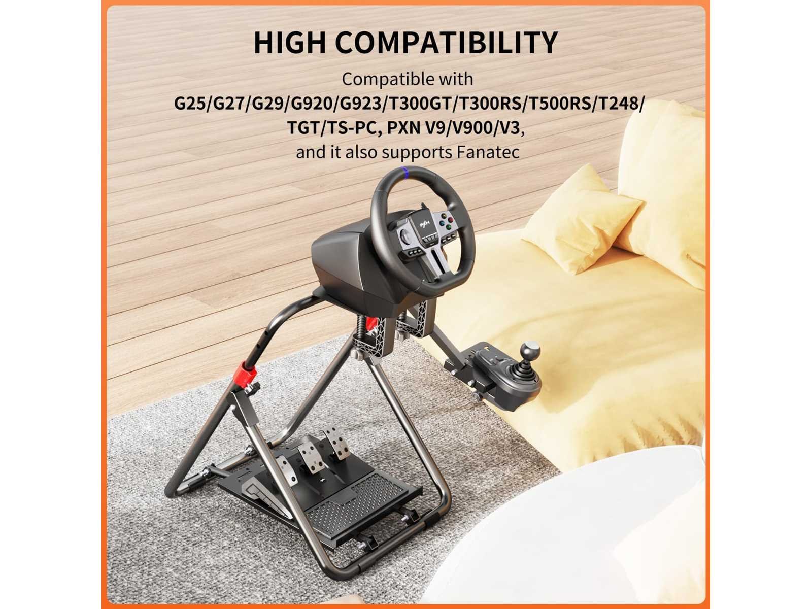Opvouwbare stuurwielstandaard: De PXN-A9 stuurwielstandaard is een stevige en veelzijdige standaard die speciaal is ontworpen voor liefhebbers van racesimulaties. Hij is ontworpen om verschillende populaire racewielen te ondersteunen en biedt een stevige en verstelbare racesimulatorcabine (stoel en stuurwiel niet inbegrepen). De PXN-A9 is een uitstekende keuze voor gamers die op zoek zijn naar een betrouwbare en verstelbare standaard om hun simrace-ervaring te verbeteren. Brede compatibiliteit: Compatibel met PXN V3 PRO, V900, V9, V9 GEN2, V99, V10 racewielen. Compatibel met Logitech G25, G27, G29, G920, G923 racewielen. Compatibel met Thrustmaster T248, T300GT, T300RS, T500RS, TGT, TS-PC racewielen. Ondersteunt ook racewielen van andere merken. Instelbare hoogte en hoek: De PXN-A9 stuurstandaard maakt het mogelijk om de hoogte, hoek en positie van de versnellingspook aan te passen, waardoor gamers de ideale rijhouding aannemen en het comfort maximaliseren. De hoogte kan worden aangepast dankzij een telescopisch ontwerp, dat tot 36 cm kan reiken. De stuurwielbevestigingsplaat kan kantelen voor optimale besturing, en de pedaalplaat kan worden versteld tussen 0 en 45 graden. De versnellingshebelbeugel kan aan beide zijden worden geplaatst. Eenvoudig in elkaar te zetten en op te vouwen: De PXN-A9 stuurwielstandaard is ontworpen om eenvoudig in elkaar te zetten, zodat gebruikers de standaard snel kunnen monteren, afstellen en vouwen voor gebruik. Het kan worden opgevouwen zonder ingewikkelde demontage, waardoor het gemakkelijk is om te verplaatsen en op te bergen. Deze functie is vooral handig voor gebruikers die de ruimte willen optimaliseren of de standaard vaak verplaatsen. Let op: Zorg dat de standaard correct is gemonteerd en uitgevouwen voor gebruik. Non