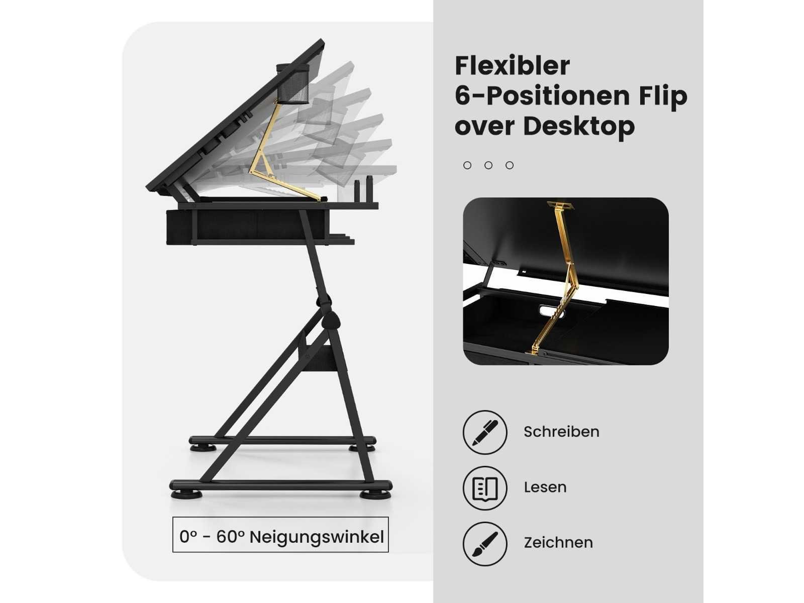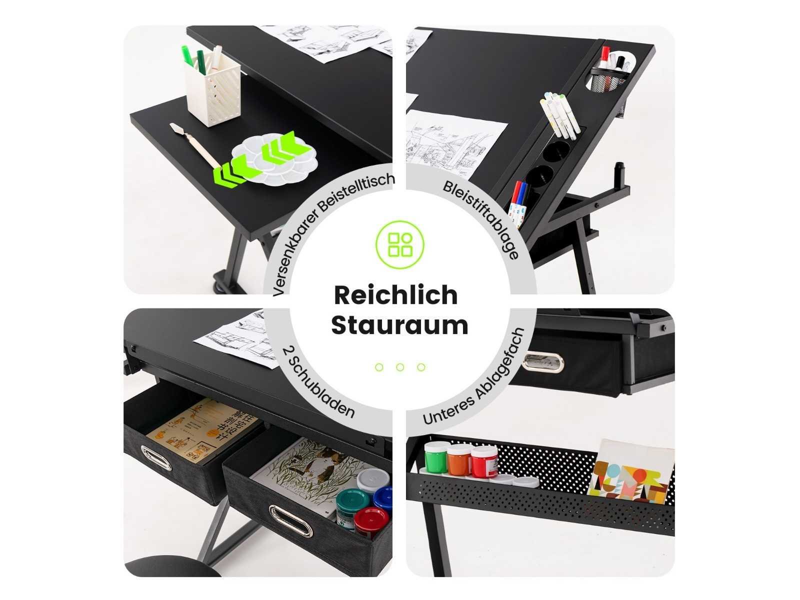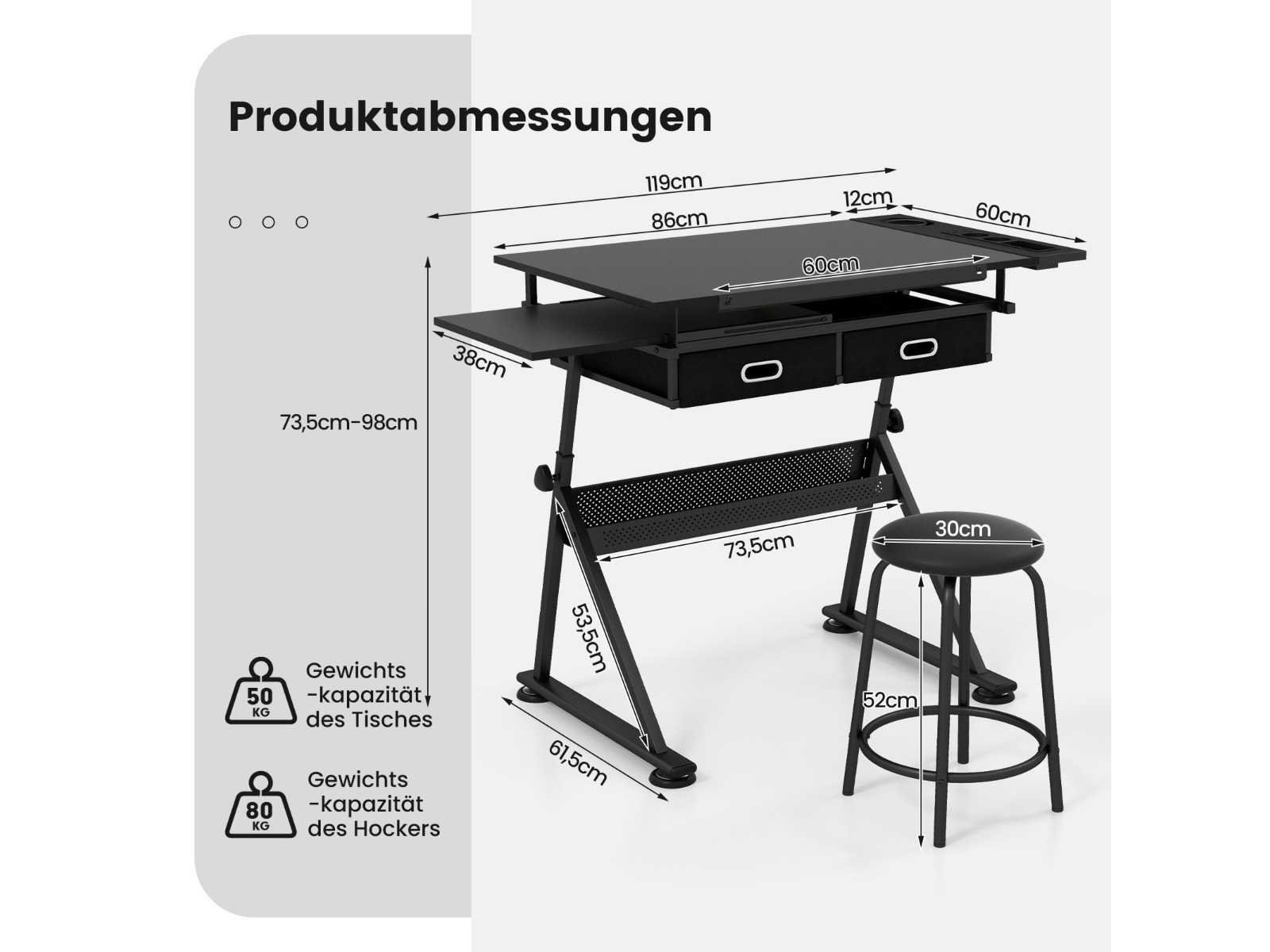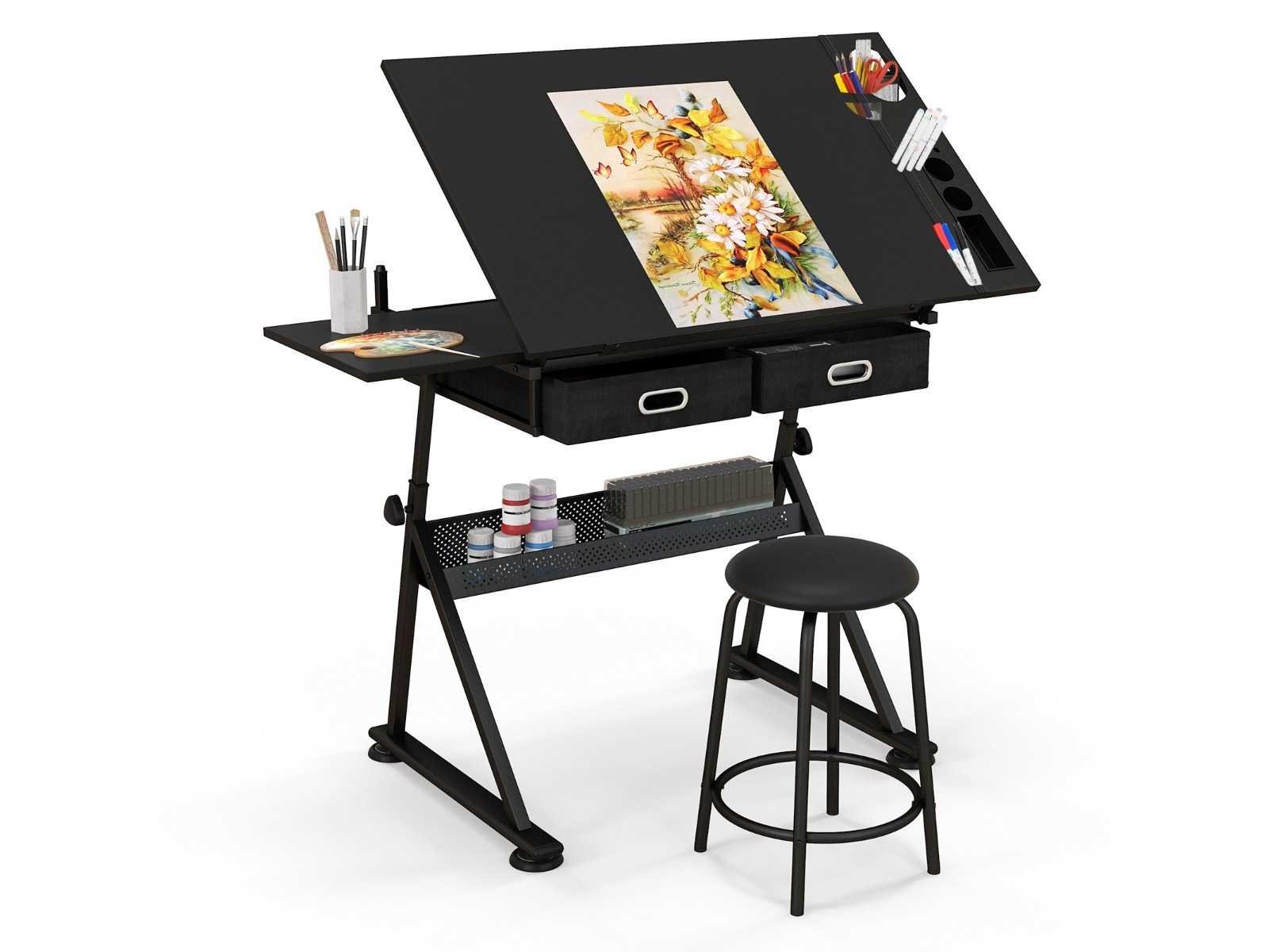 Kenmerken: Afmetingen: 119 x 61,5 x (73,5-98) cm (L x B x H) Verstelbare hoogte voor optimaal comfort tijdens gebruik Eenvoudige hoekcontrole met 6-hoeken kantelmogelijkheid van 0 tot 60°. Metalen potloodstang om te voorkomen dat gereedschap eruit valt Afneembaar zijvak met aparte vakken Twee praktische stoffen lades en een metalen doos voor schetsen of schilderijen. Wordt geleverd met een stoel met een metalen structuur en zwarte polyurethaan bekleding. Het bureaublad kan tot 50 kg dragen, de stoel tot 80 kg. Dit bureau, gemaakt van MDF, is waterdicht en duurzaam, wat comfort en organisatie biedt op de werkvloer. Non