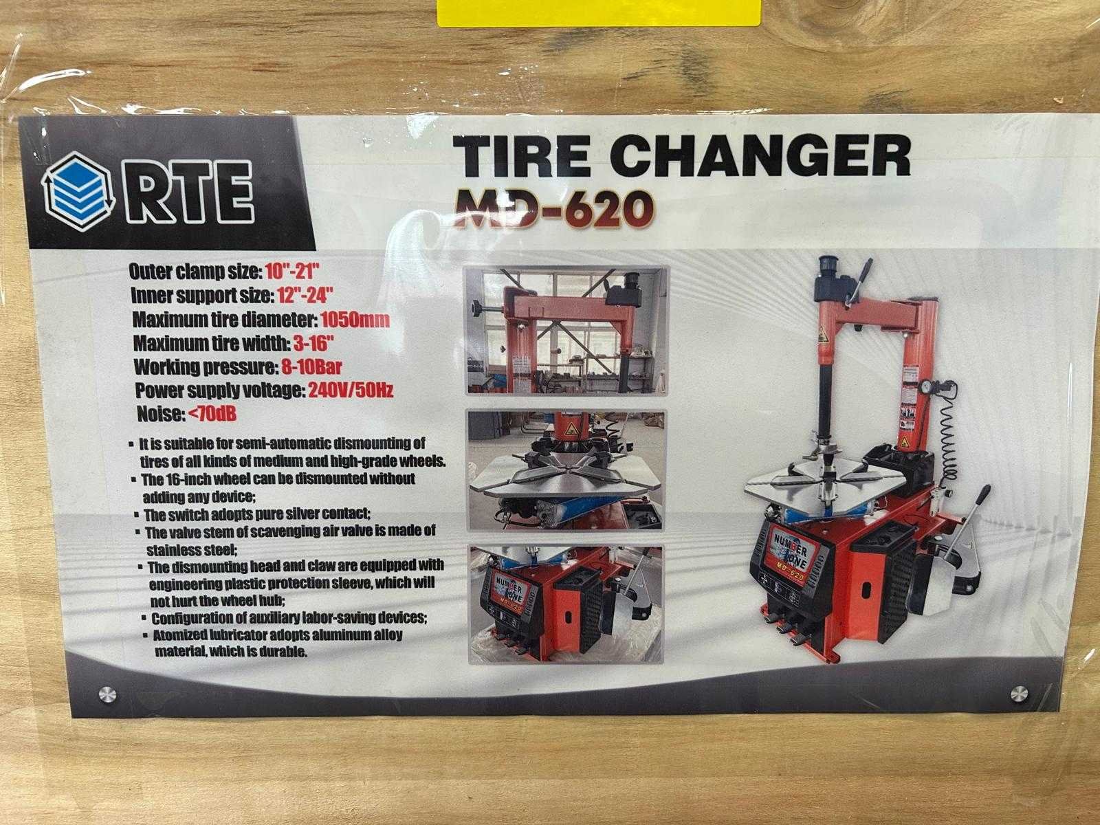 Ongebruikt; in transportkrat; outerclamp 10'' till 21''; inner support size 12'' till 24''; maximum tire diameter 1050mm; maximum tire width 3'' till 16''; working pressure 8-10 Bar; bouwpakket; 8122 Nee Merk: RTE Type: MD-620 Bouwjaar: 2025 Aansluiting: 230V
