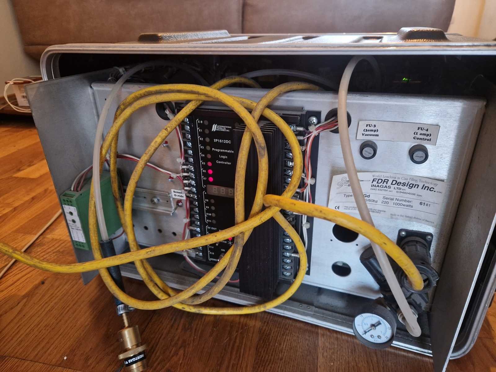 Machine de remplissage de gaz FDR RSGd, conçue pour l'industrie du verre isolant. Elle est utilisée pour remplir l'espace entre les vitres de fenêtres avec des gaz comme l'argon ou le krypton afin d'améliorer l'isolation thermique. No Merk: FDR Design