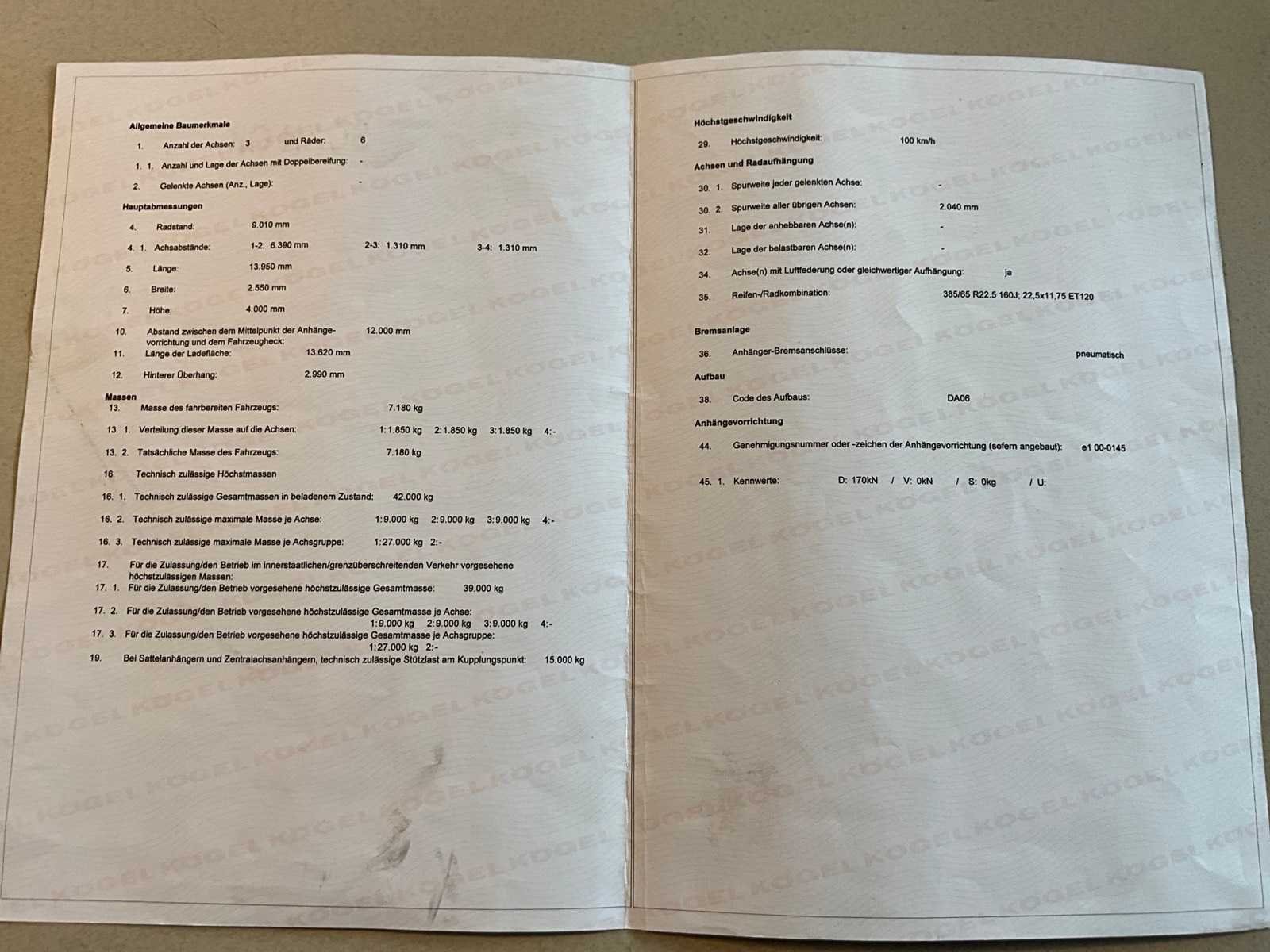 Voorzien van WABCO SmartBoard, liftas, pneumatische ophanging, steunpoten JOST Modul B0402, reserveband. Bandenmaat: 385/65 R22.5. Profieldiepte banden: 13,65mm, 5,39mm, 12,91mm, 12,56mm, 6,97mm, 13,02mm. Aanwezige documenten: Kentekenbewijs deel I, Kentekenbewijs deel II, Identificatieverslag, Gelijkvormigheidsattest, Keuringsbewijs, TÜV Nord certificaat. Nee Merk: KÖGEL Type: SN 24 Type aanhangwagencarrosserie: Schuifzeilaanhangwagen Bouwjaar: 2019 Chassisnummer VIN: WK0S0002400241729 Datum eerste toelating: 1/4/2019 APK vervaldatum: 17/4/2026 Aantal assen: 3 Laadvermogen: 34820kg Eigen gewicht: 7180kg Totale afmeting L: 13950mm Totale afmeting Breedte: 2550mm Totale afmeting Hoogte: 4000mm