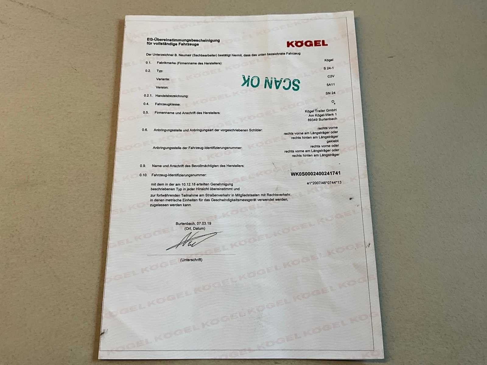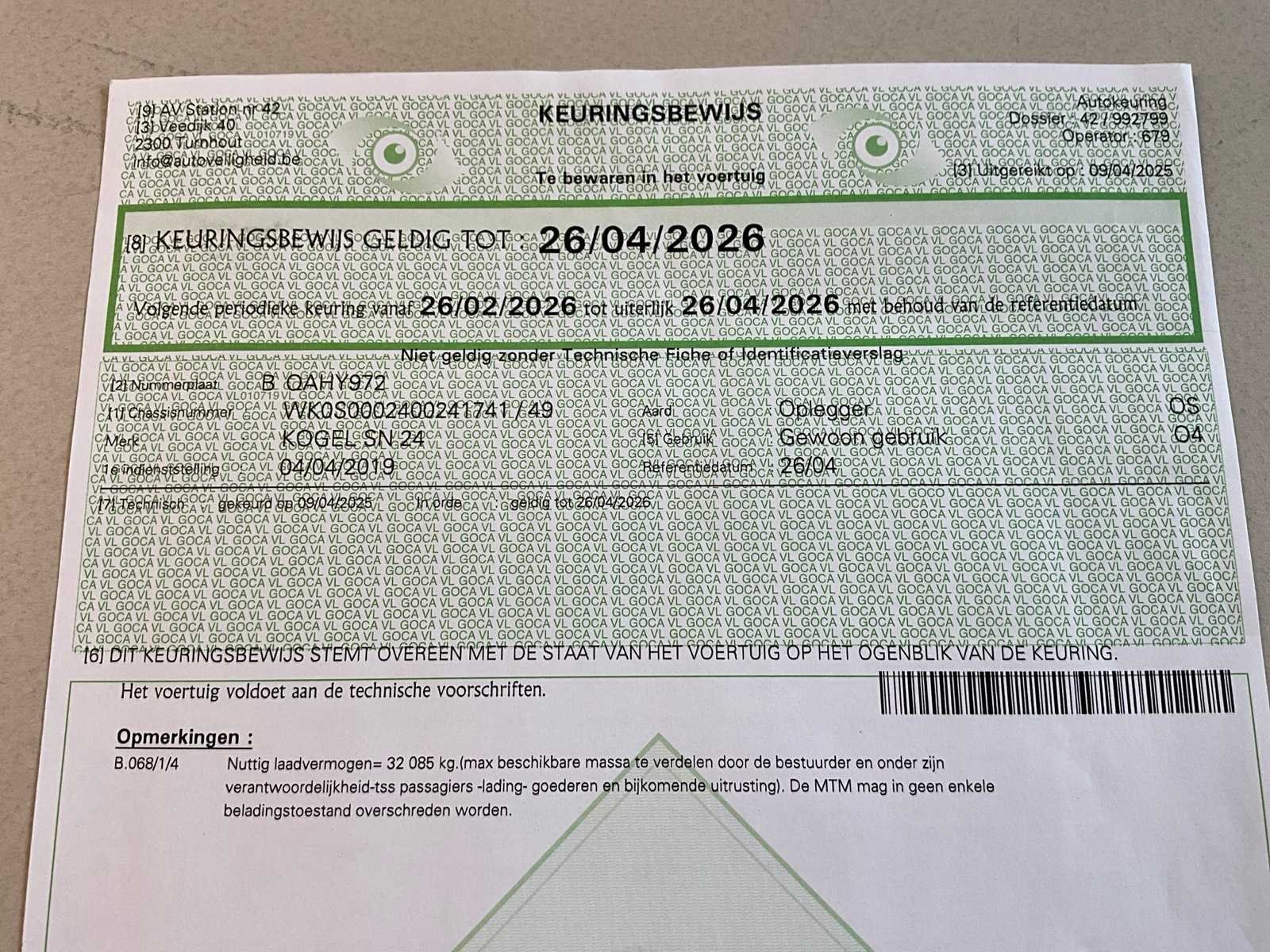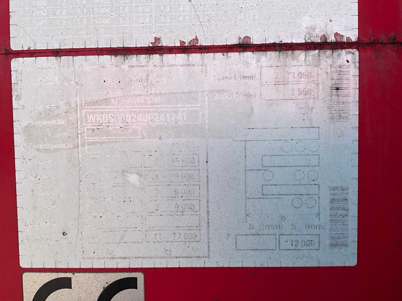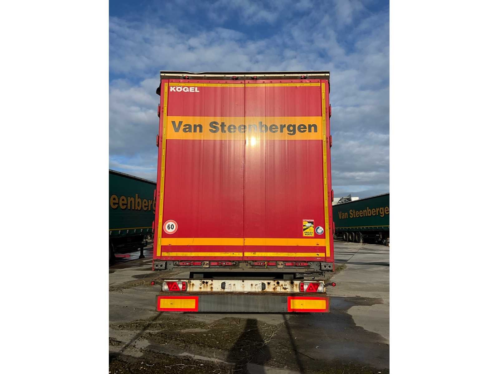 Voorzien van WABCO SmartBoard, liftas, pneumatische ophanging, steunpoten JOST Modul B0402, reserveband. Bandenmaat: 385/65 R22.5. Profieldiepte banden: 7,36mm, 9,78mm, 13,27mm, 13,85mm, 9,1mm, 6,98mm. Aanwezige documenten: Kentekenbewijs deel I, Kentekenbewijs deel II, Identificatieverslag, Gelijkvormigheidsattest, Keuringsbewijs, TÜV Nord certificaat. Nee Merk: KÖGEL Type: SN 24 Type aanhangwagencarrosserie: Schuifzeilaanhangwagen Bouwjaar: 2019 Chassisnummer VIN: WK0S0002400241741 Datum eerste toelating: 1/4/2019 APK vervaldatum: 26/4/2026 Aantal assen: 3 Laadvermogen: 34820kg Eigen gewicht: 7180kg Totale afmeting L: 13950mm Totale afmeting Breedte: 2550mm Totale afmeting Hoogte: 4000mm