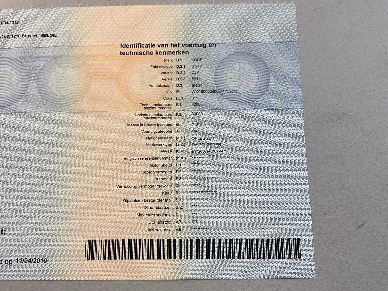 Voorzien van WABCO SmartBoard, liftas, pneumatische ophanging, steunpoten JOST Modul B0402. Bandenmaat: 385/65 R22.5. Profieldiepte banden: 6,26mm, 7,62mm, 13,33mm, 13,06mm, 7,58mm, 6,2mm. Aanwezige documenten: Kentekenbewijs deel I, Kentekenbewijs deel II, Identificatieverslag, Gelijkvormigheidsattest, Keuringsbewijs, TÜV Nord certificaat. Nee Merk: KÖGEL Type: SN 24 Type aanhangwagencarrosserie: Schuifzeilaanhangwagen Bouwjaar: 2019 Chassisnummer VIN: WK0S0002400241759 Datum eerste toelating: 8/4/2019 APK vervaldatum: 17/4/2026 Aantal assen: 3 Laadvermogen: 34820kg Eigen gewicht: 7180kg Totale afmeting L: 13950mm Totale afmeting Breedte: 2550mm Totale afmeting Hoogte: 4000mm