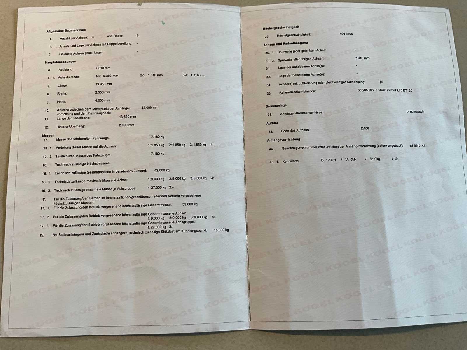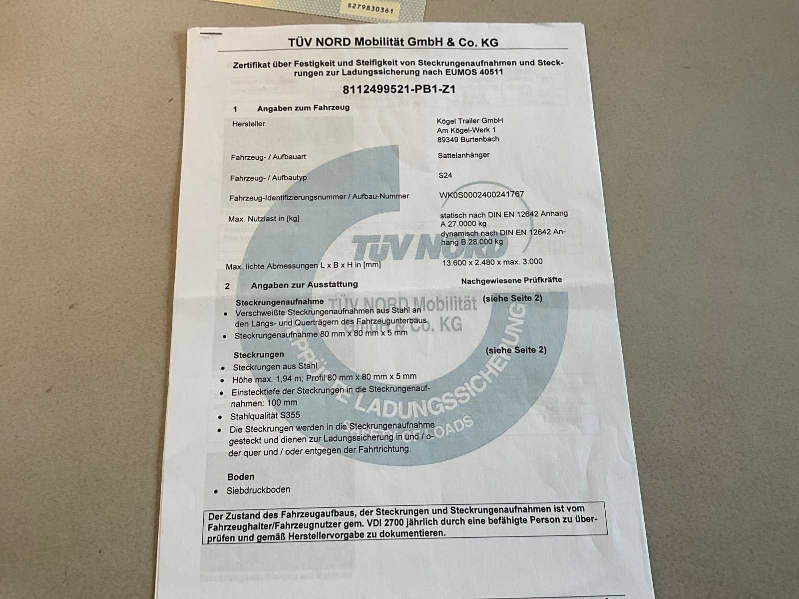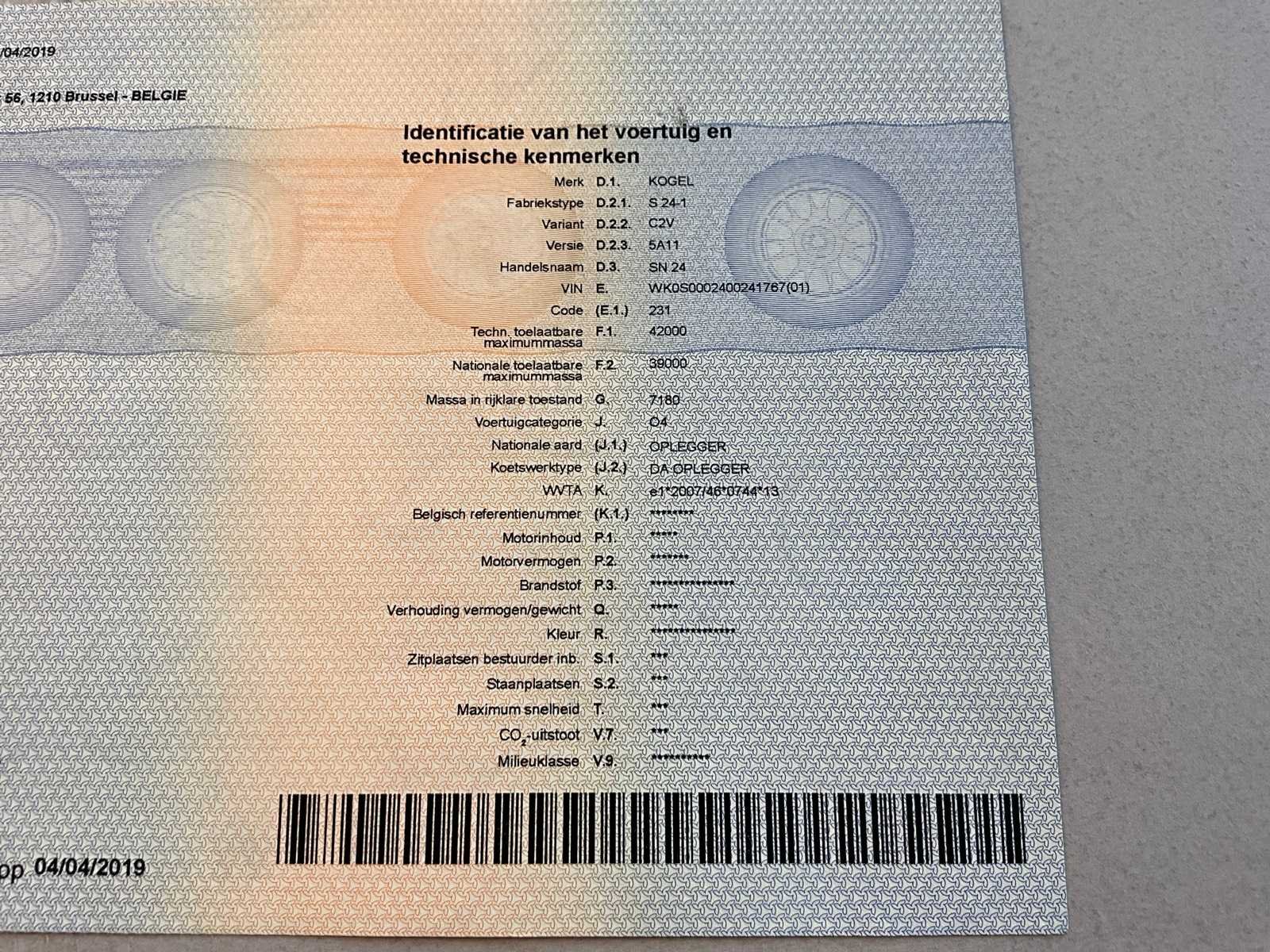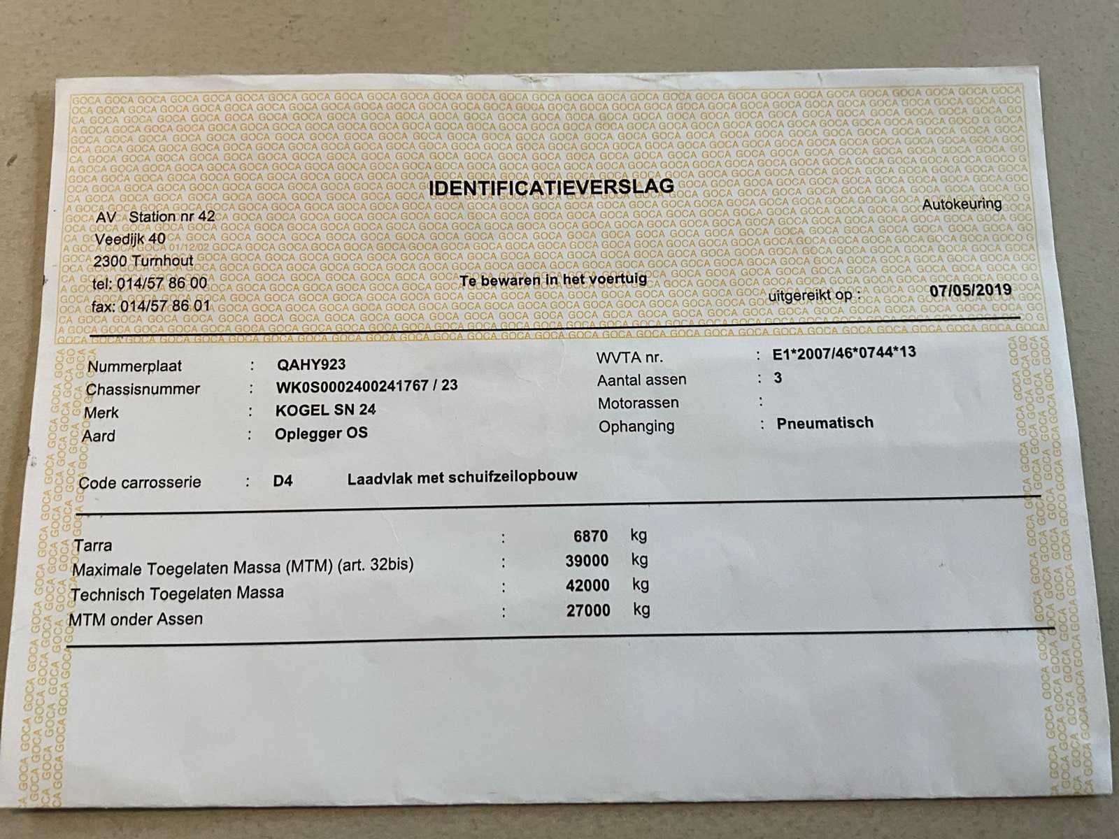 Voorzien van WABCO SmartBoard, liftas, pneumatische ophanging, steunpoten JOST Modul B0402, reserveband. Bandenmaat: 385/65 R22.5. Profieldiepte banden: 13,32mm, 6,84mm, 13,27mm, 13,05mm, 7,84mm, 13,27mm. Aanwezige documenten: Kentekenbewijs deel I, Kentekenbewijs deel II, Identificatieverslag, Gelijkvormigheidsattest, Keuringsbewijs, TÜV Nord certificaat. Nee Merk: KÖGEL Type: SN 24 Type aanhangwagencarrosserie: Schuifzeilaanhangwagen Bouwjaar: 2019 Chassisnummer VIN: WK0S0002400241767 Datum eerste toelating: 8/4/2019 APK vervaldatum: 7/5/2026 Aantal assen: 3 Laadvermogen: 34820kg Eigen gewicht: 7180kg Totale afmeting L: 13950mm Totale afmeting Breedte: 2550mm Totale afmeting Hoogte: 4000mm