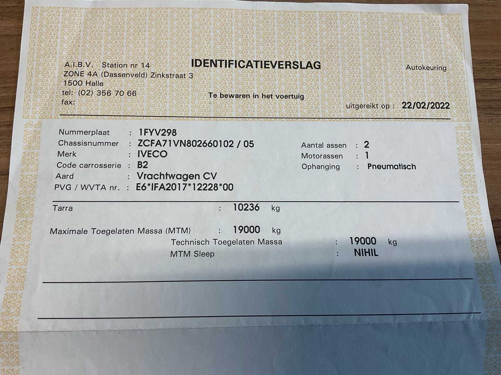 Vrachtwagen start en rijdt Frigo in werkende staat alsook hydraulisch laadplatform No Merk: IVECO Type: IG190EL2CA Bouwjaar: 2017 Chassisnummer VIN: ZCFA71VN802660102 Cilinderinhoud: 6728cc Kilometerstand bij opname: 363582km Datum eerste toelating: 04/04/2017 Type transmissie: Automatisch Aantal assen: 2 Fuel Type: Diesel Laadvermogen: 19000kg Aantal sleutels: 4 Emissieklasse: Euro VI Hydraulische laadklep: true Gesloten opbouw: true Eigen gewicht: 10236kg Totale afmeting L: 8450mm Totale afmeting Breedte: 2600mm Totale afmeting Hoogte: 3710mm Startinformatie: Start en rijdt Nationaliteit documenten: Belgi¨ë Kentekenpapieren compleet?: true Aantal zitplaatsen: 2 Automaat: true Diesel: true