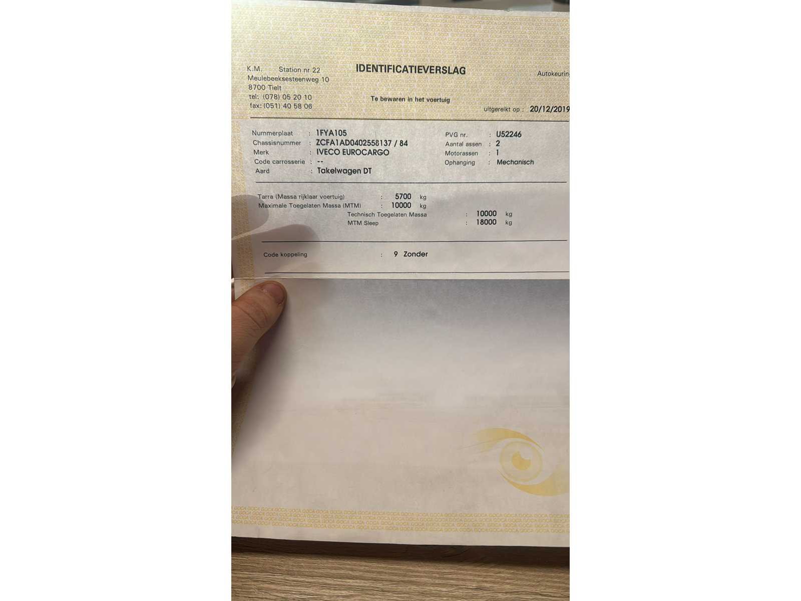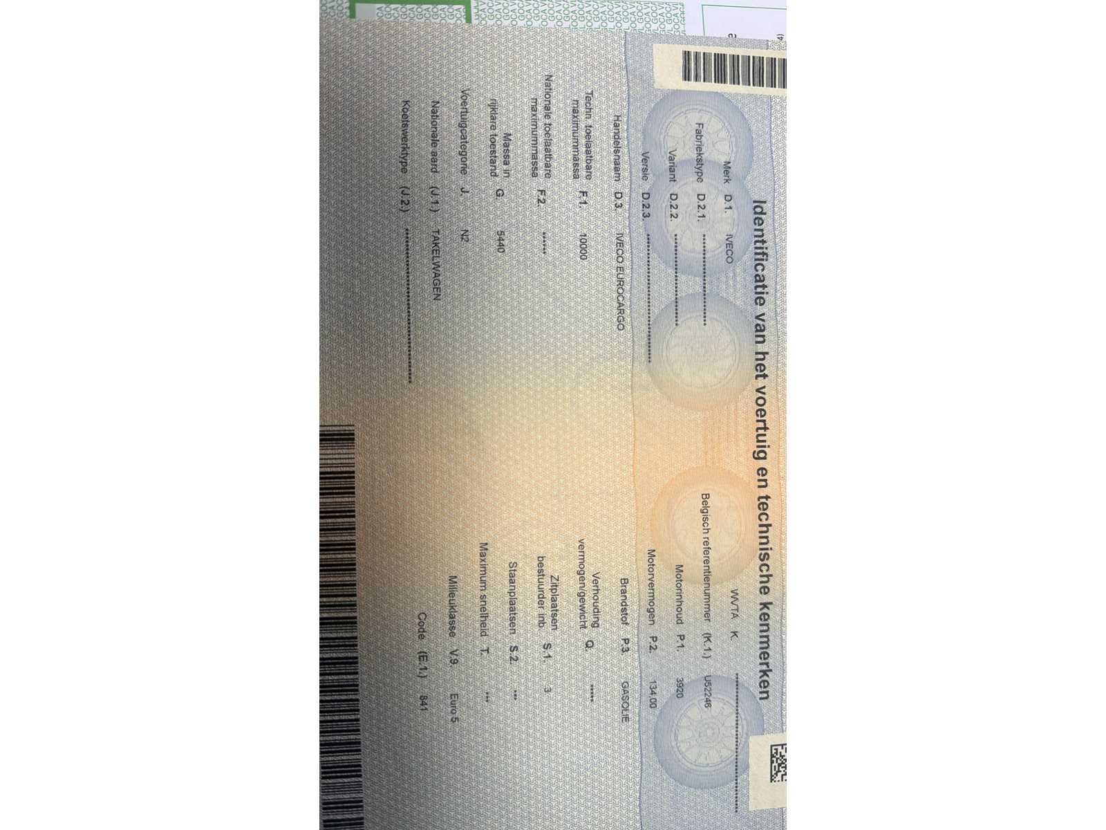 Alles in werkende staat. Nee Merk: Iveco Type: Eurocargo Bouwjaar: 2009 Chassisnummer VIN: ZCFA1AD0402558137 Cilinderinhoud: 3920cc Kilometerstand bij opname: 300155km Datum eerste toelating: 12/11/2009 Fuel Type: Diesel Aantal sleutels: 2 Emissieklasse: Euro 5 Startinformatie: Start en rijdt Nationaliteit documenten: Belgisch